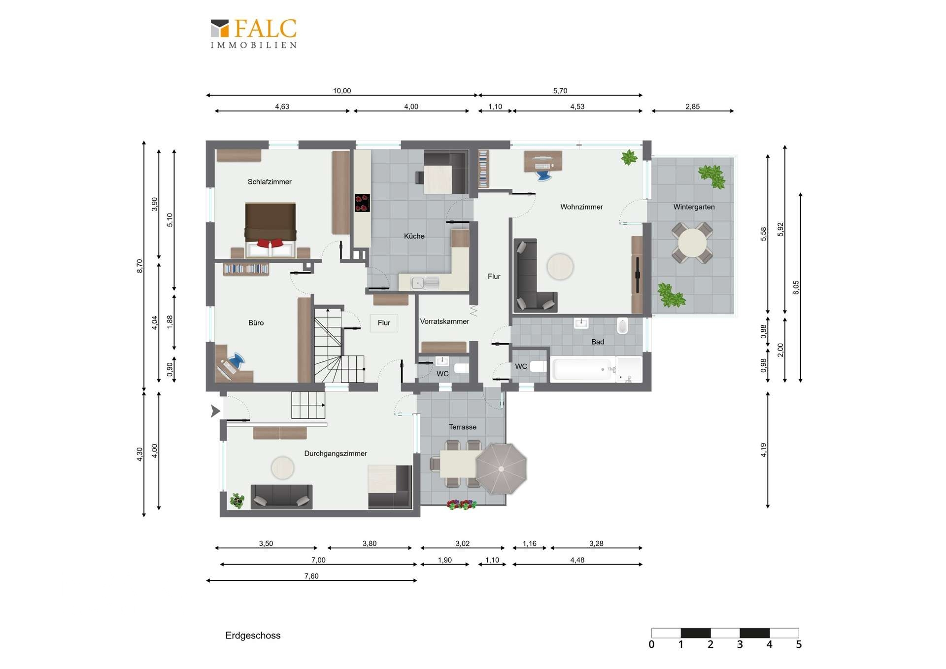 Der Garten sowie einen nach Südwesten ausgerichteten Wintergarten und eine große Dachterrasse laden zum Verweilen und Erholen ein.