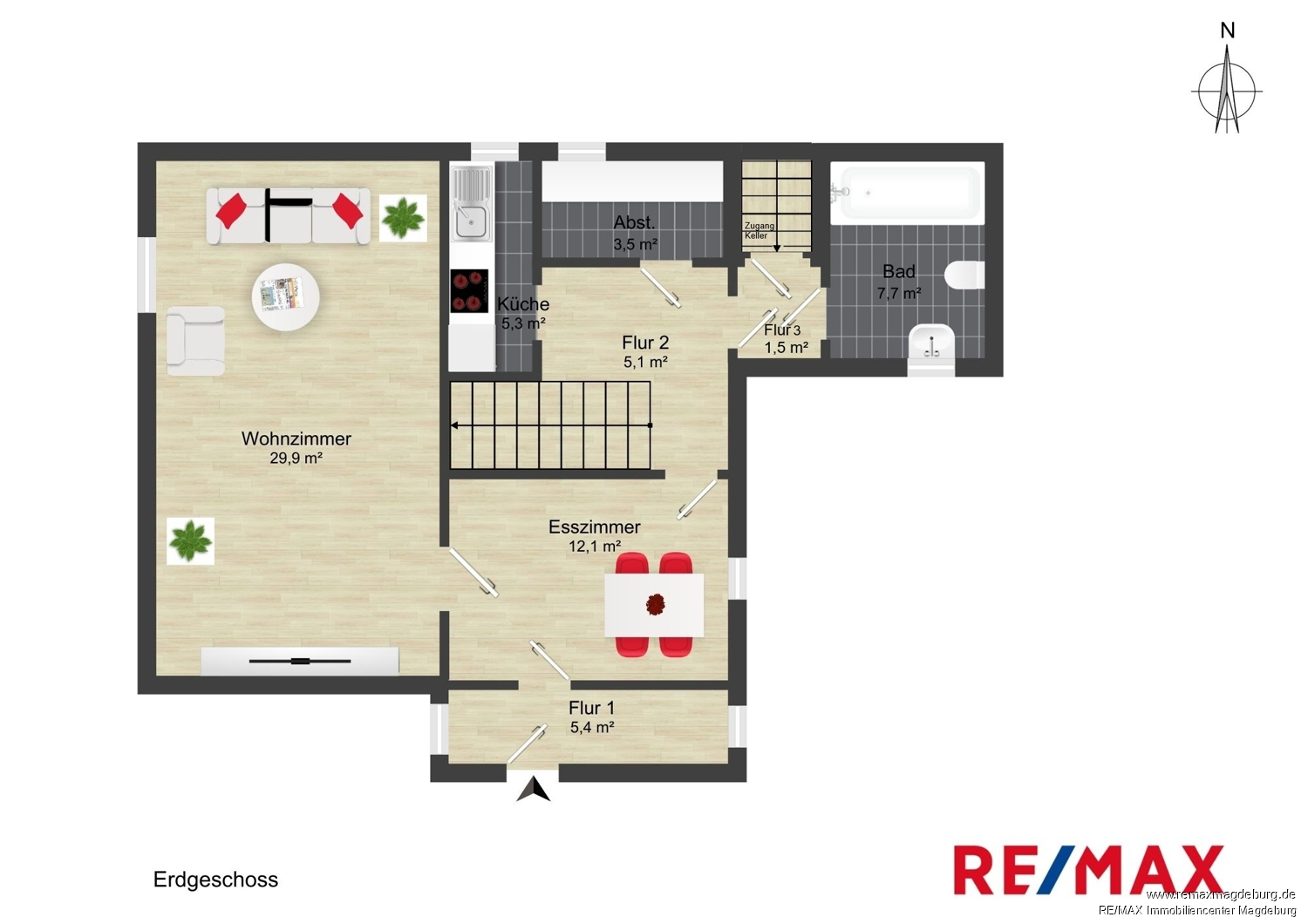 Erdgeschoss: - Flur 1, - Esszimmer mit Kamin, - Wohnzimmer, - Flur2, - Küche mit Einbauküche, - Abstellraum, - Flur3, - Tageslichtbad mit Dusche und Badewanne,