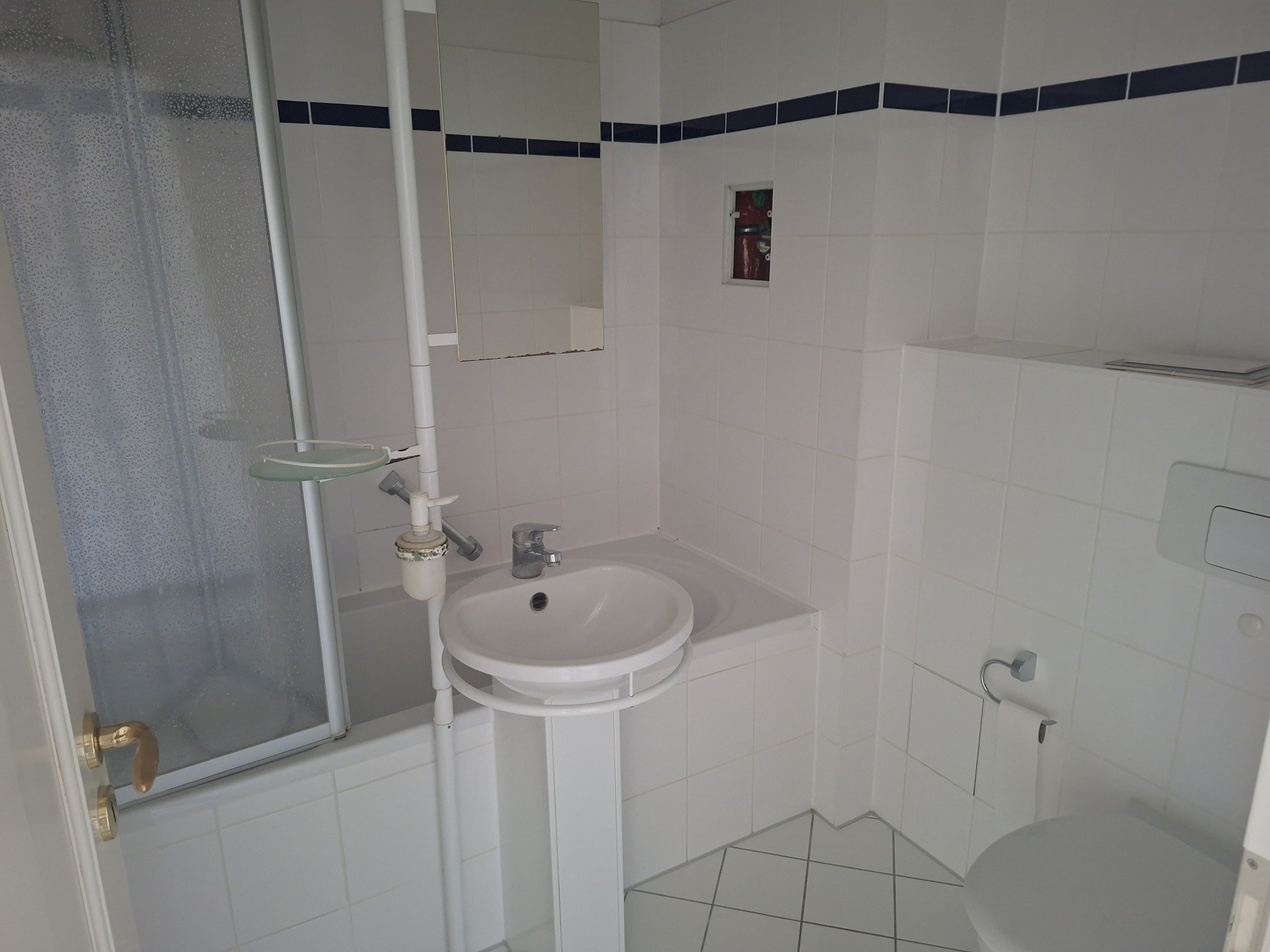 Das inliegende Bad verfügt über eine Wanne mit Duschabtrennung, WC. Waschbecken und einen Handtuchheizkörper.