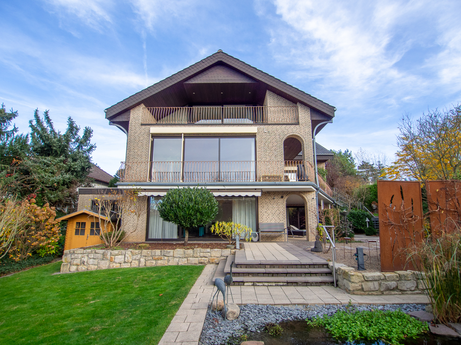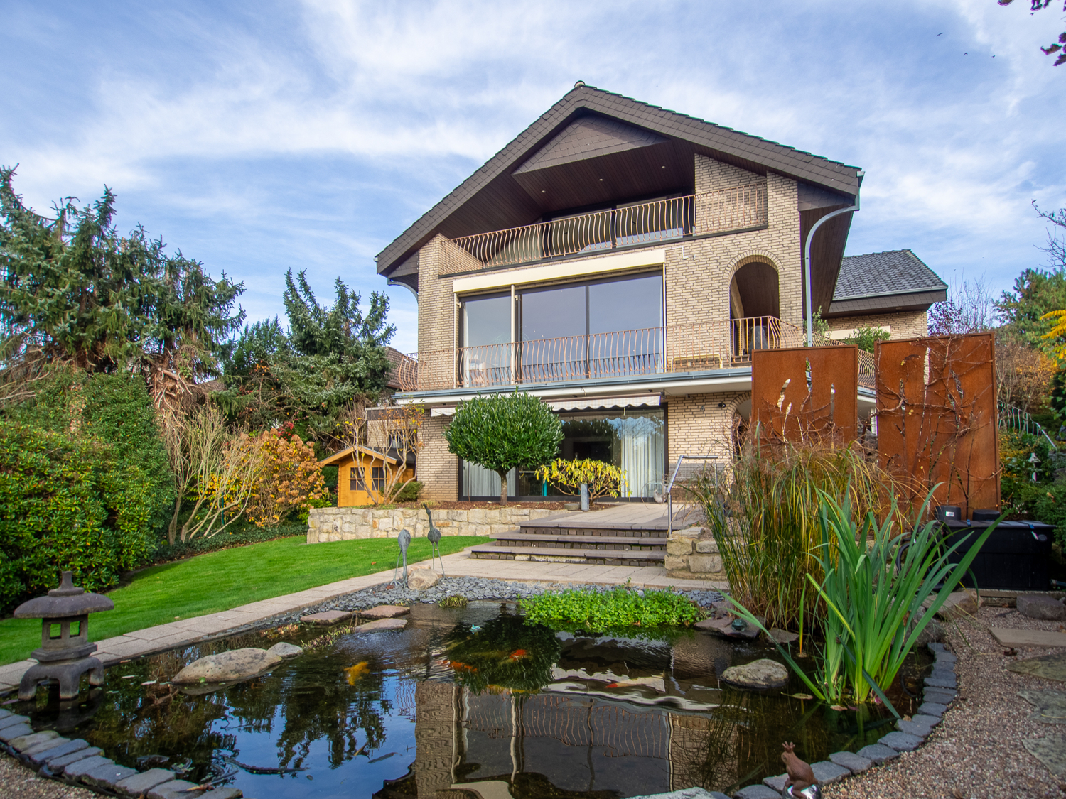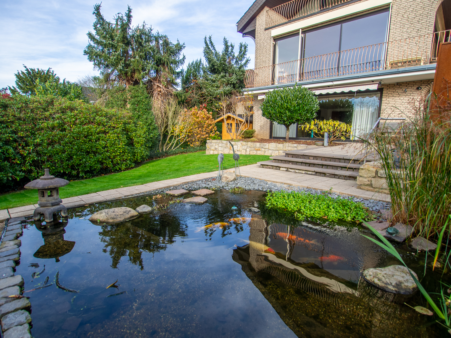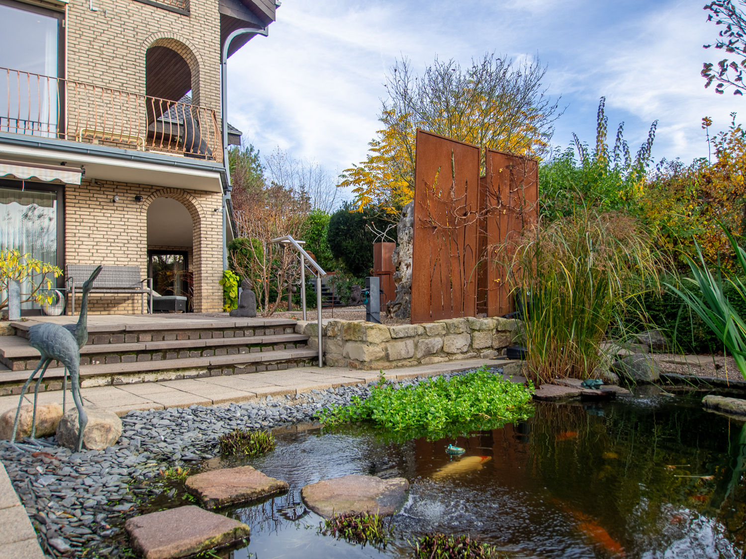 Die Gartenanlage ist ein echtes Highlight: sorgfältig gestaltet mit verschiedenen Ebenen, einem Teich und geschützten Rückzugsbereichen zum Entspannen, Genießen und Leben.