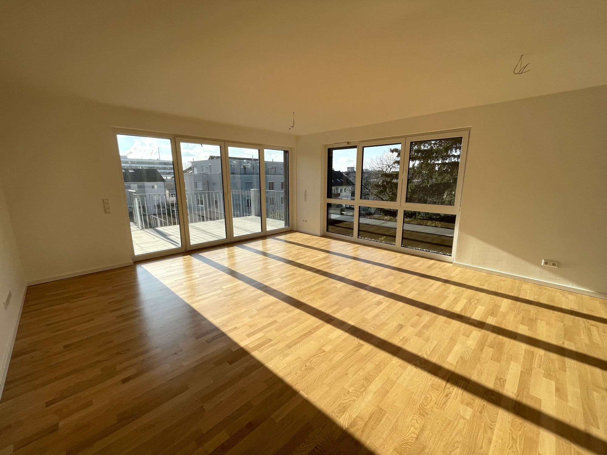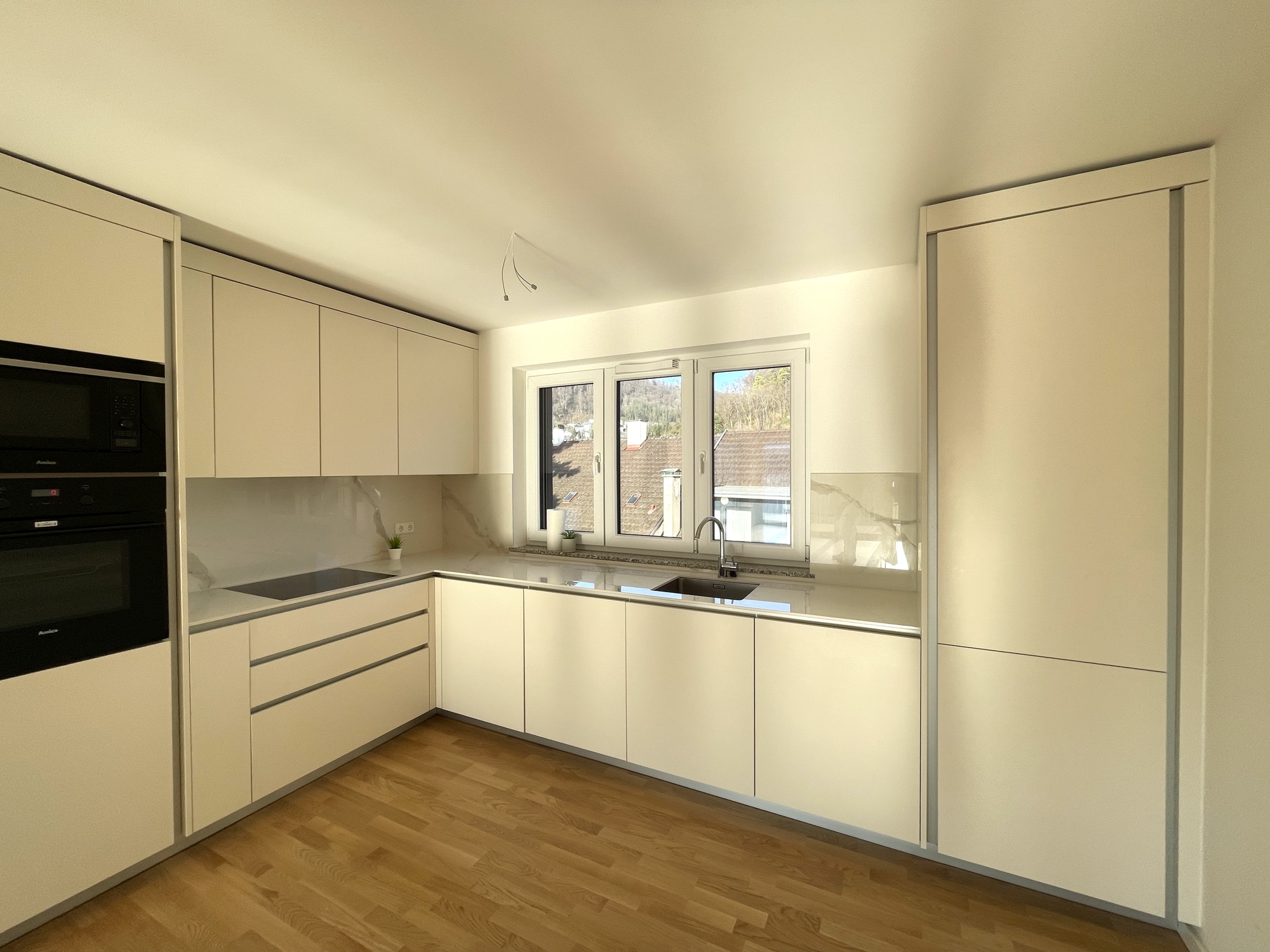 Der lichtdurchflutete Wohnraum mit bodentiefen Fenstern schafft eine unvergleichliche Wohnatmosphäre, die durch eine neue, hochwertige Einbauküche abgerundet wird. Sowohl vom Wohnzimmer als auch vom Schlafzimmer haben Sie direkten Zugang zu jeweils einem der beiden großen Balkone, die zum Entspannen und Genießen nach einem stressigen Tag perfekt geeignet sind.