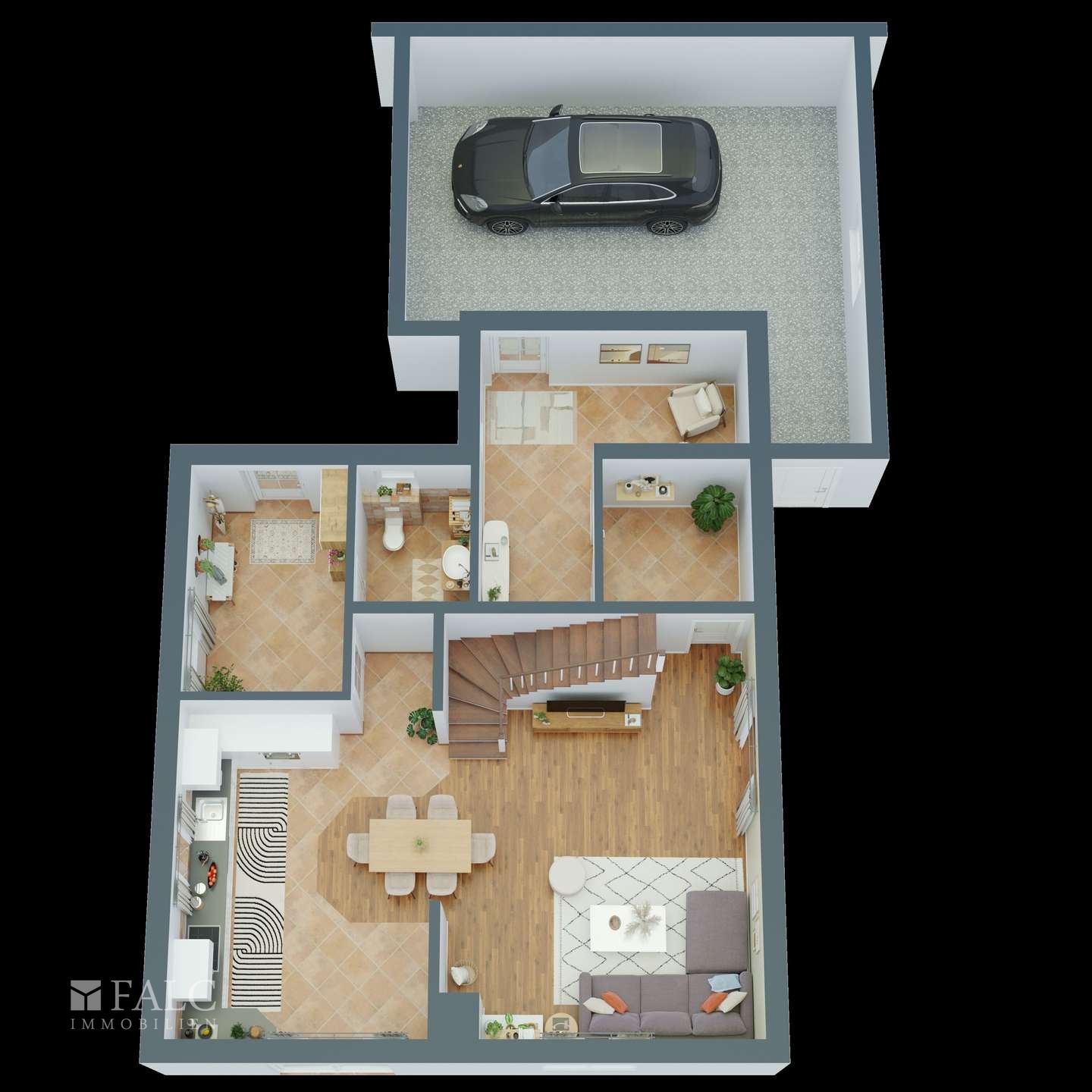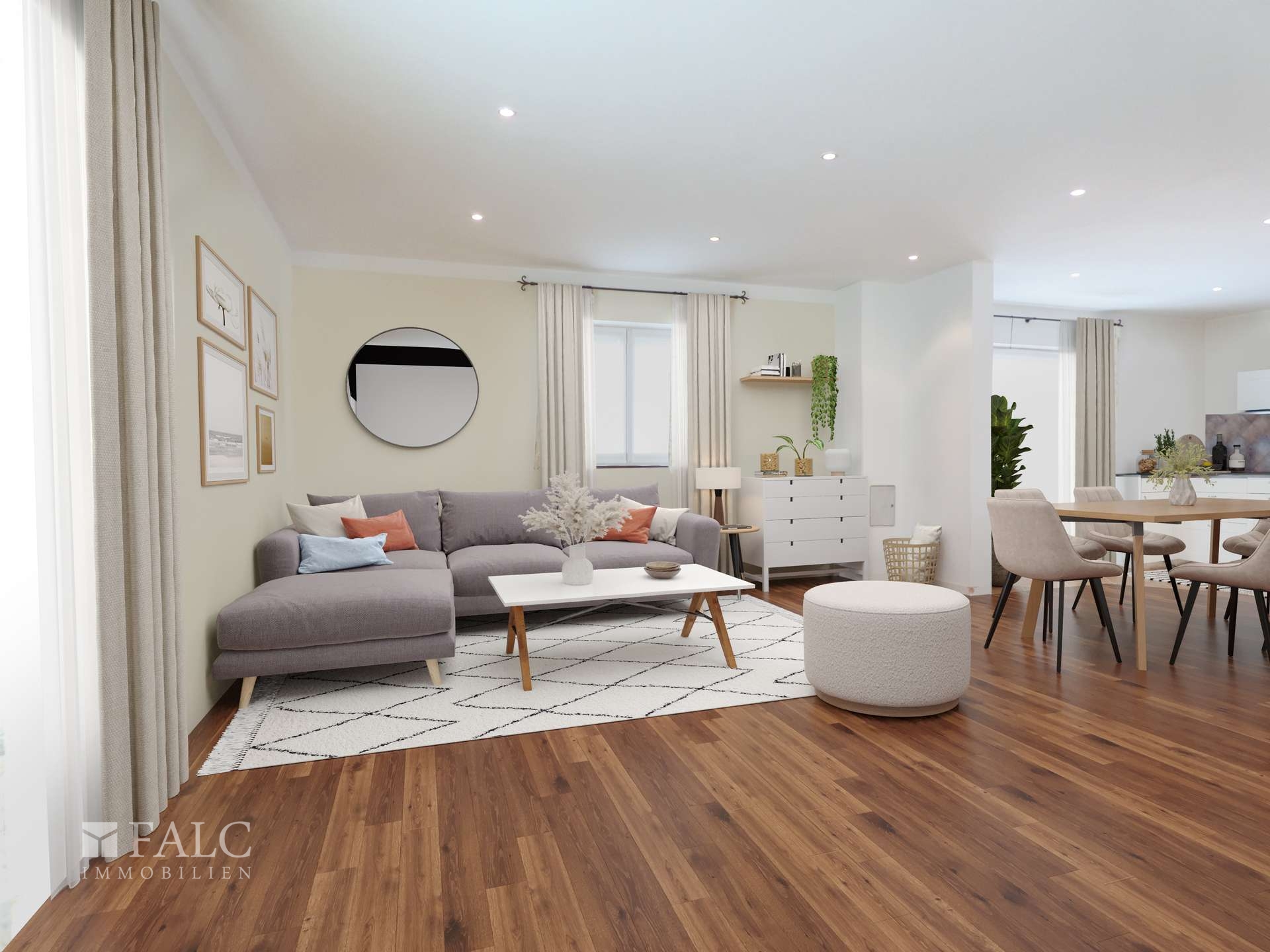 Weiter geht es in den offenen Wohnbereich, der durch seine großzügigen Fenster viel Tageslicht bietet. Der Wohnbereich ist harmonisch mit dem Essbereich verbunden, was eine ideale Umgebung für gesellige Abende schafft. Die angrenzende Küche ist modern ausgestattet und bietet ausreichend Platz für kulinarische Kreationen.
