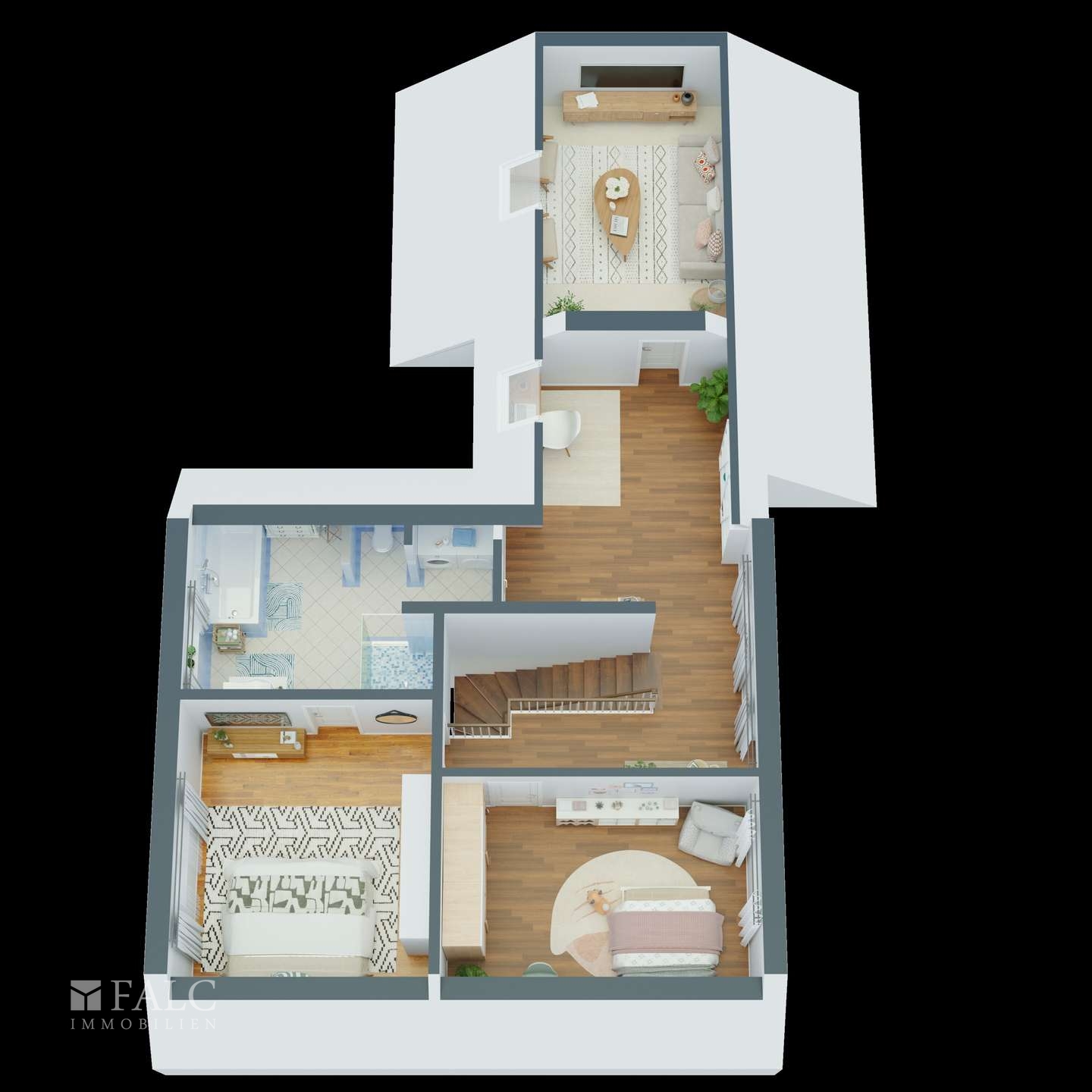 Im Obergeschoss befinden sich die privaten Räume. Das Hauptschlafzimmer bietet ausreichend Platz für einen großen Kleiderschrank und ein gemütliches Bett. Zwei weitere Zimmer können flexibel als Kinderzimmer, Gästezimmer oder Homeoffice genutzt werden. Das Badezimmer auf dieser Etage ist mit modernen Armaturen ausgestattet und bietet eine erholsame Atmosphäre.