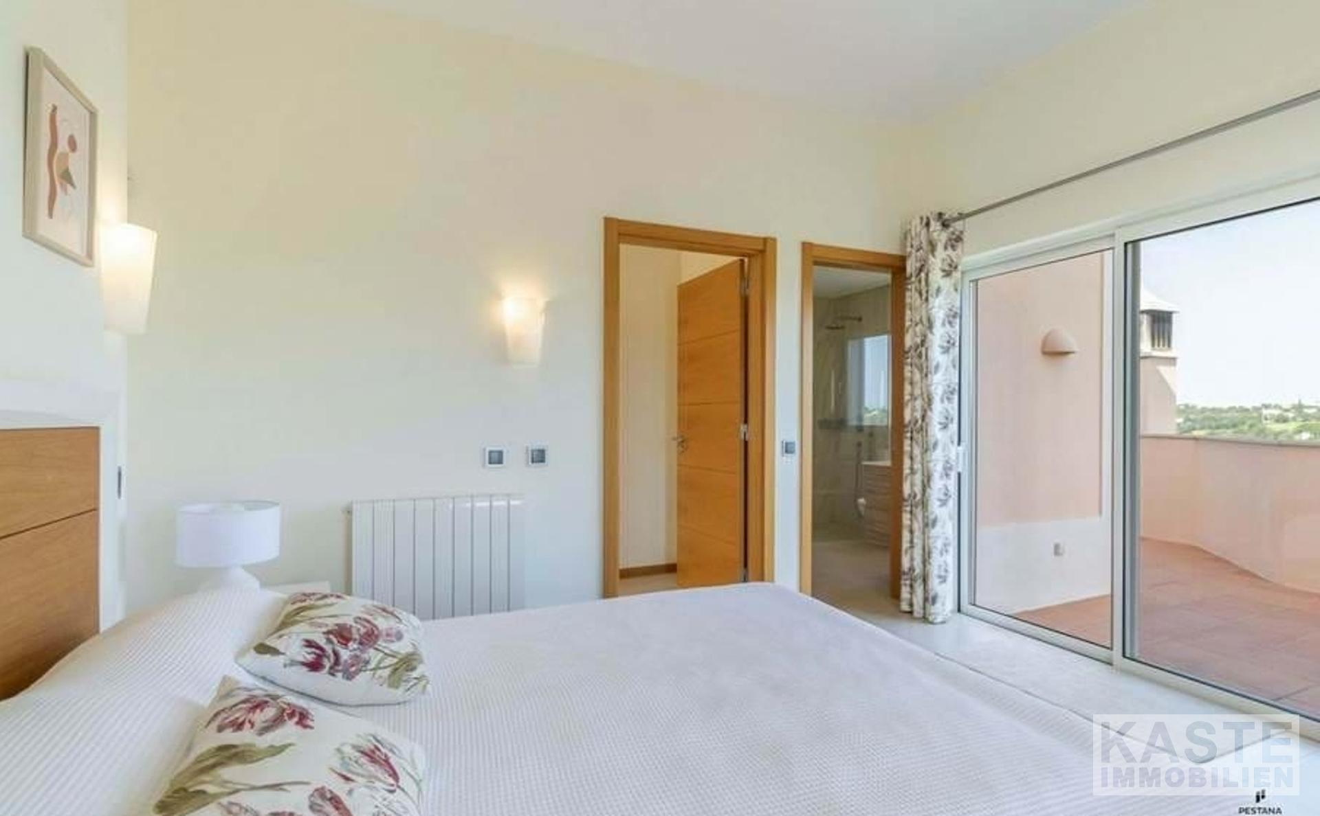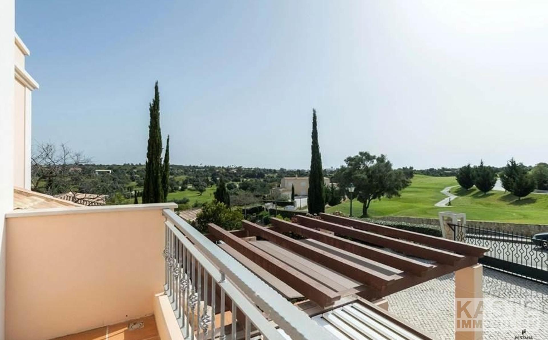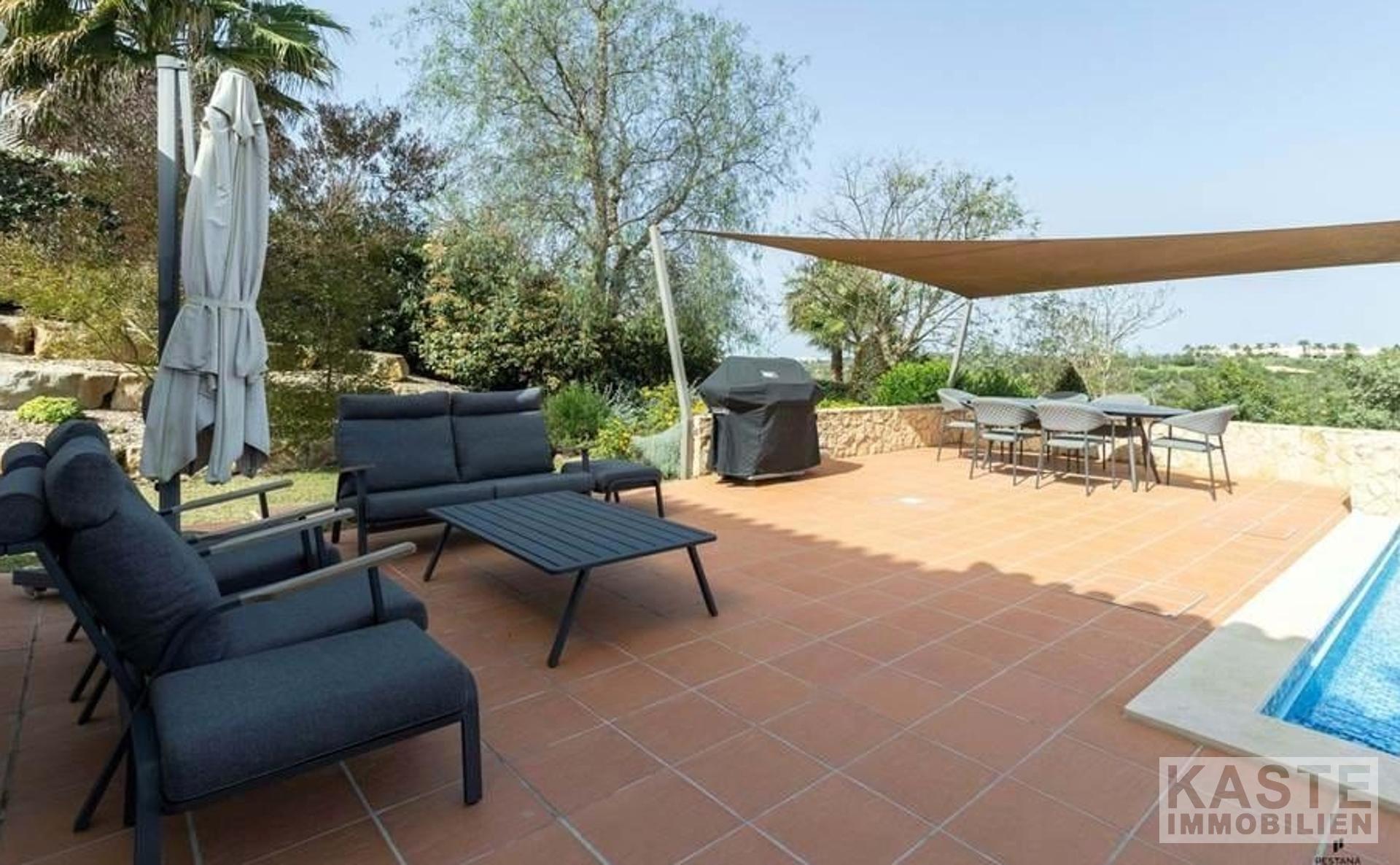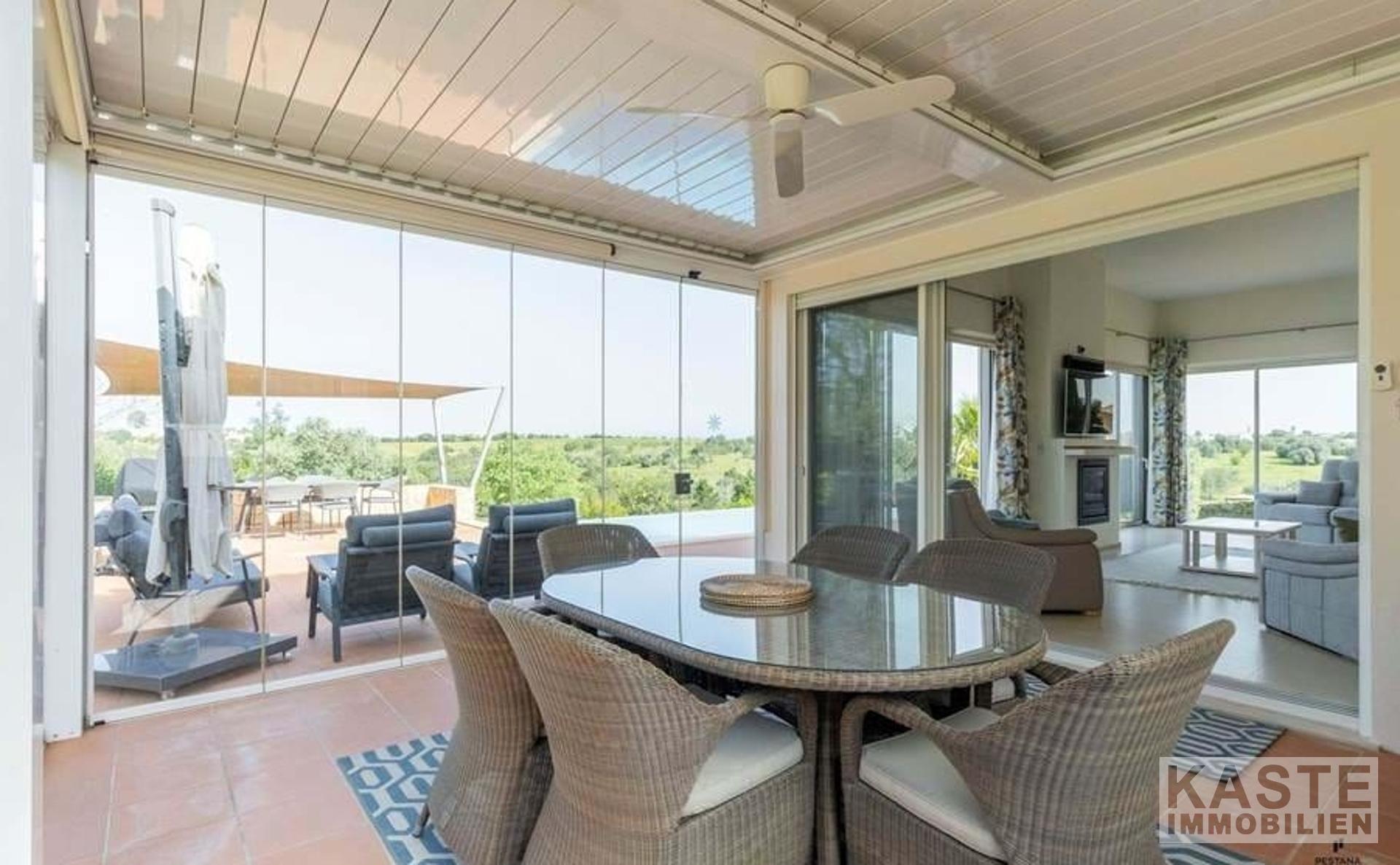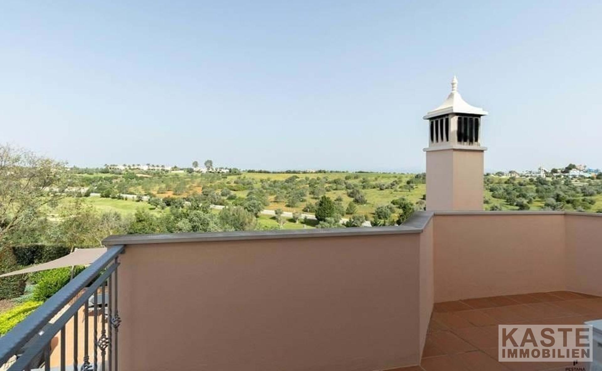 Der weitläufige Balkon bietet einen atemberaubenden Blick auf die umliegende Landschaft und den nahegelegenen Golfplatz – der perfekte Ort für Entspannung oder gesellige Stunden im Freien.