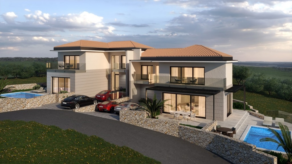 Diese luxuriöse Doppelhaushälfte (von vorne rechts) liegt auf der Insel Krk in Vrbnik in traumhafter Lage und nur 500 Meter vom Meer und dem Zentrum entfernt.