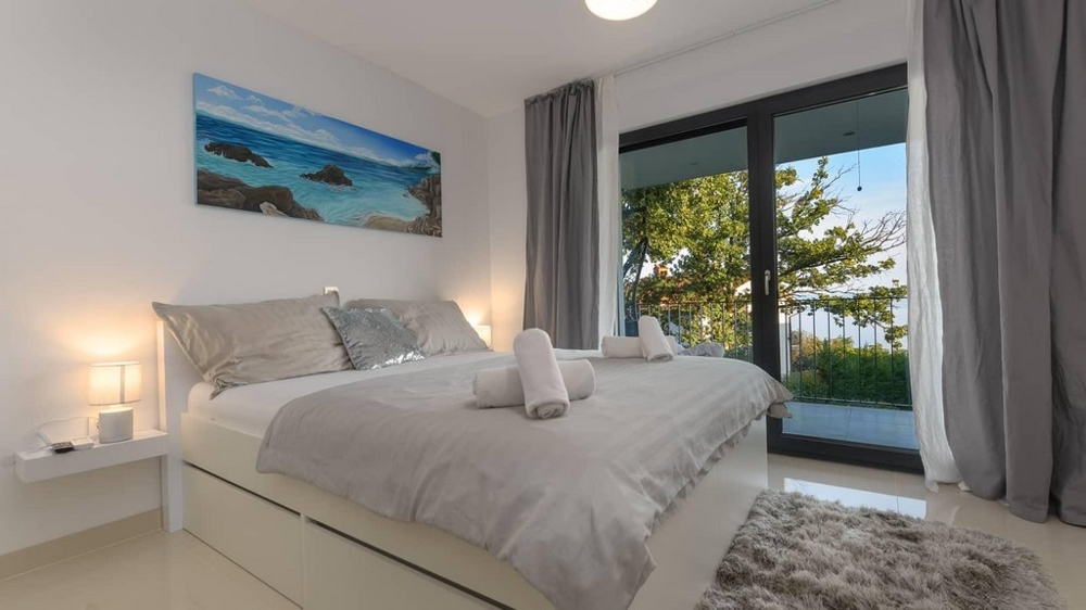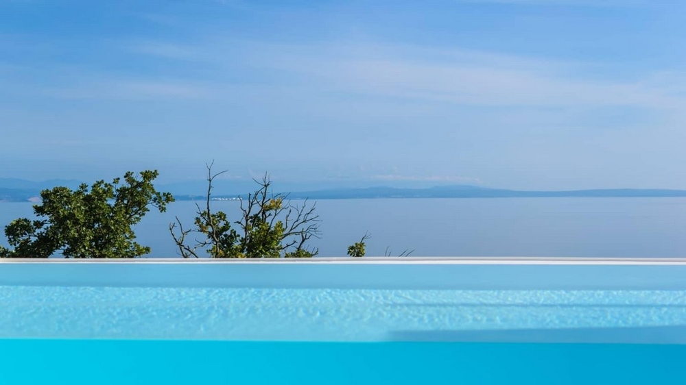 Bei diesem Angebot handelt es sich um eine moderne Doppelhaushälfte mit Swimmingpool und traumhaftem Panorama-Meerblick an der Riviera von Opatija.