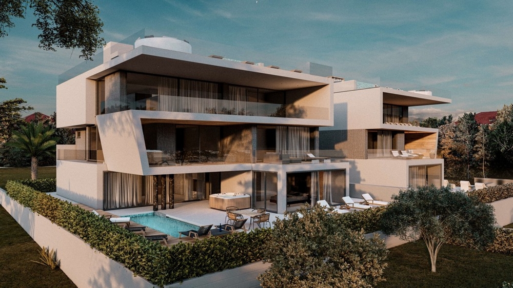 Die Wohnfläche verteilt sich auf zwei Schlafzimmer mit eigenem Bad, das Master-Schlafzimmer mit WC, Sauna, Dusche und Ankleidezimmer, das Wohnzimmer mit offener Küche und Essbereich sowie Terrassen und einen Garten mit Swimmingpool.