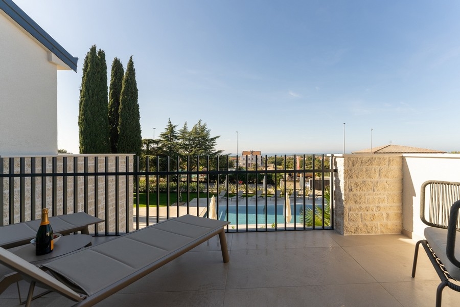 Bei diesem Objekt handelt es sich um eine moderne Luxuswohnung mit Community-Swimmingpool und schönem Meerblick bei Porec, Istrien.