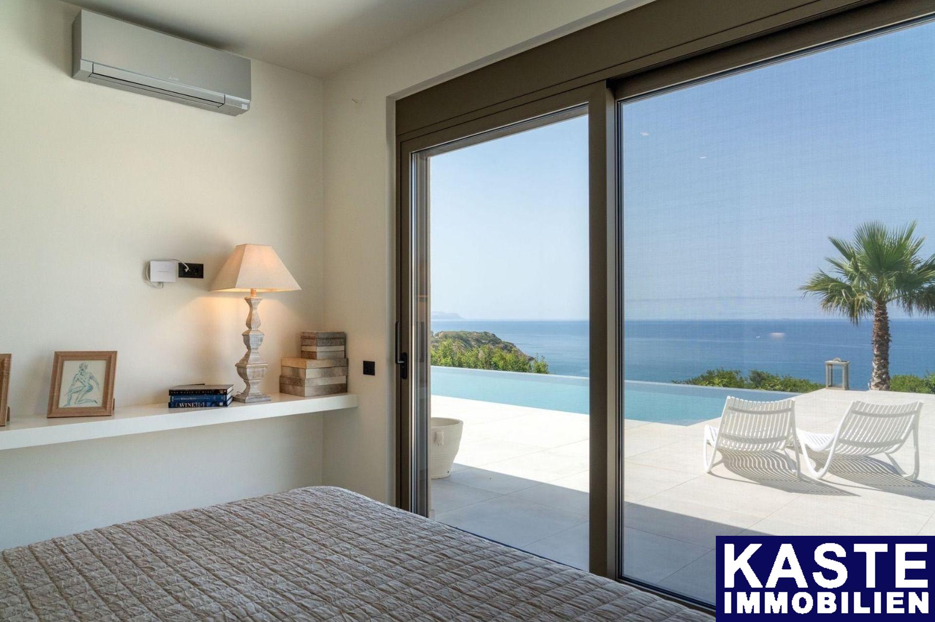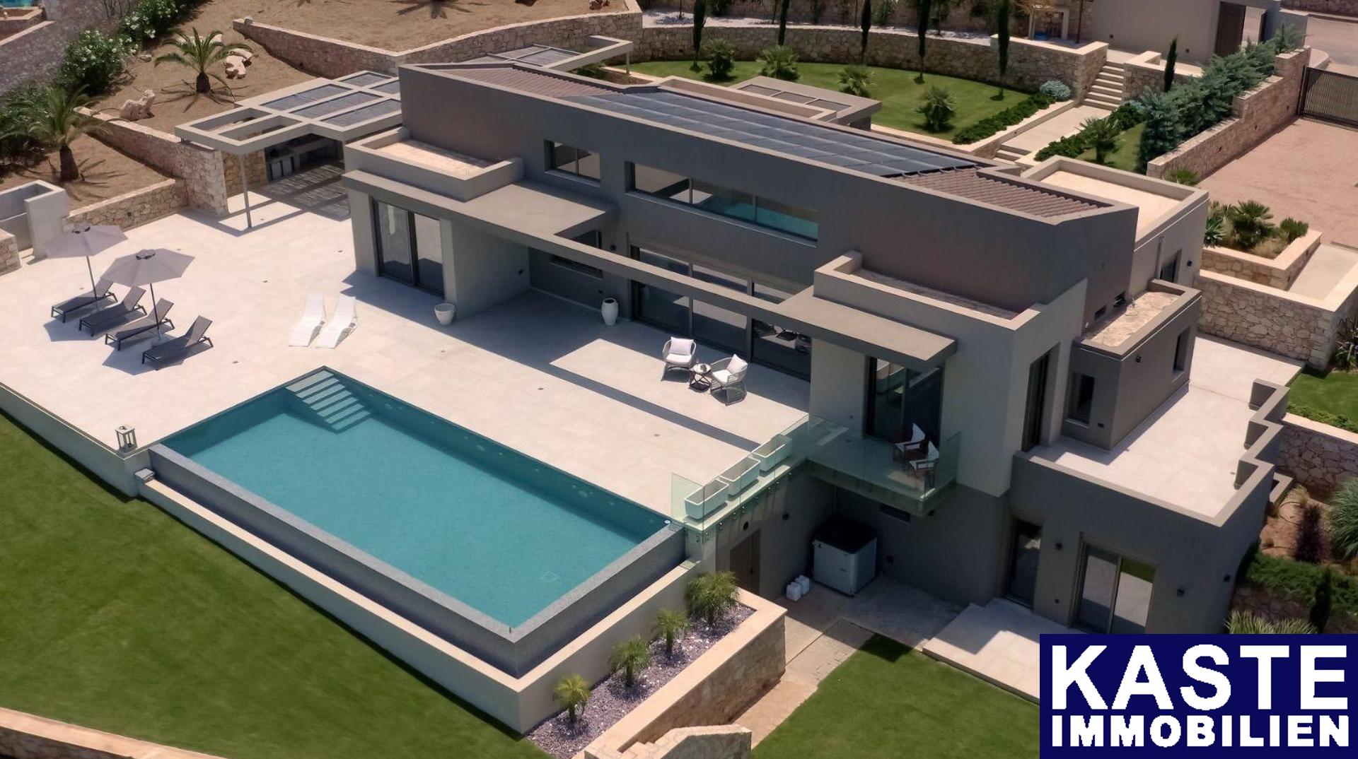 Im Außenbereich wartet eine beeindruckende, 500 m² große Terrasse mit vier festen Sitzbereichen, welche zum Verweilen einladen und u.a. von Pergolen bedeckten Grillzonen profitieren. Das Highlight bildet ein beheizbarer Infinity-Pool (5 x 12 Meter) mit Wärmepumpen- und Salzwasser-Elektrolysesystem, der einen atemberaubenden Meerblick garantiert. Der liebevoll angelegte Garten bedeckt rund die Hälfte des Grundstücks und ist mit einer fernsteuerbaren unterirdischen Sprinkleranlage ausgestattet. Für Ihre Fahrzeuge stehen auf dem 45 m² gefliesten Parkplatz Platz für drei Fahrzeuge bereit.
