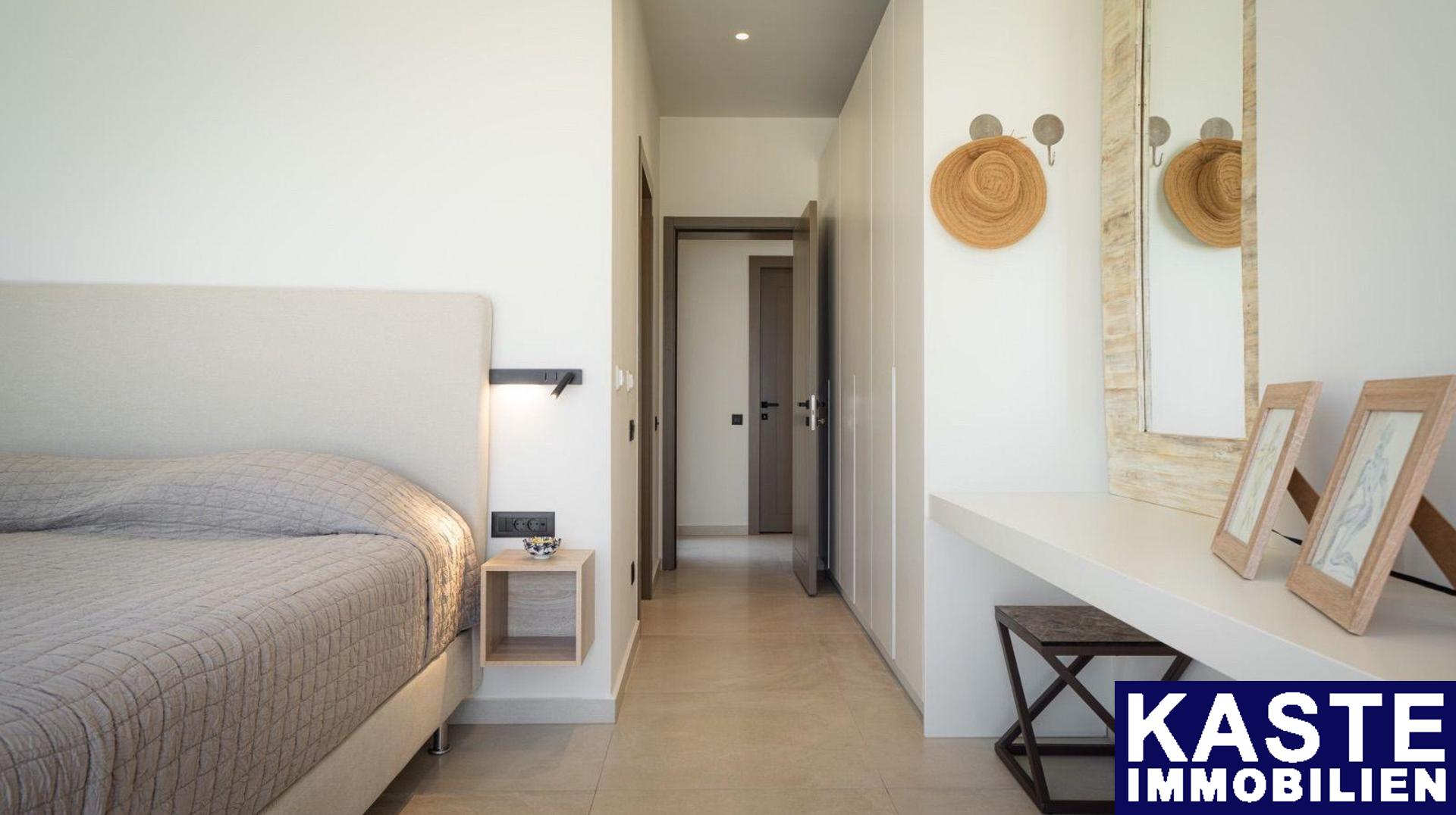 Mit einer Wohnfläche von 340 m² erstreckt sich die Villa ebenerdig und umfasst vier großzügige Schlafzimmer und vier hochwertige Badezimmer. Der offene Grundriss mit einem großen Wohnbereich, bestehend aus moderner Küche, Esszimmer und einem stilvollen Wohnzimmer mit elektrischem Kamin und Heizfunktion, schafft eine angenehme Atmosphäre für Familien und Gäste. Die hochwertige Einrichtung der Küche mit Miele-Geräten – inklusive Kühlschrank, Cerankochfeld, Backofen, Mikrowelle und Geschirrspüler – unterstreicht die Qualitätsansprüche dieses Domizils.