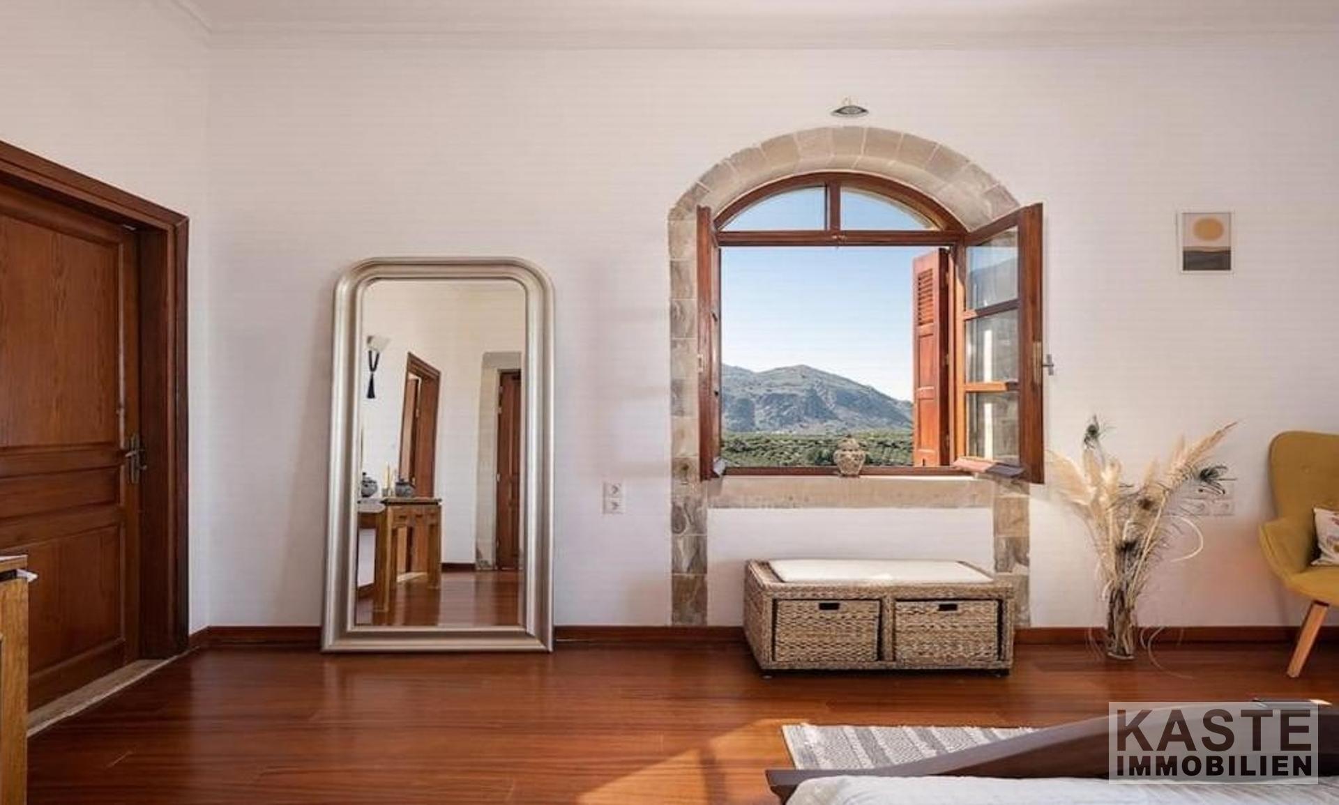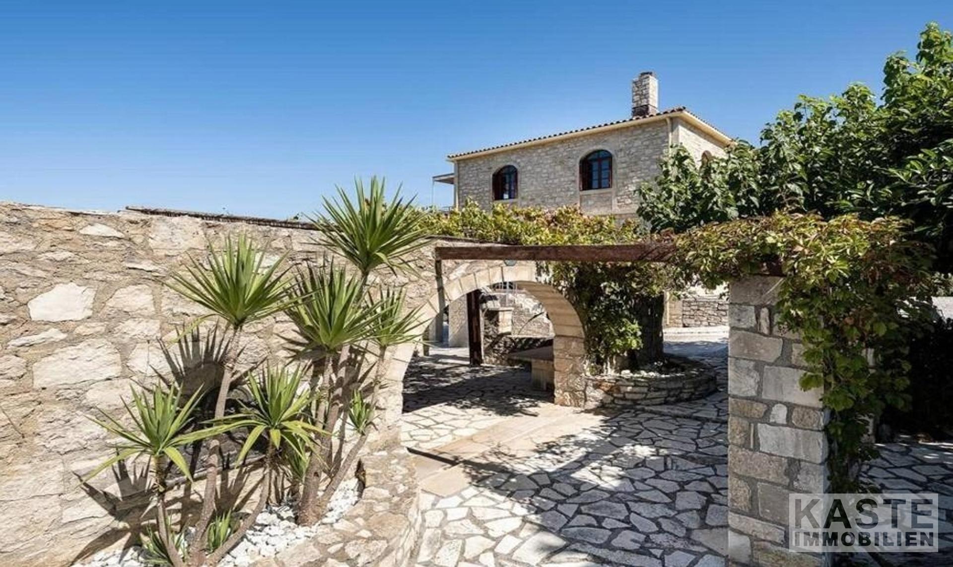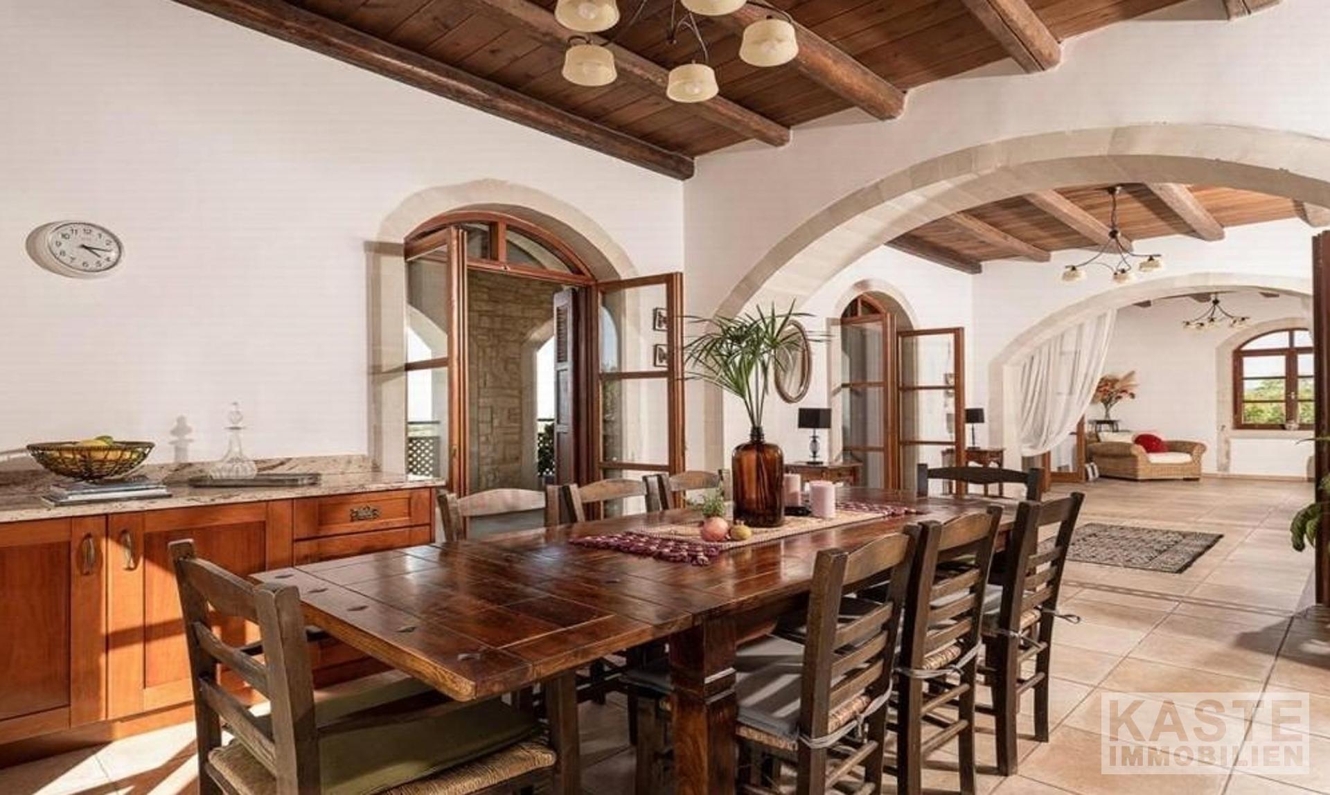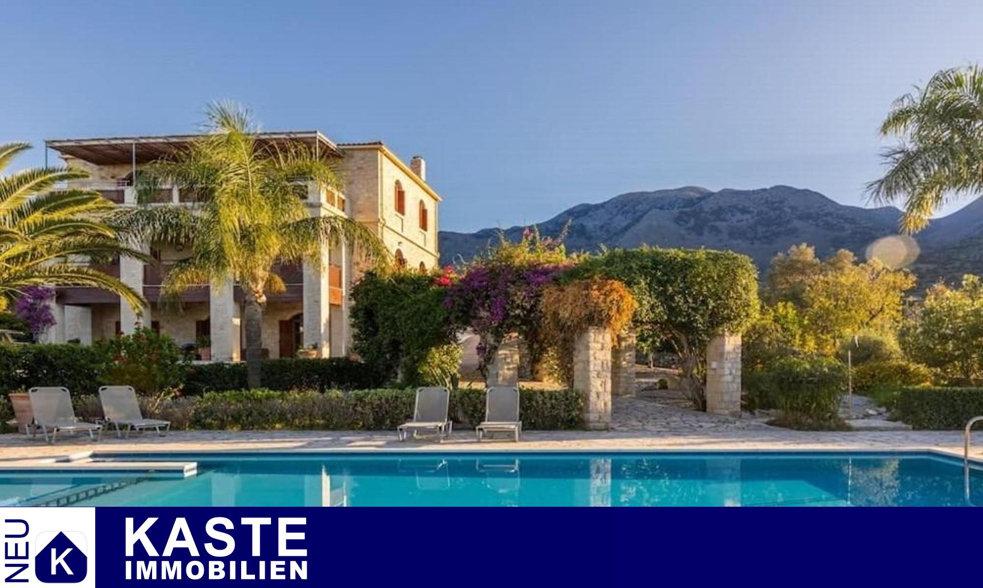Diese exklusive Steinvilla in Kournas, Apokoronas, Kreta, vereint traditionelles kretisches Flair mit modernem Luxus und bietet Ihnen ein unvergleichliches Wohnerlebnis auf 322 m² Wohnfläche. Die über drei Ebenen gestaltete Residenz verfügt über insgesamt sechs geräumige Zimmer, darunter fünf komfortable Schlafzimmer und fünf modernen Badezimmer, die stilvolle Lebensqualität garantieren. Das Grundstück erstreckt sich auf beeindruckende 4554 m² und ist von eindrucksvollen Steinmauern sowie einem gepflegten Garten mit Oliven- und Zitrusbäumen, Jasmin und Geißblatt umgeben und bietet somit höchste Privatsphäre.
