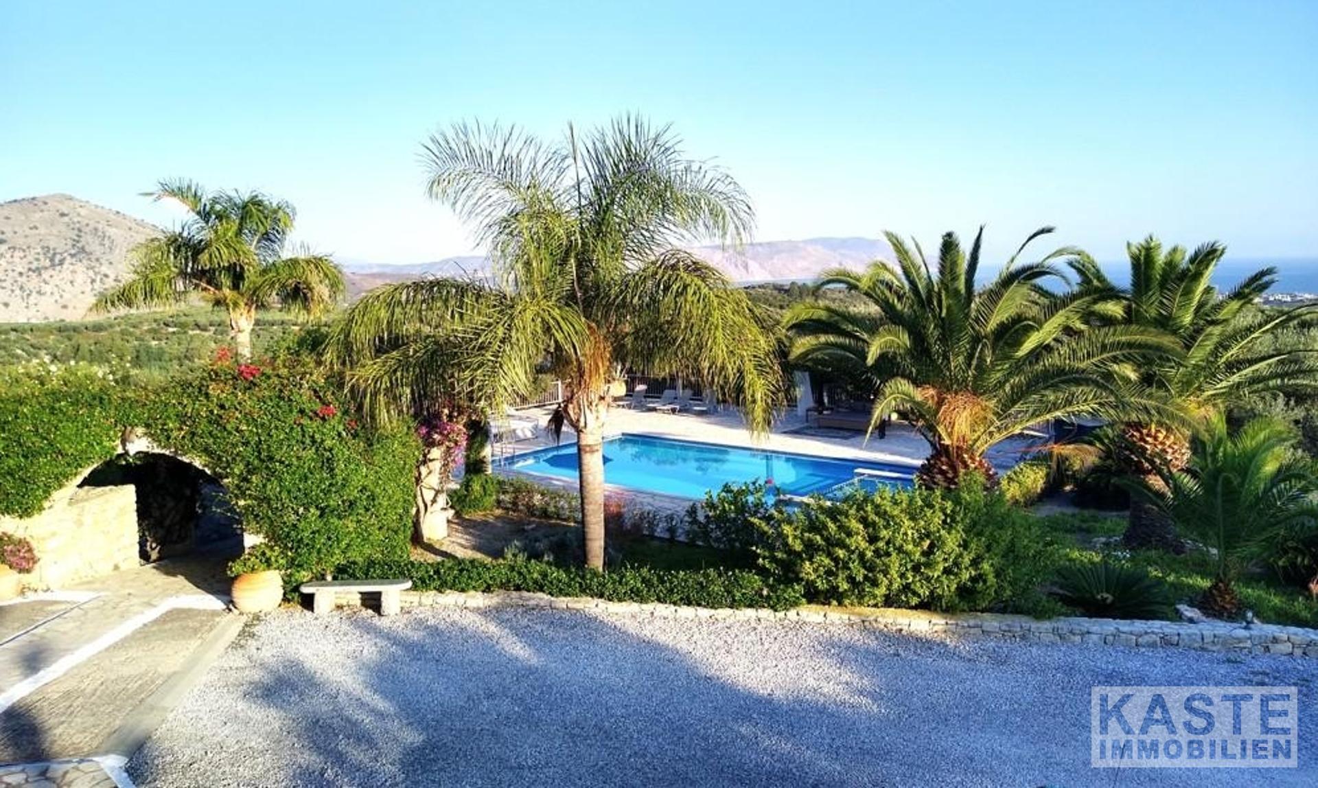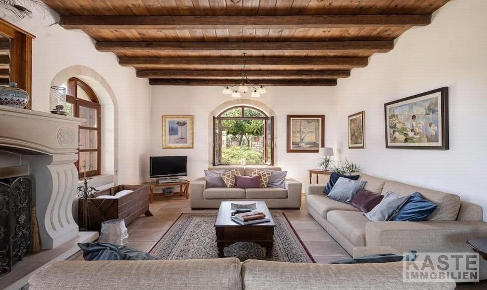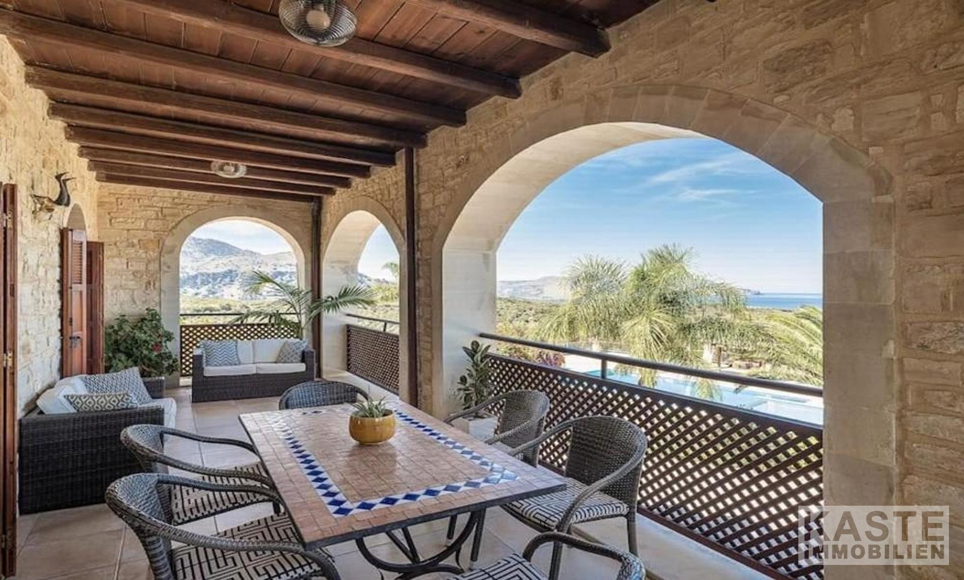 Diese exklusive Steinvilla in Kournas, Apokoronas, Kreta, vereint traditionelles kretisches Flair mit modernem Luxus und bietet Ihnen ein unvergleichliches Wohnerlebnis auf 322 m² Wohnfläche. Die über drei Ebenen gestaltete Residenz verfügt über insgesamt sechs geräumige Zimmer, darunter fünf komfortable Schlafzimmer und fünf modernen Badezimmer, die stilvolle Lebensqualität garantieren. Das Grundstück erstreckt sich auf beeindruckende 4554 m² und ist von eindrucksvollen Steinmauern sowie einem gepflegten Garten mit Oliven- und Zitrusbäumen, Jasmin und Geißblatt umgeben und bietet somit höchste Privatsphäre.