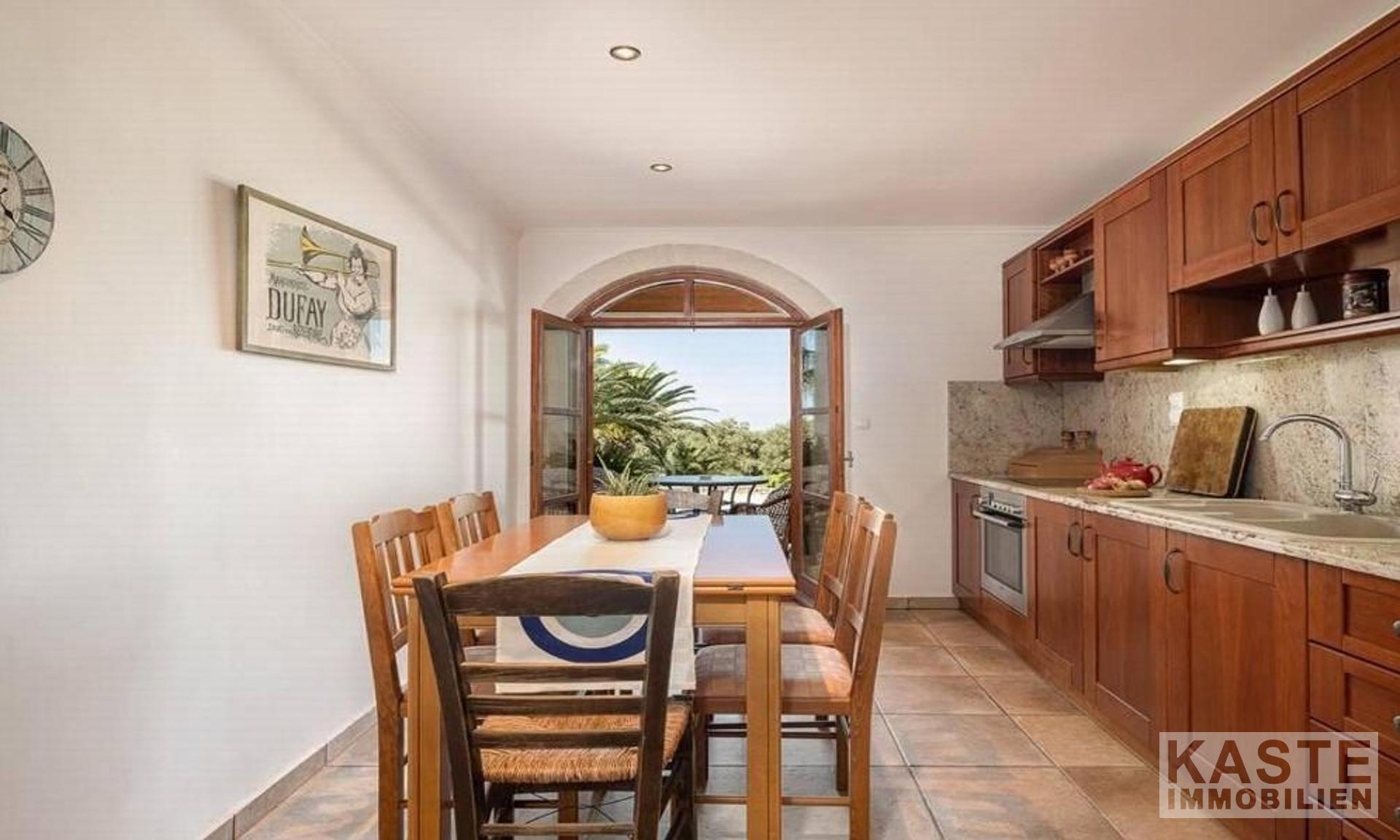 Das Erdgeschoss beeindruckt mit einem offenen Wohn- sowie Essbereich, einer voll ausgestatteten Küche und einem großen Steinkamin. Hier genießt man den direkten Zugang zur großzügigen Veranda mit atemberaubendem Blick auf den privaten Swimmingpool, das glitzernde Meer und die majestätischen Berge. Die untere Etage verfügt über drei Schlafzimmer und zwei Badezimmer, zwei davon mit direktem Zugang zum Garten und Poolbereich, was diese Ebene perfekt für Gäste beziehungsweise eine unabhängige Nutzung macht. Eine zweite Küche sowie ein Hauswirtschaftsraum sind weitere praktische Highlights.