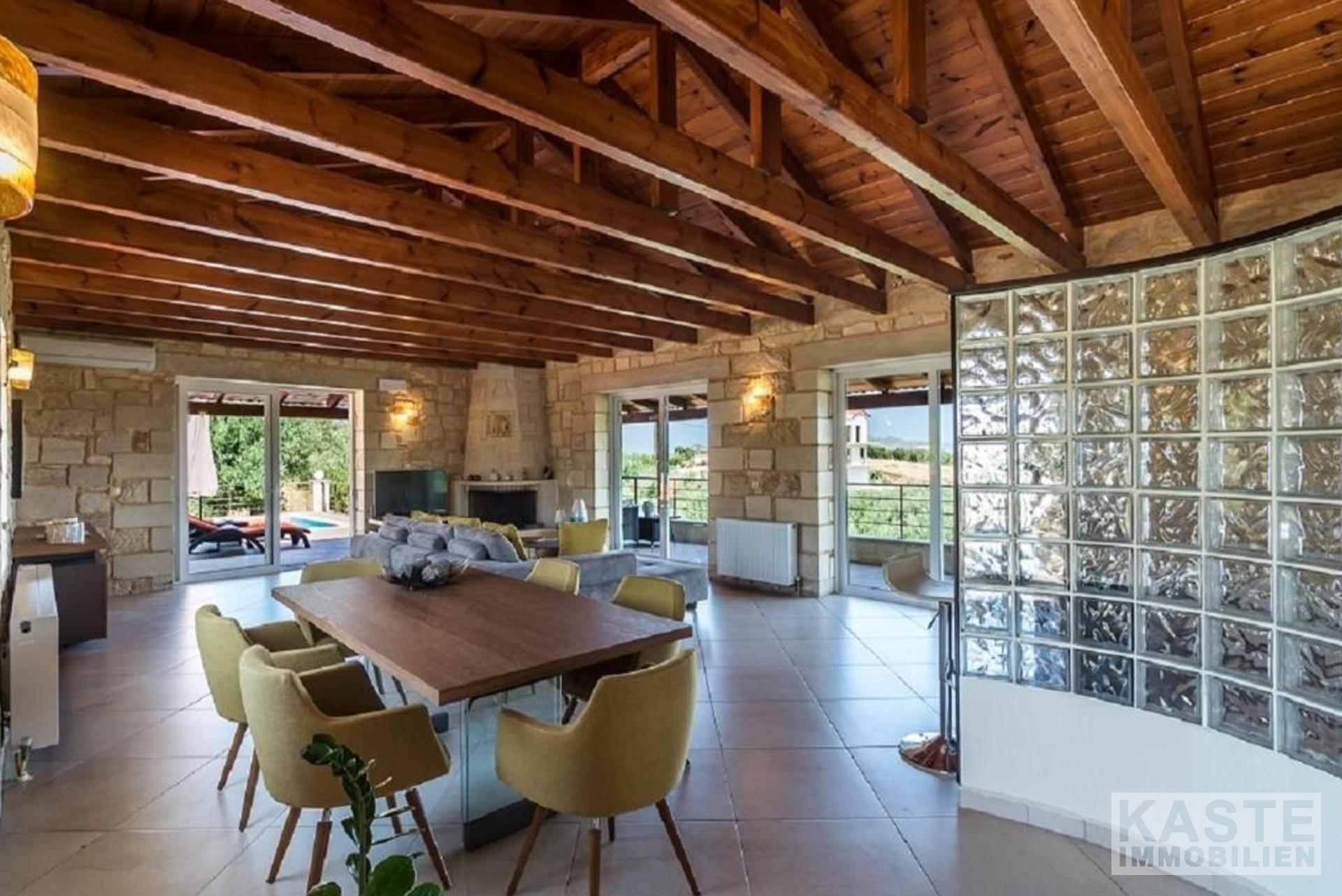 Der große private Pool und der gepflegte Garten mit Olivenbäumen, kombiniert mit einer großzügigen Terrasse, laden zum Verweilen und Entspannen ein. Zu den gehobenen Ausstattungsmerkmalen gehören eine leistungsfähige Klimaanlage, eine Solarwasserheizung für umweltbewussten Komfort, Doppelverglasung, eine Alarmanlage sowie ein praktischer Abstellraum und eine geschlossene Garage mit direktem Zugang zum Grundstück. Diese Villa eignet sich ideal als luxuriöser Dauerwohnsitz, stilvolles Ferienhaus oder lukratives Investitionsobjekt – dank der Nähe zu Stränden, Stadt Chania und dem Flughafen.