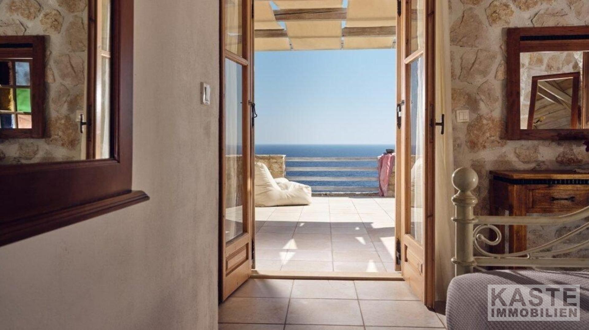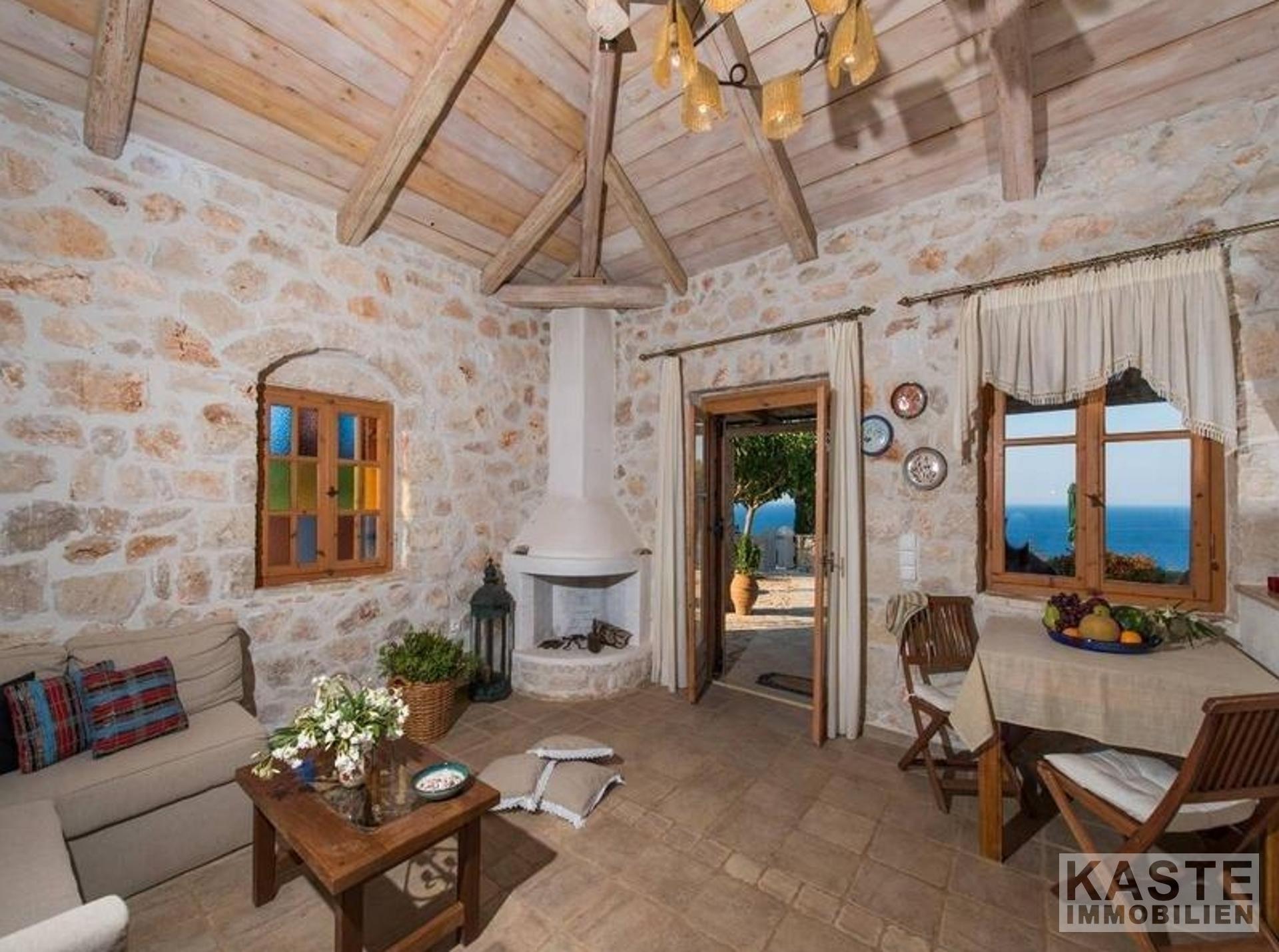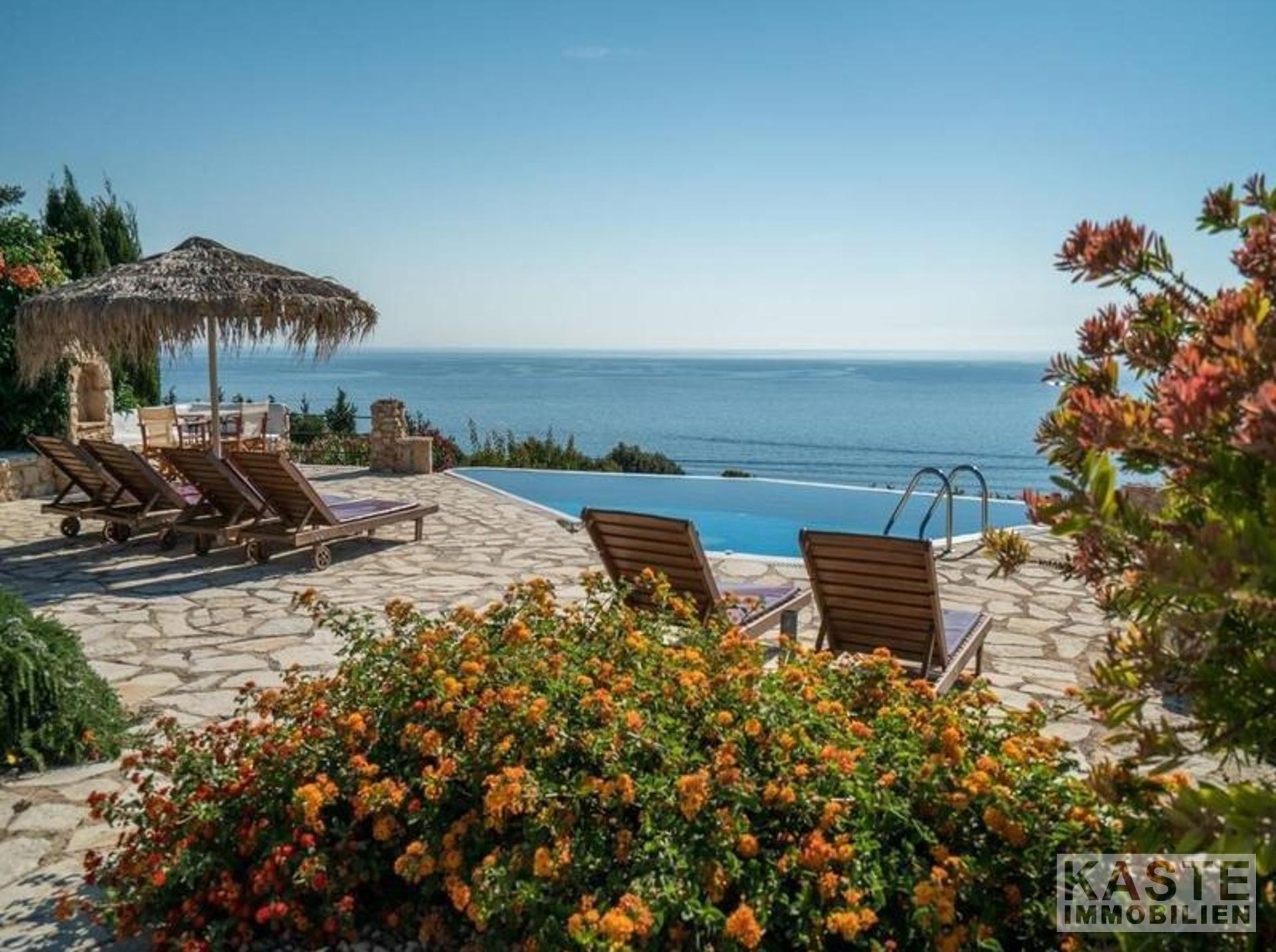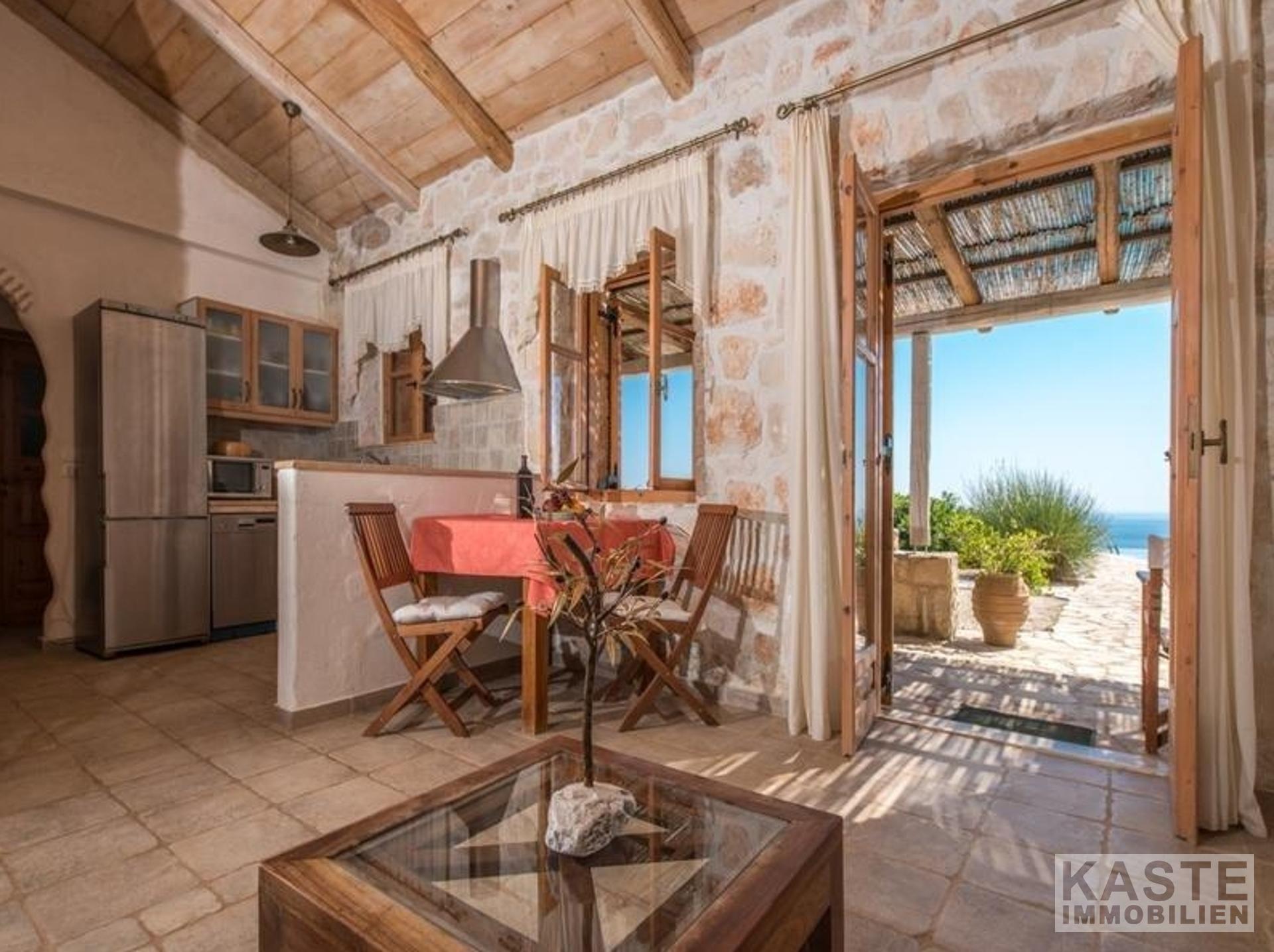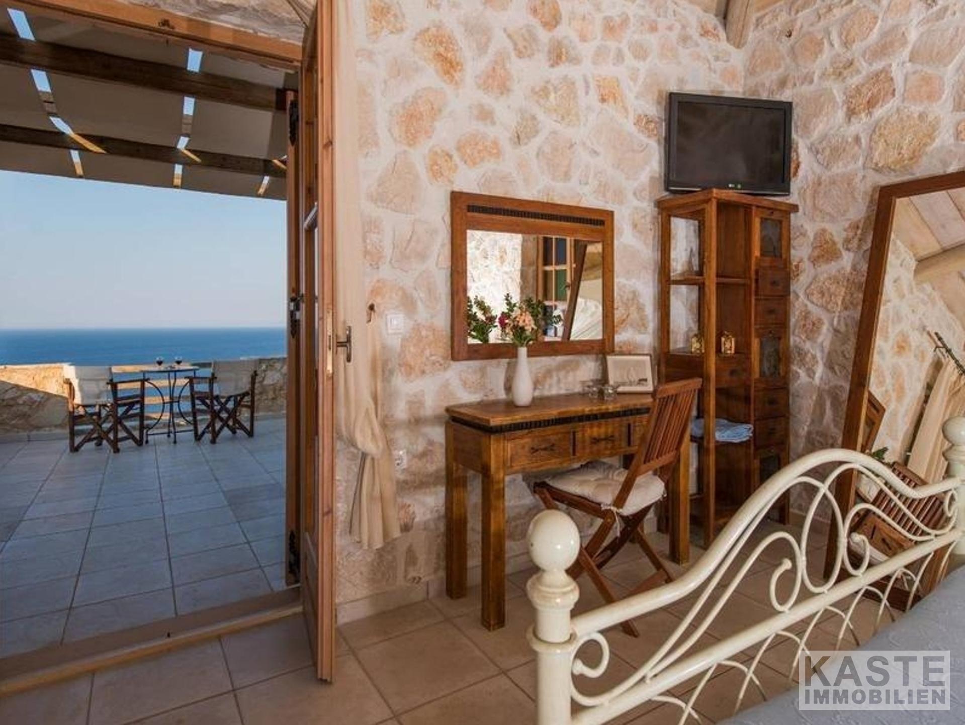 Eine interne Treppe führt Sie in den ersten Stock, wo sich das dritte Schlafzimmer befindet – ein geräumiges Doppelzimmer, das ebenfalls über ein eigenes Bad verfügt. Das Highlight des Obergeschosses ist zweifellos die atemberaubende überdachte Terrasse, die einen verzaubernden Blick auf das ruhige Ionische Meer und die Nachbarinsel Kefalonia bietet. Hier können Sie in aller Ruhe die mediterrane Sonne genießen, während Sie sich in ein fesselndes Buch vertiefen.