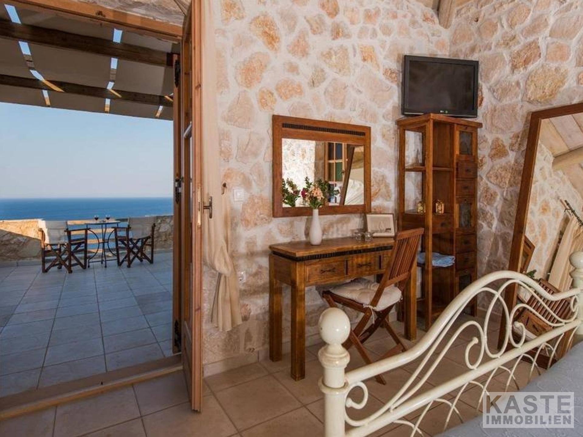 Eine interne Treppe führt Sie in den ersten Stock, wo sich das dritte Schlafzimmer befindet – ein geräumiges Doppelzimmer, das ebenfalls über ein eigenes Bad verfügt. Das Highlight des Obergeschosses ist zweifellos die atemberaubende überdachte Terrasse, die einen verzaubernden Blick auf das ruhige Ionische Meer und die Nachbarinsel Kefalonia bietet. Hier können Sie in aller Ruhe die mediterrane Sonne genießen, während Sie sich in ein fesselndes Buch vertiefen.