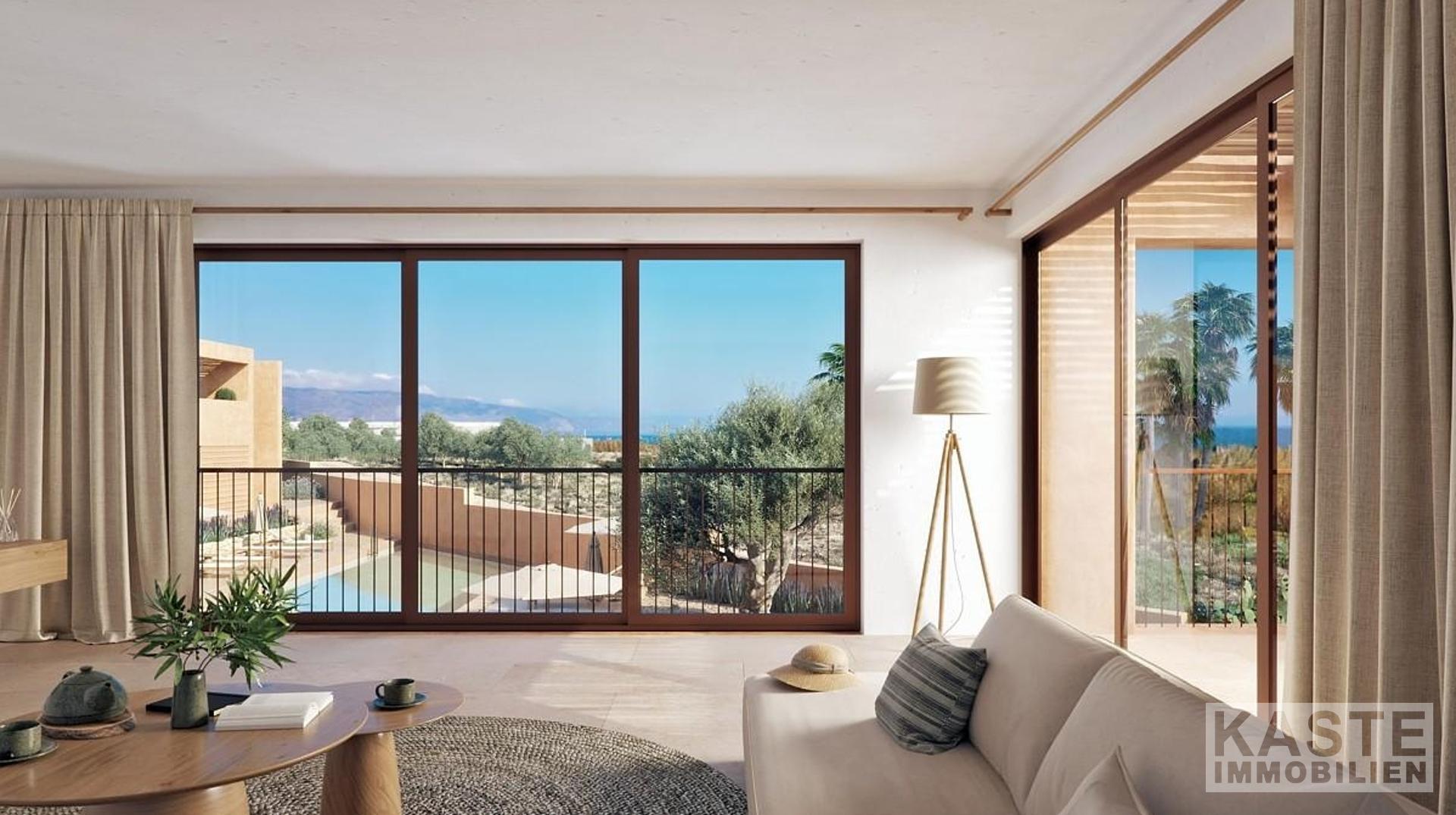 Gärten mit automatisch gesteuerten Bewässerungssystemen, eigene Parkplätze mit überdachten Stellplätzen sowie Balkone und Terrassen mit traumhaftem Meerblick schaffen ein wohltuendes Wohnambiente. Edle Keramikböden, maßgefertigte Einbauschränke und doppelte Sicherheitstüren komplettieren die Ausstattung. Die architektonische Anlehnung an die traditionelle Bauweise kretischer Landhäuser verleiht jedem Apartment eine besonderes Flair – harmonisch eingebettet in das natürliche Umfeld und eine entspannte Urlaubsatmosphäre.