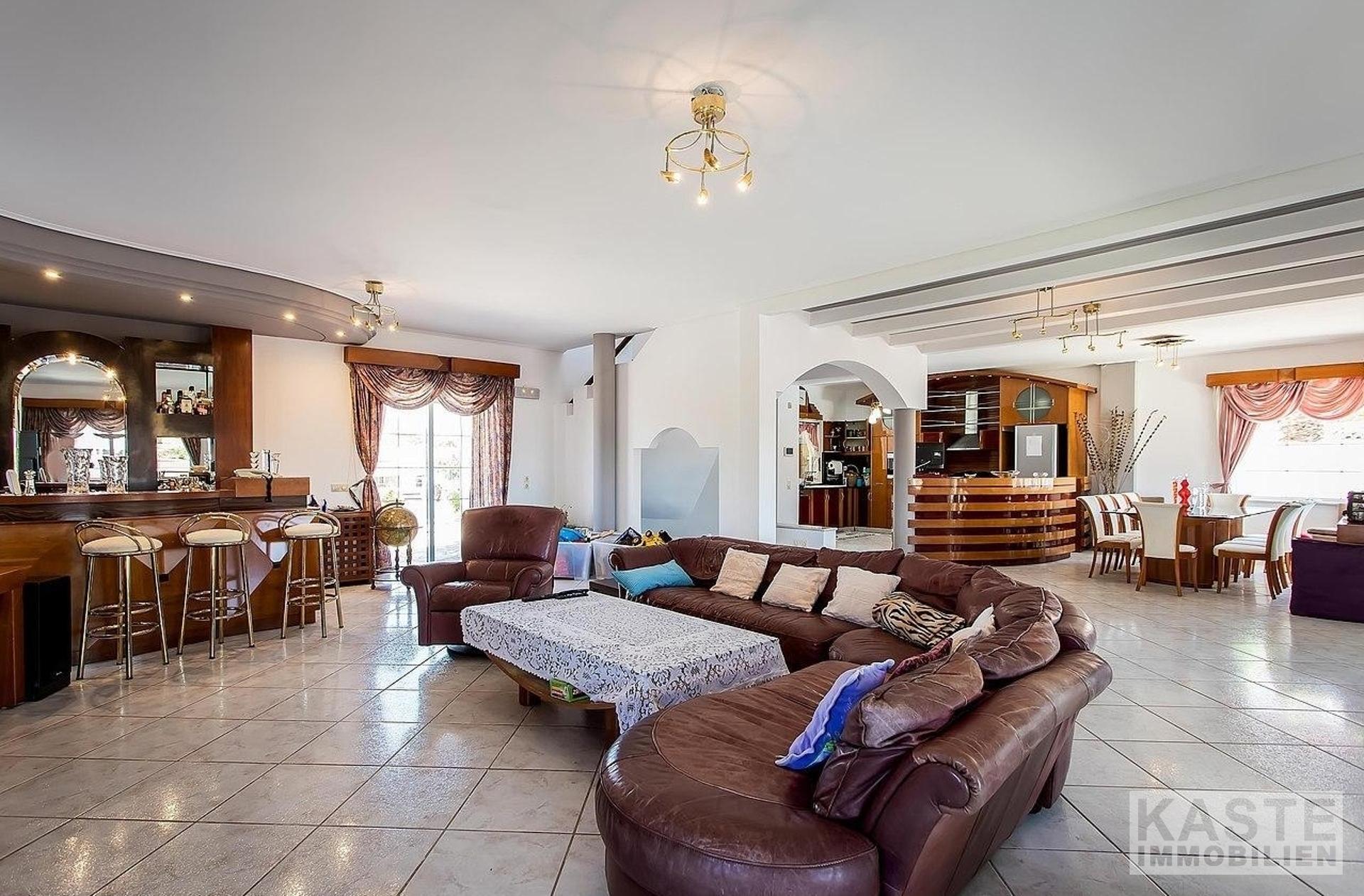 Im Erdgeschoss befinden sich: eine große Garage mit elektrischen Toren und Stauraum; ein unabhängiges Apartment mit Wohnzimmer, Einbauküche, Schlafzimmer und Badezimmer; eine große Sauna; ein Kinderspielzimmer (könnte ein großes Schlafzimmer sein); ein gut ausgestatteter Fitnessraum; ein großer Bereich mit verschiedenen Tischsportarten; eine Bar; ein Sportumkleidebereich; 4 Badezimmer; und große Abstellräume. Marmortreppen führen hinauf in die geräumige erste Etage, die eine voll ausgestattete Küche, einen großen Essbereich, einen riesigen Wohnbereich mit Bar und Kamin und ein WC umfasst.