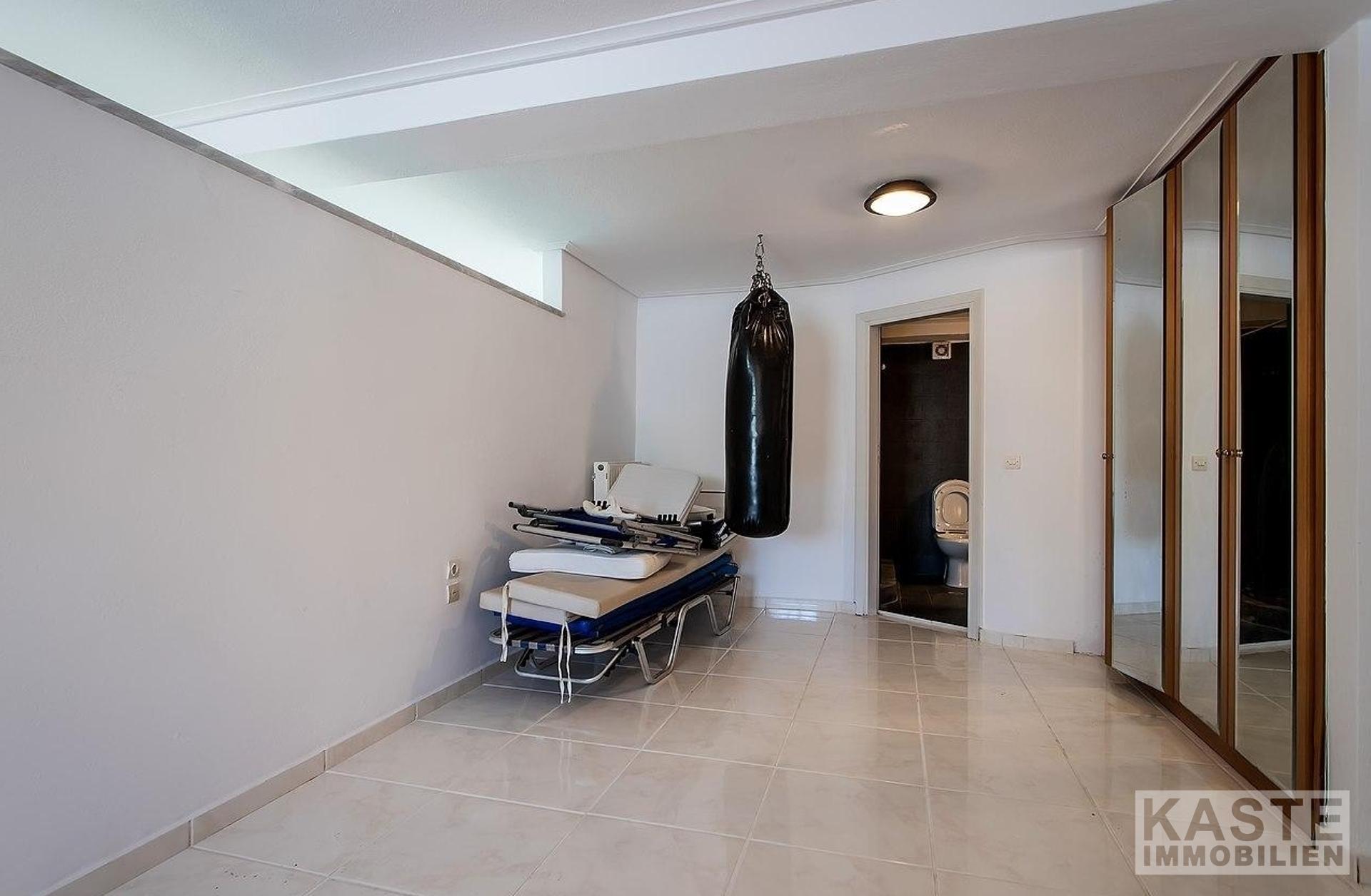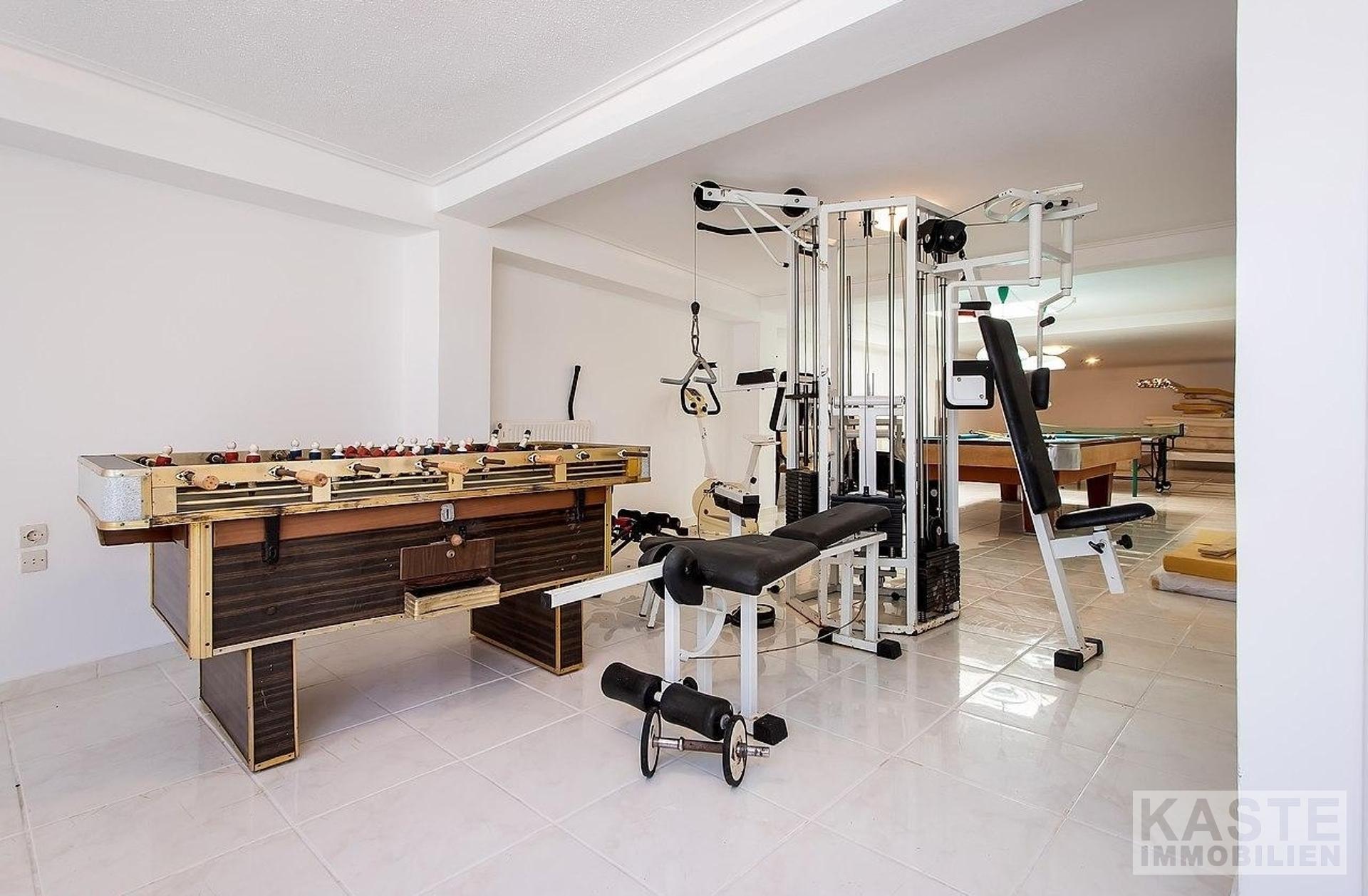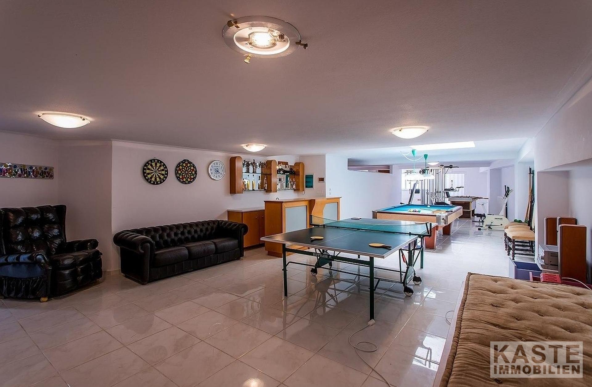 Im Erdgeschoss befinden sich: eine große Garage mit elektrischen Toren und Stauraum; ein unabhängiges Apartment mit Wohnzimmer, Einbauküche, Schlafzimmer und Badezimmer; eine große Sauna; ein Kinderspielzimmer (könnte ein großes Schlafzimmer sein); ein gut ausgestatteter Fitnessraum; ein großer Bereich mit verschiedenen Tischsportarten; eine Bar; ein Sportumkleidebereich; 4 Badezimmer; und große Abstellräume. Marmortreppen führen hinauf in die geräumige erste Etage, die eine voll ausgestattete Küche, einen großen Essbereich, einen riesigen Wohnbereich mit Bar und Kamin und ein WC umfasst.