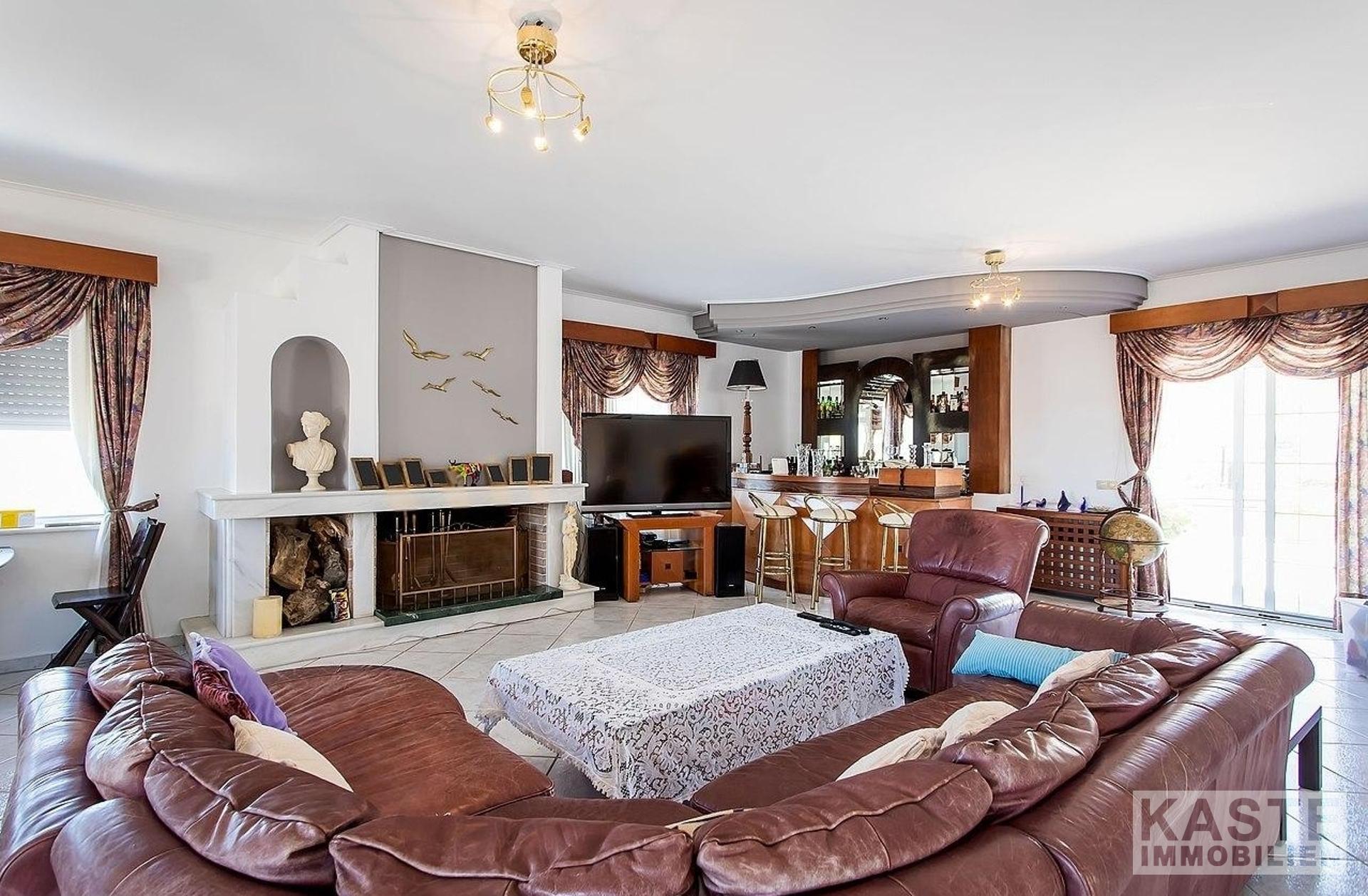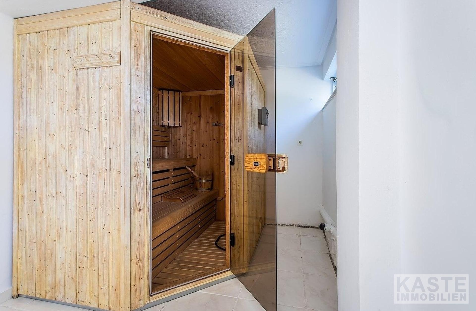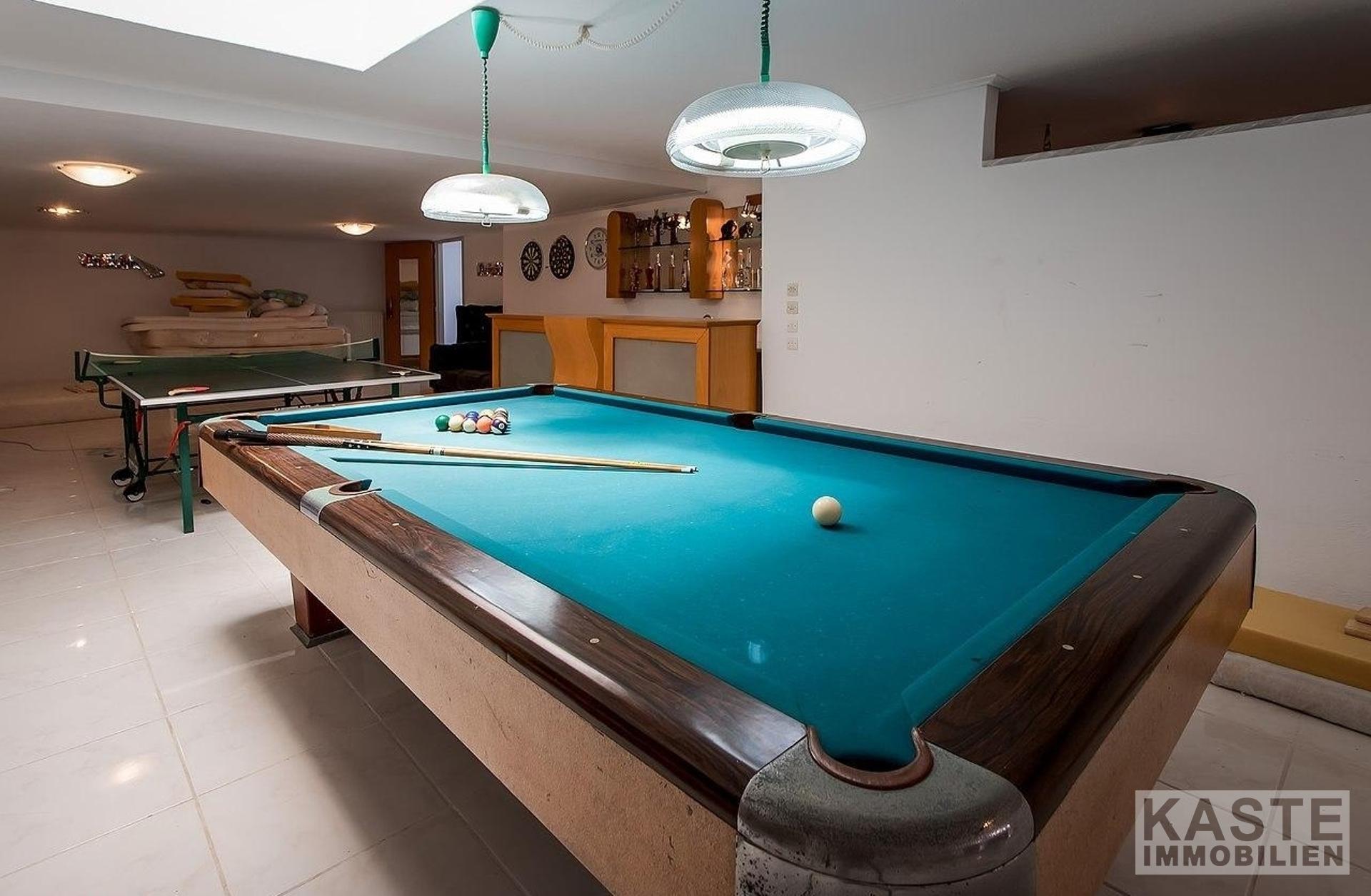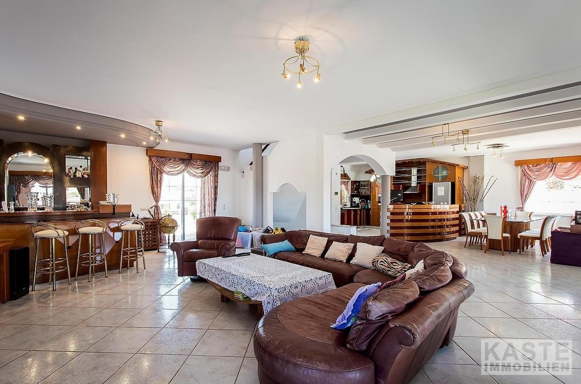 Im Erdgeschoss befinden sich: eine große Garage mit elektrischen Toren und Stauraum; ein unabhängiges Apartment mit Wohnzimmer, Einbauküche, Schlafzimmer und Badezimmer; eine große Sauna; ein Kinderspielzimmer (könnte ein großes Schlafzimmer sein); ein gut ausgestatteter Fitnessraum; ein großer Bereich mit verschiedenen Tischsportarten; eine Bar; ein Sportumkleidebereich; 4 Badezimmer; und große Abstellräume. Marmortreppen führen hinauf in die geräumige erste Etage, die eine voll ausgestattete Küche, einen großen Essbereich, einen riesigen Wohnbereich mit Bar und Kamin und ein WC umfasst.