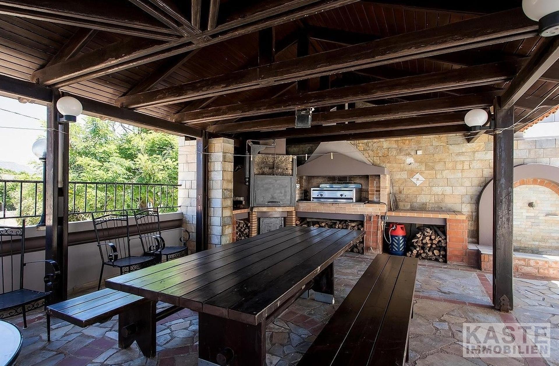 Im Außenbereich auf der ersten Etage gibt es mehrere große, schattige Terrassen mit Sitzgelegenheiten und herrlichem Blick auf den 75 m2 großen Swimmingpool (mit Kinderbereich), den nördlichen Garten und das Meer. Auf der Rückseite befindet sich ein großer schattiger Grillbereich und eine Terrasse zum Kochen und Essen mit zwei Öfen und einem Gasgrill sowie eine zusätzliche professionell ausgestattete Küche für besondere Essensmomente.
