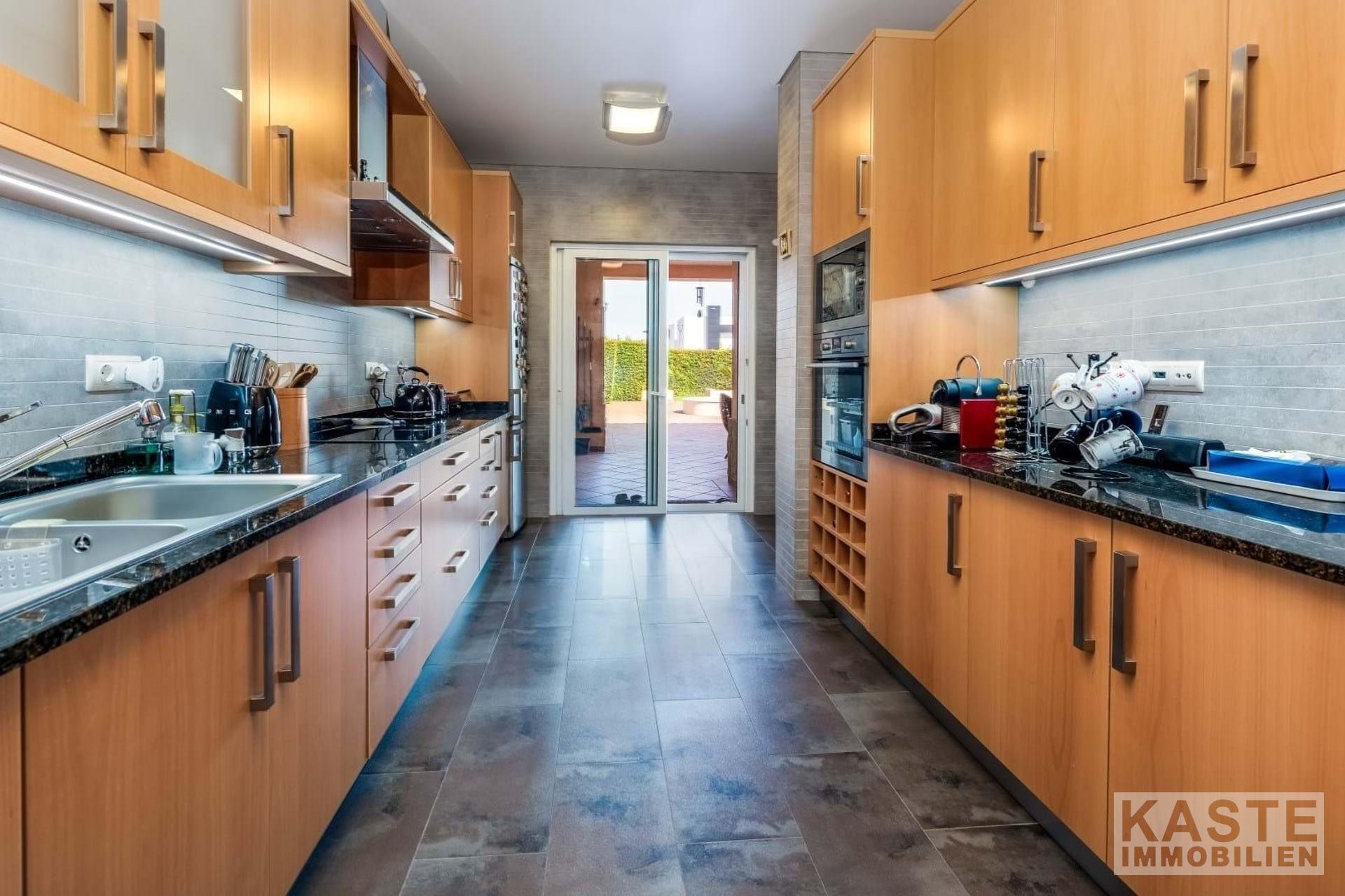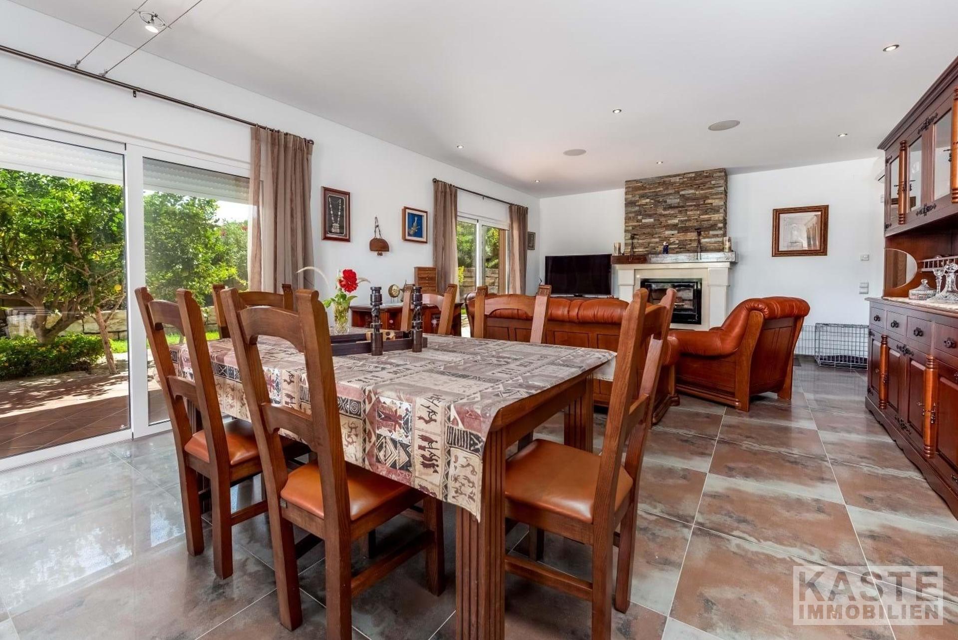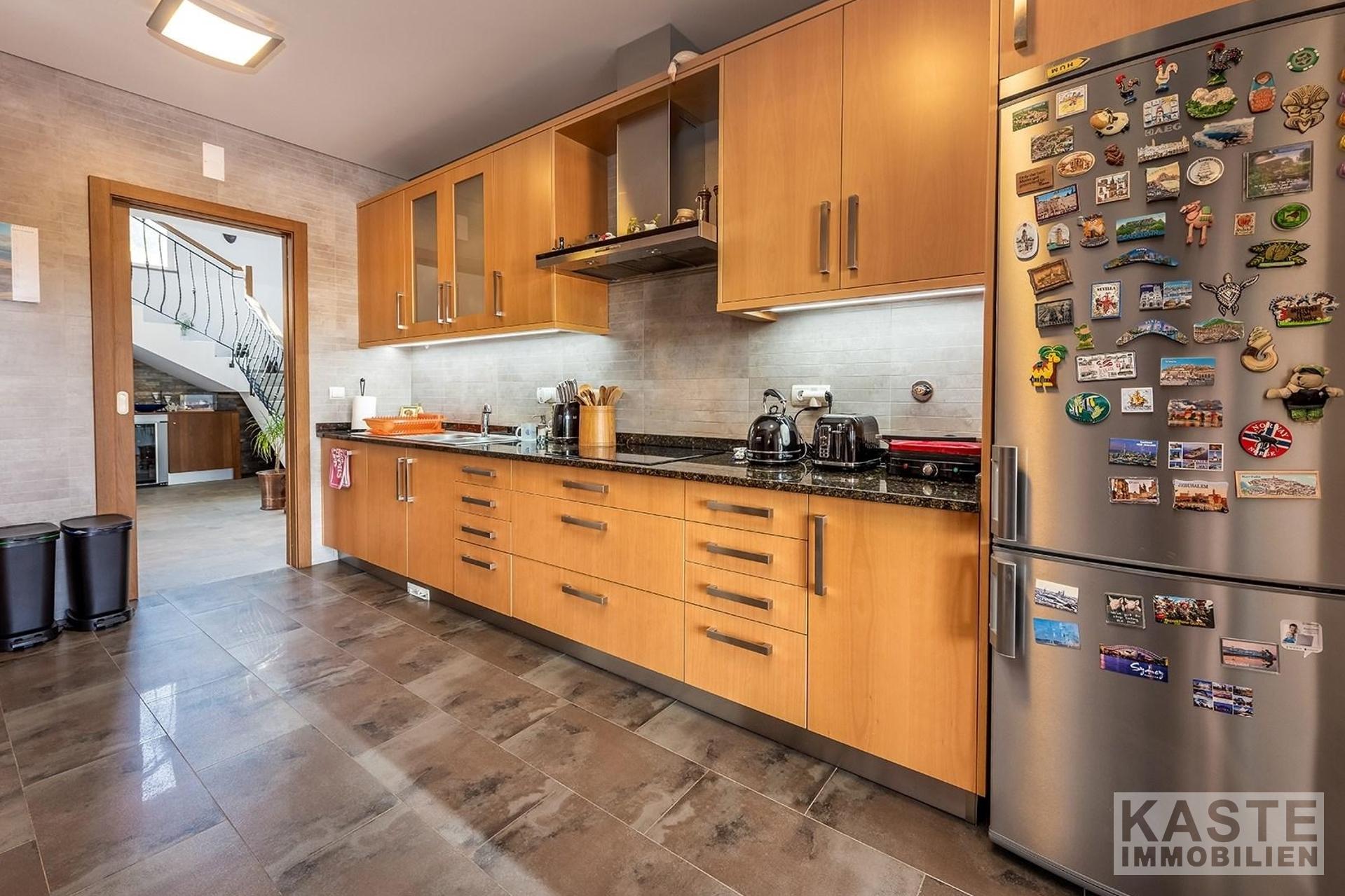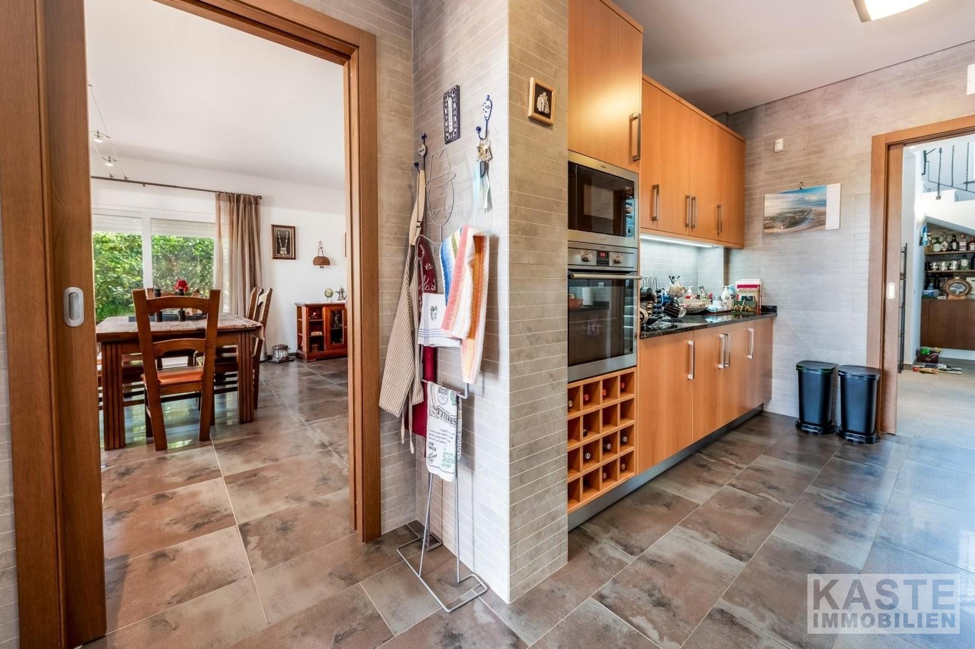 Das großzügige Wohn-Esszimmer beeindruckt mit dreifachen Terrassentüren, die direkten Zugang zum Pool und einem schattigen Essbereich im Freien bieten. Ein geschlossener Kamin mit dekorativem Schornstein und eine zentrale Musikanlage tragen zur gemütlichen Atmosphäre bei. Die Küche, von zwei Seiten erreichbar, präsentiert sich im Stil einer Pantry und ist mit hochwertigen Geräten sowie zahlreichen Wand- und Unterschränken ausgestattet. Unmittelbar vor der Küche finden Sie die Sommerküche mit Grill und Vorbereitungsbereich, die sich ideal für kulinarische Kreationen im Freien eignet.