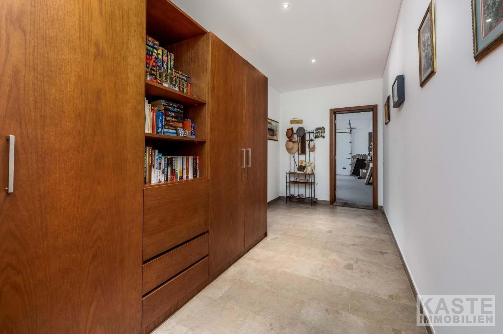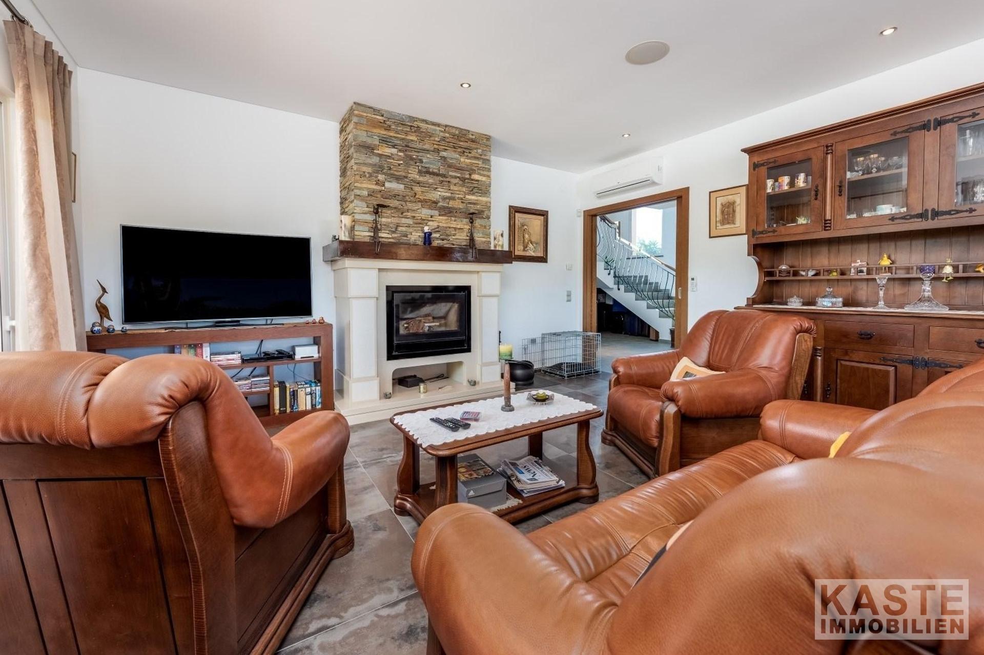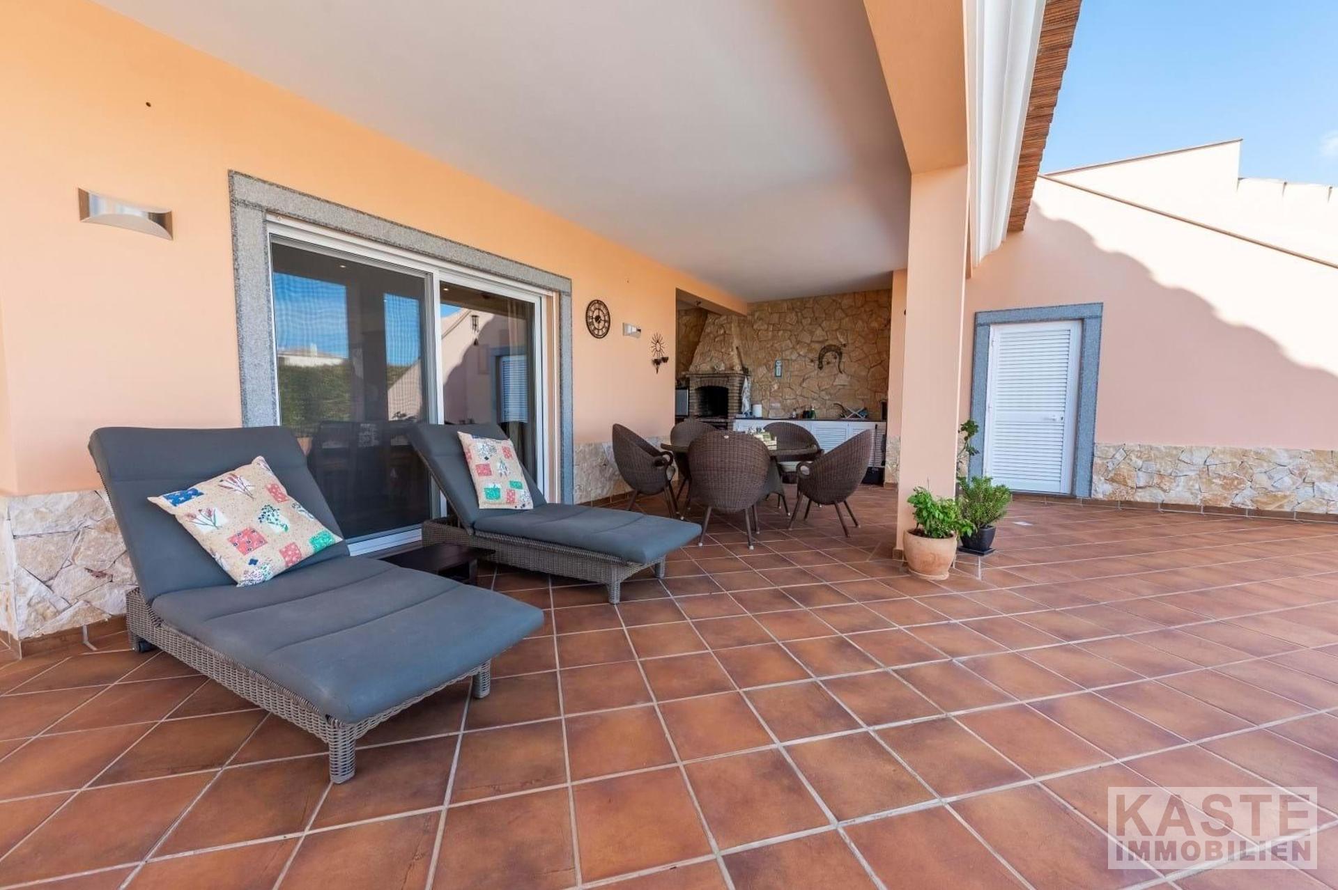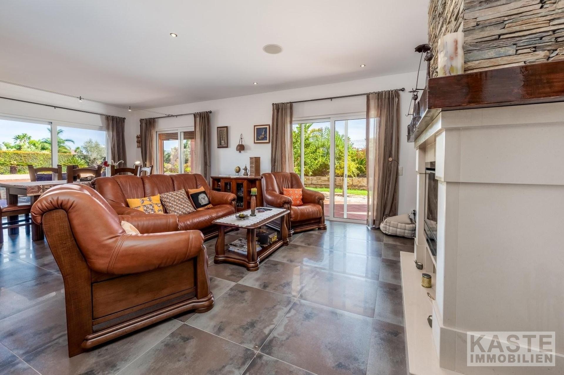 Das großzügige Wohn-Esszimmer beeindruckt mit dreifachen Terrassentüren, die direkten Zugang zum Pool und einem schattigen Essbereich im Freien bieten. Ein geschlossener Kamin mit dekorativem Schornstein und eine zentrale Musikanlage tragen zur gemütlichen Atmosphäre bei. Die Küche, von zwei Seiten erreichbar, präsentiert sich im Stil einer Pantry und ist mit hochwertigen Geräten sowie zahlreichen Wand- und Unterschränken ausgestattet. Unmittelbar vor der Küche finden Sie die Sommerküche mit Grill und Vorbereitungsbereich, die sich ideal für kulinarische Kreationen im Freien eignet.