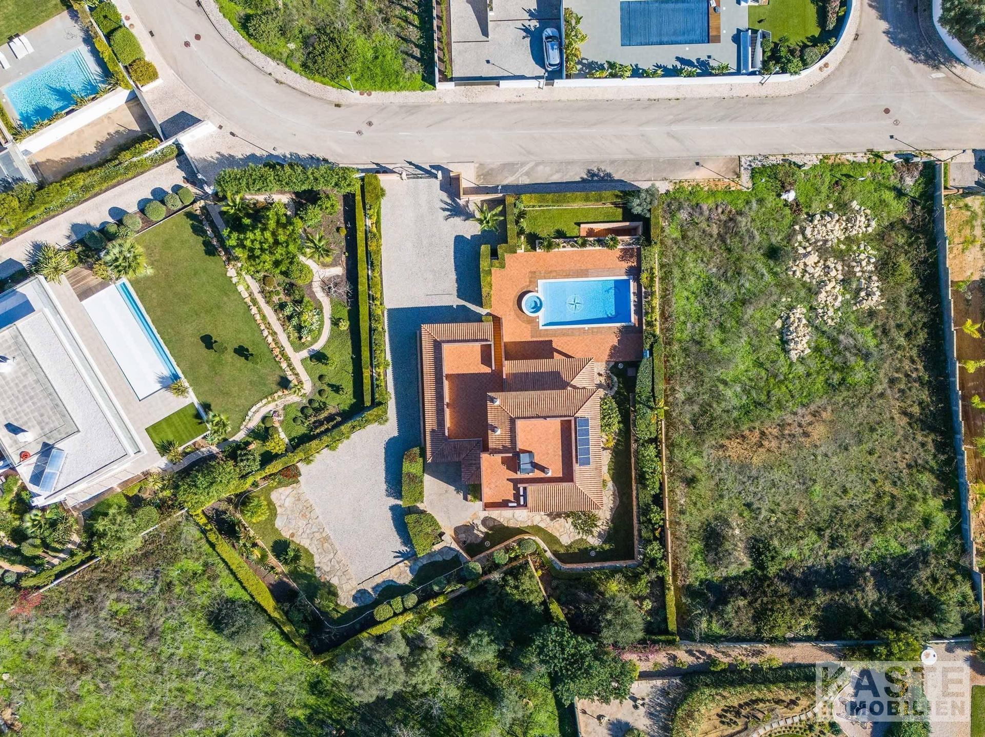 Die Villa ist vollständig eingezäunt und bietet einen Eingangsbereich mit elektrischen Doppeltoren für Fahrzeuge sowie ein zusätzliches Seitentor für Fußgänger. Die Auffahrt und die Gästeparkplätze sind mit Kalksteinpflaster belegt. Der kunstvoll gestaltete Garten ist pflegeleicht und verfügt über eine automatische Bewässerungsanlage, eine Vielzahl von Obstbäumen und einheimischen Sträuchern, die das Anwesen umrahmen.