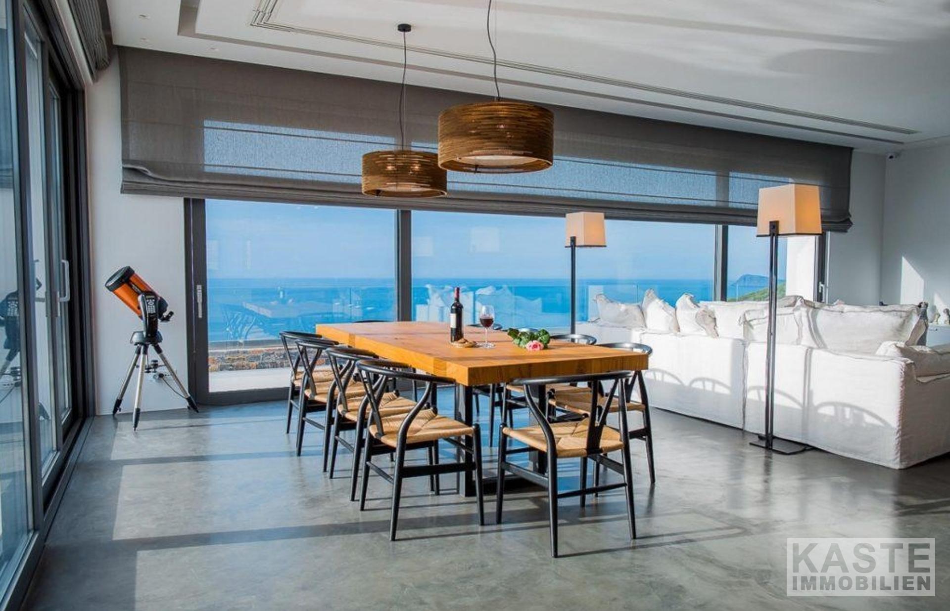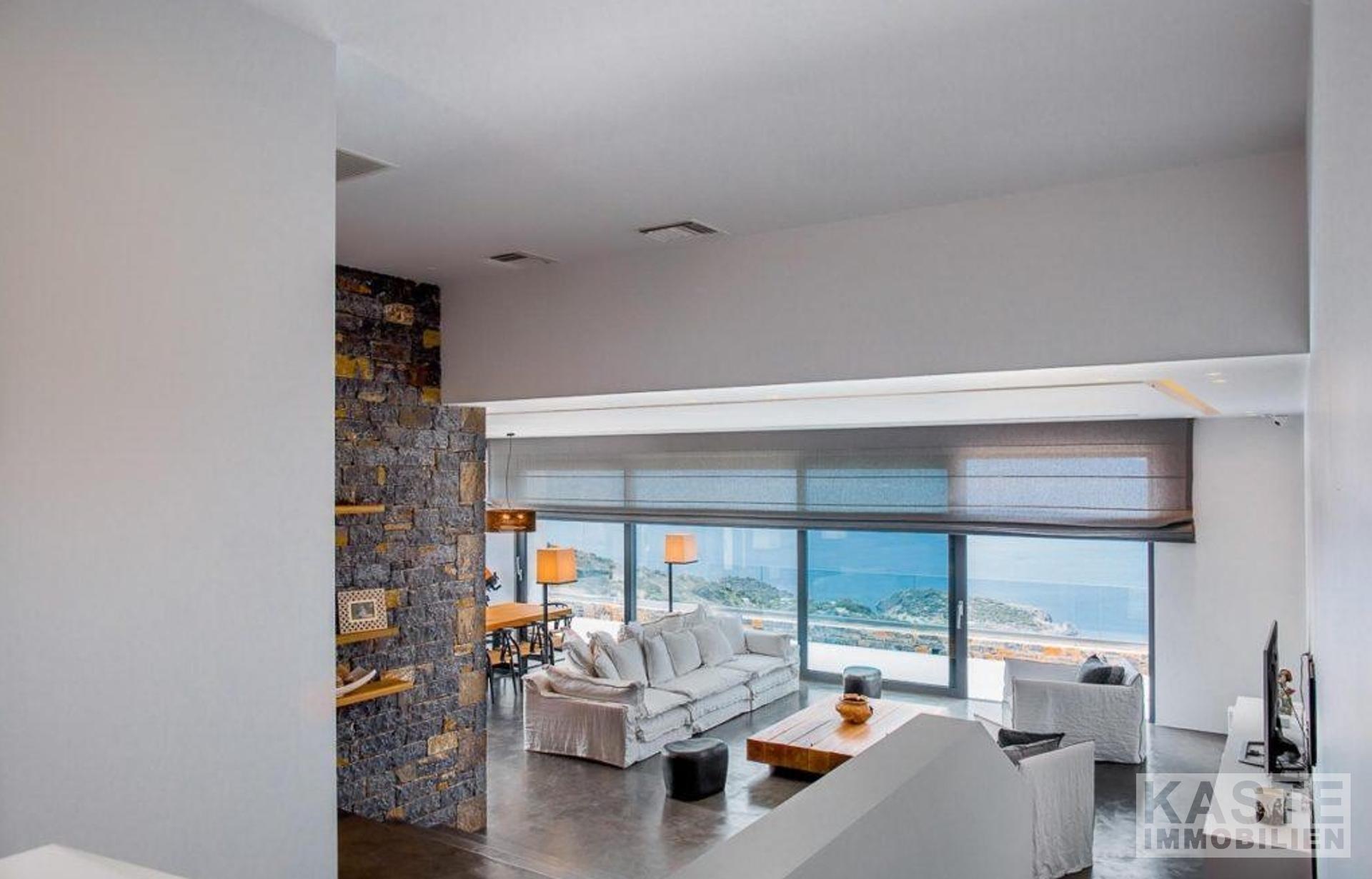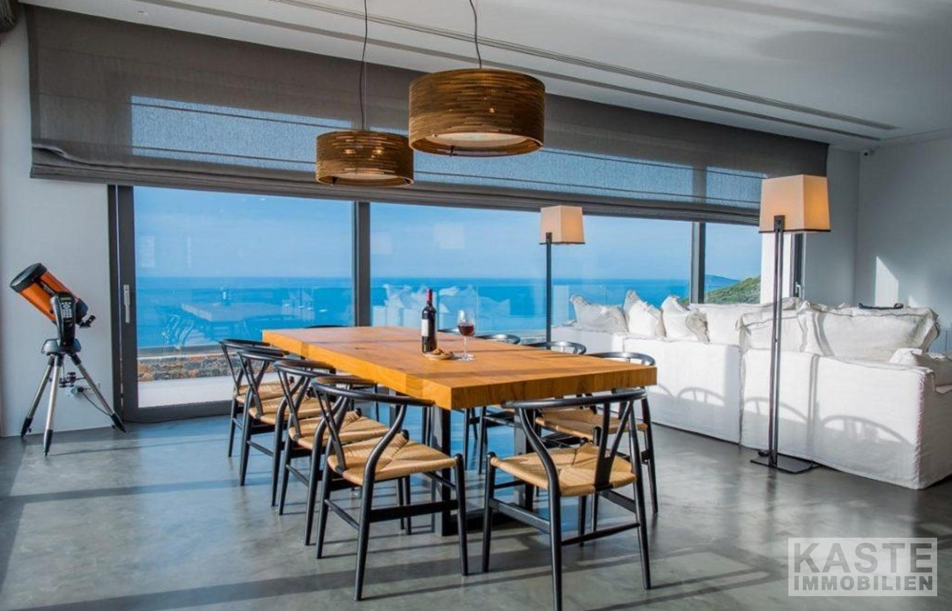 Außerdem gibt es ein geräumiges, offenes Wohnzimmer mit einer voll ausgestatteten modernen Küche und einem Essbereich, der von großen Glasfenstern umgeben ist, die eine unglaubliche Aussicht bieten.
