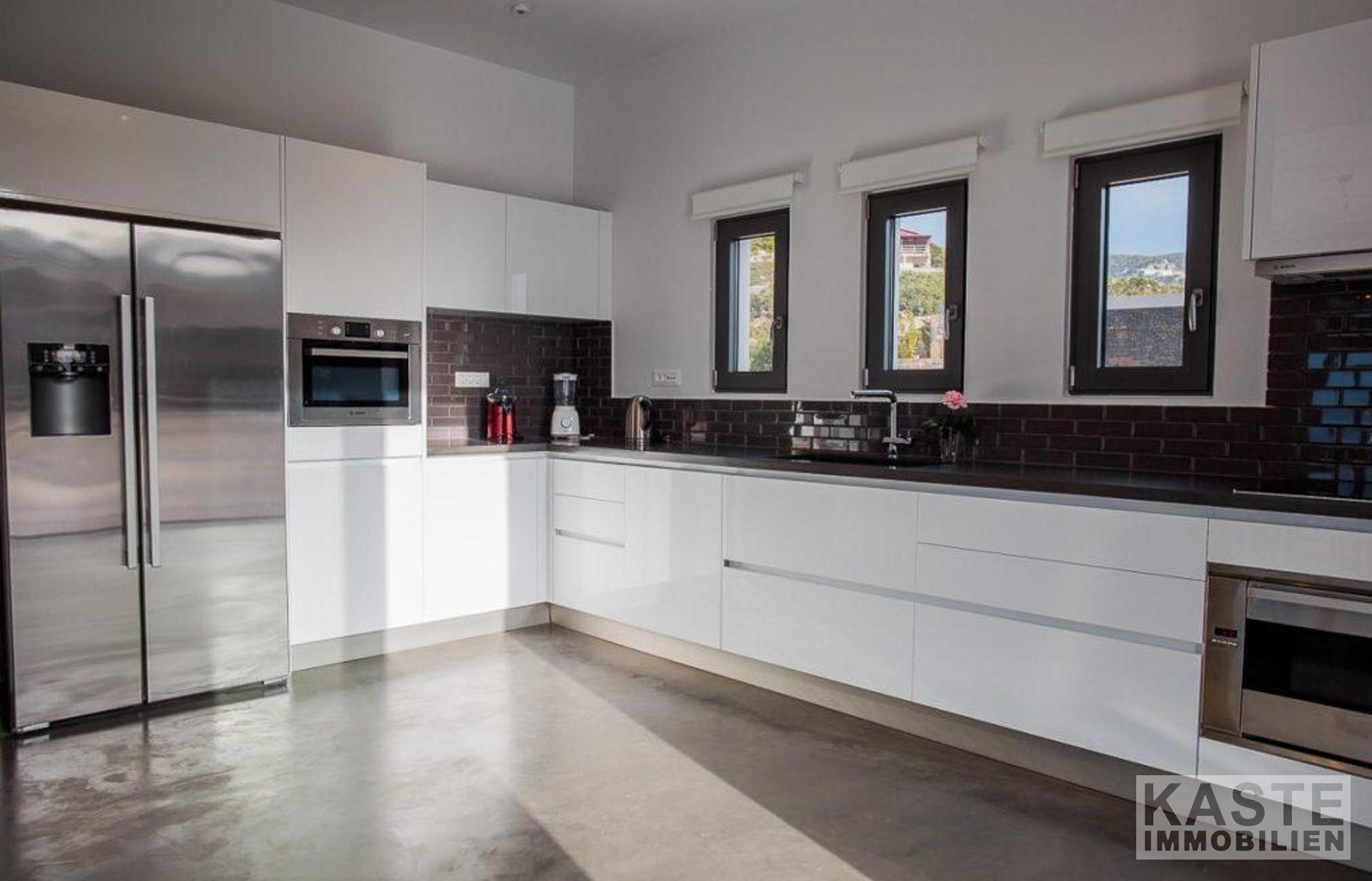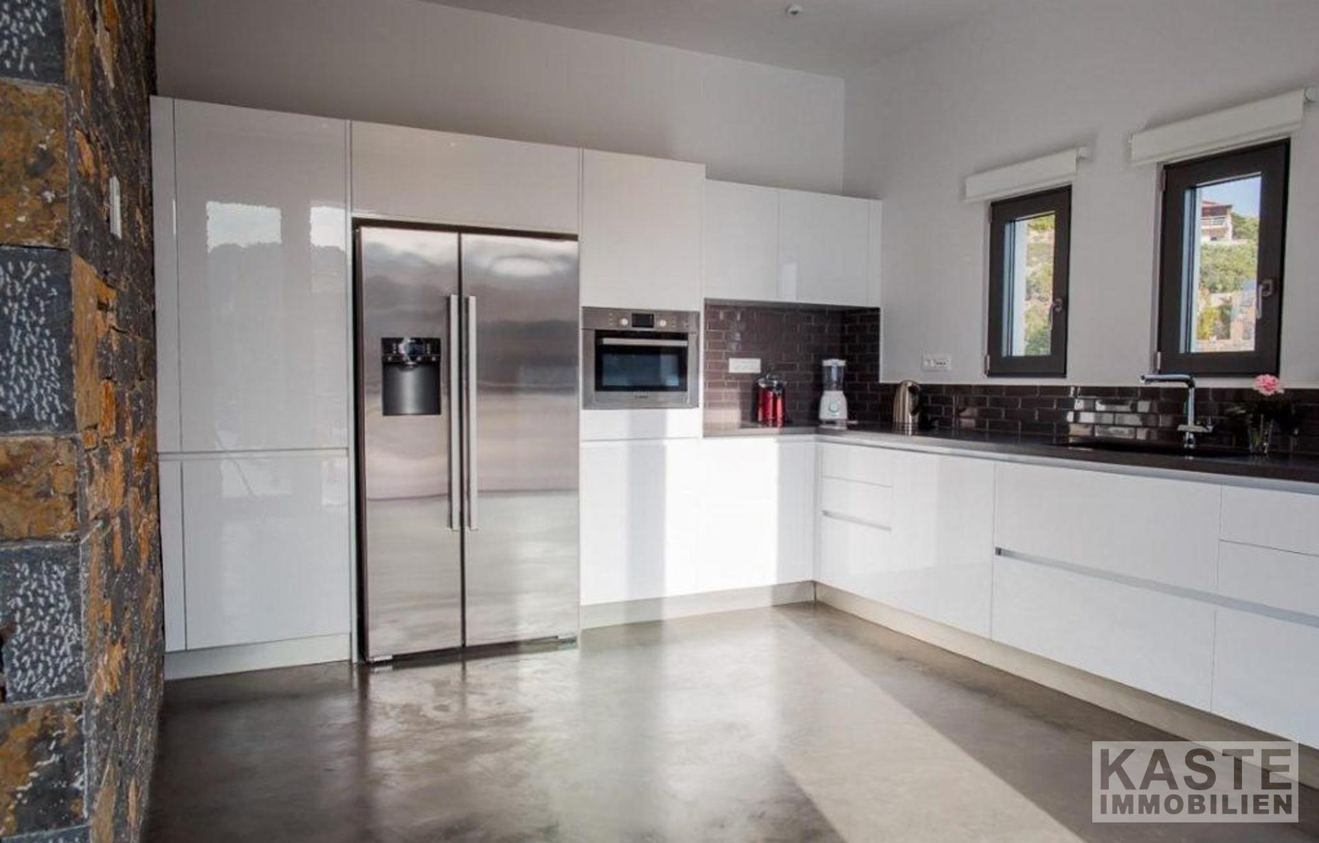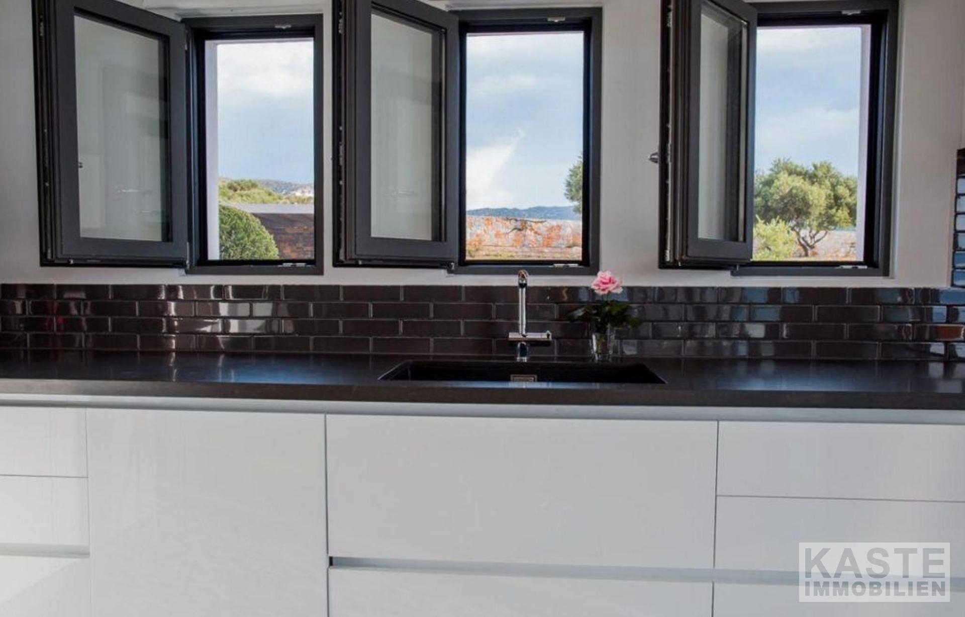 Außerdem gibt es ein geräumiges, offenes Wohnzimmer mit einer voll ausgestatteten modernen Küche und einem Essbereich, der von großen Glasfenstern umgeben ist, die eine unglaubliche Aussicht bieten.