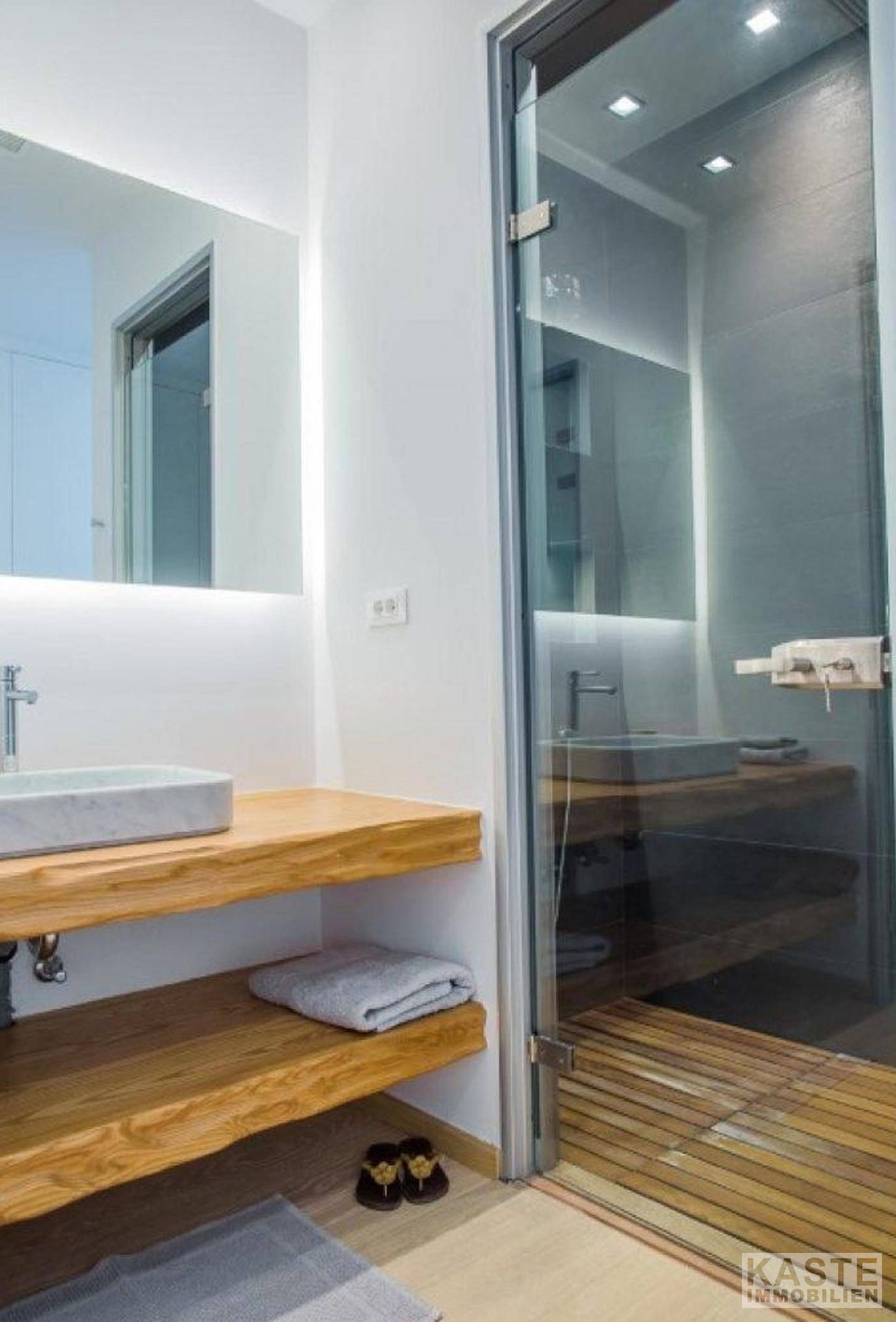 Eine kleine Innentreppe führt in die zweite Etage, wo sich das Hauptschlafzimmer befindet. Auf der unteren Ebene befindet sich ein zweites Wohnzimmer, das als Spielzimmer mit einem Heimkino-System genutzt wird. Das geräumige Wohnzimmer im Erdgeschoss ist von Balkontüren umgeben, die auf Sonnenterrassen mit einem 90 qm großen Infinity-Pool und einem überdachten Essbereich am Pavillon führen.