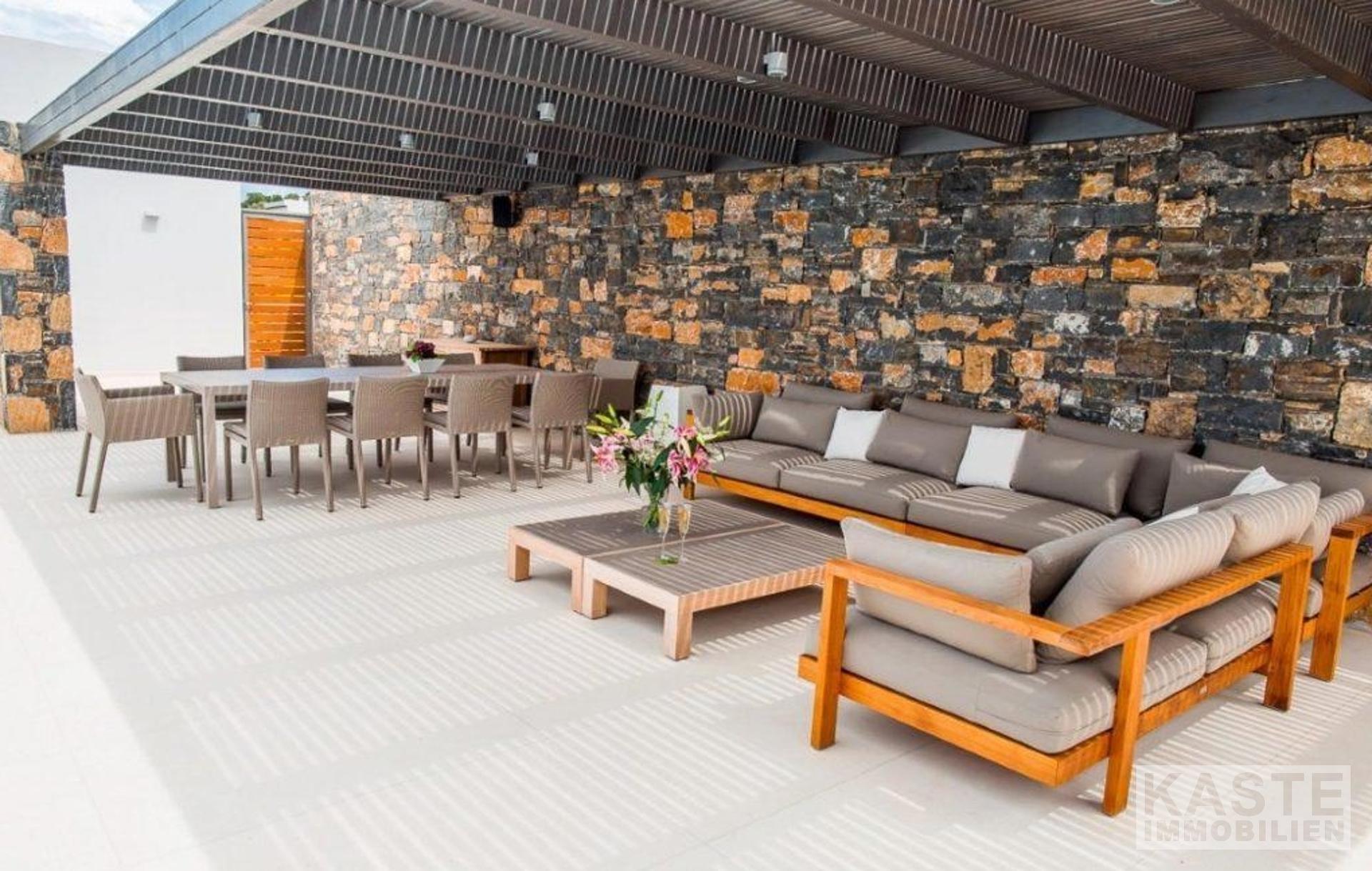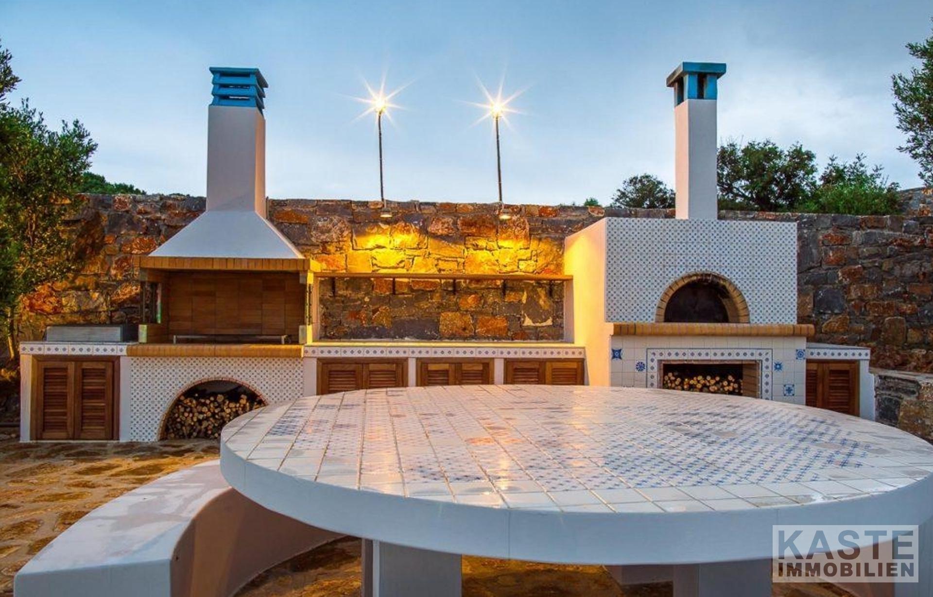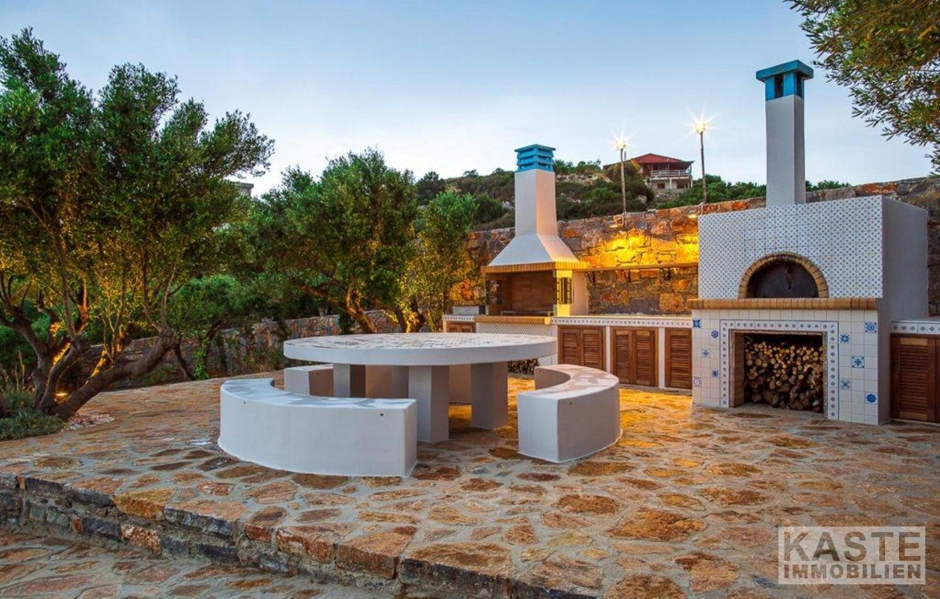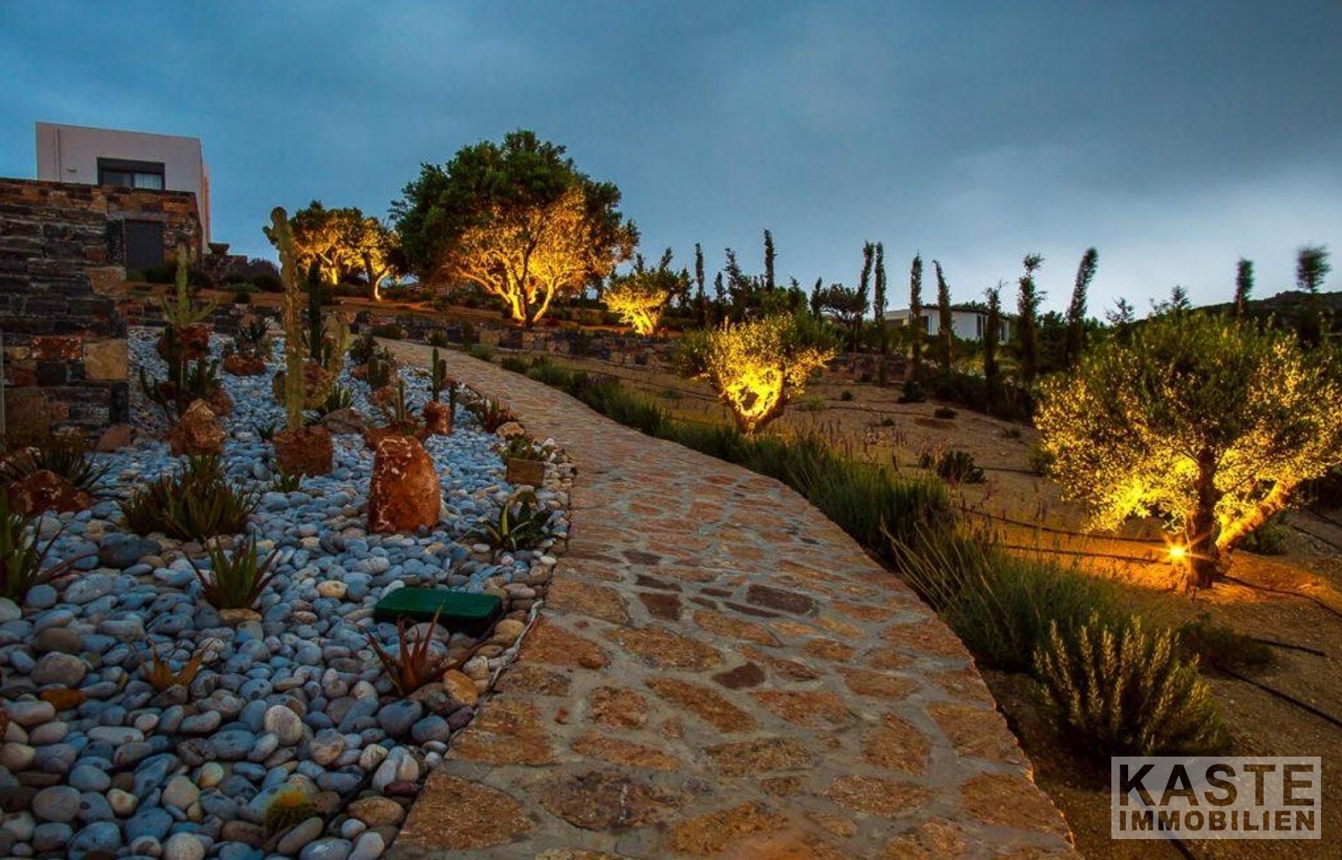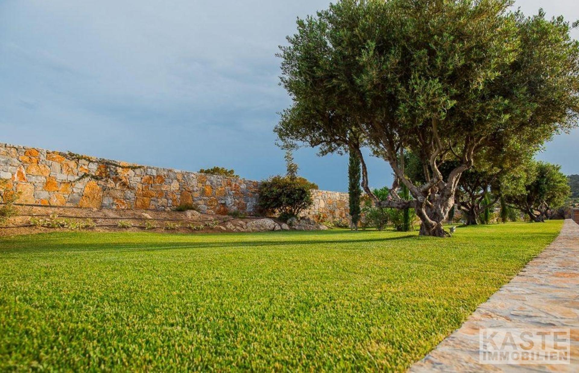 Das Grundstück umfasst eine Fläche von 6500 qm mit Olivenbäumen, Rasenflächen, jungem Obstgarten, Blumen, Grillplatz und Kaktusgarten. Das Grundstück ist mit Steinmauern, Beleuchtung und automatischen Toren eingezäunt.