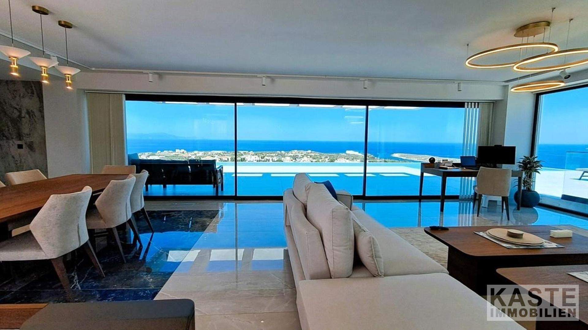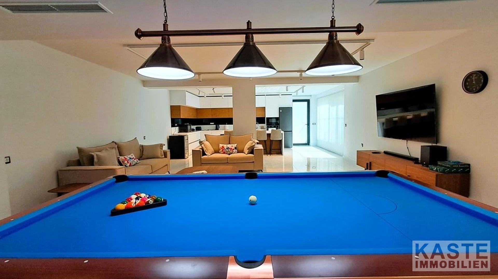 Das offene Raumkonzept im Erdgeschoss verschmilzt Wohn-, Ess- und Küchenbereiche durch raumhohe Glasschiebetüren nahtlos mit dem Außenbereich. Im ersten Stock erwartet Sie ein zweiter Wohnraum, der vielseitige Nutzungsmöglichkeiten als Bibliothek oder Lounge bietet, ergänzt von zwei Schlafzimmern mit Balkonen und unvergleichlichem Meerblick. Ein luxuriöser Whirlpool sowie ein Spielzimmer mit Billardtisch im Untergeschoss runden den hochwertigen Innenausbau ab.