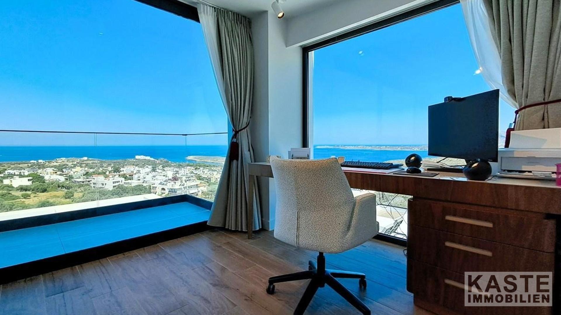 Die Villa beeindruckt mit fünf Schlafzimmern, von denen vier jeweils mit einem eigenen, hochwertigen Badezimmer ausgestattet sind, wodurch maximaler Komfort und Privatsphäre garantiert werden. Ein weiteres Schlafzimmer mit eigenem Bad befindet sich im Untergeschoss, das einen separaten Eingang zur Verfügung stellt – ideal für Gäste oder familiäre Rückzugsmöglichkeiten. Jeder Schlafraum bietet einen atemberaubenden Panoramablick auf das funkelnde kretische Meer.