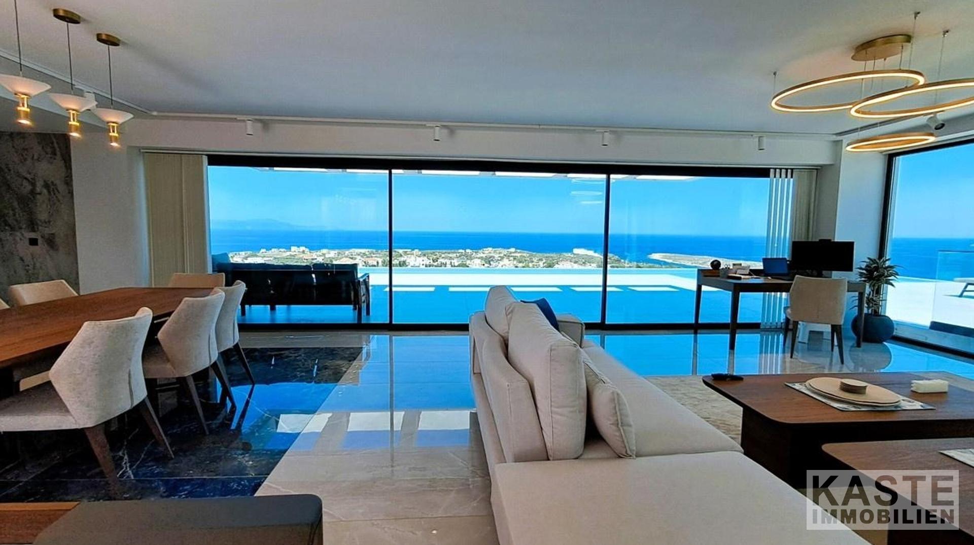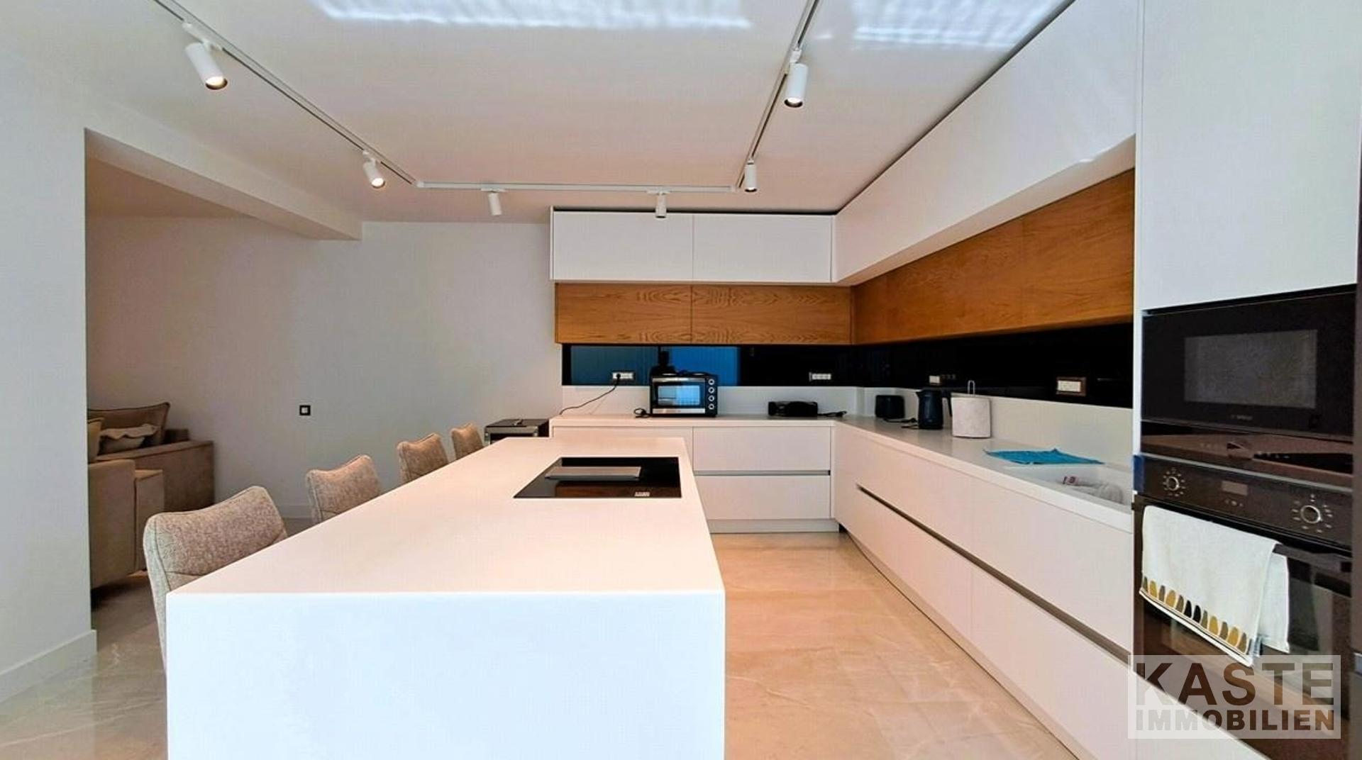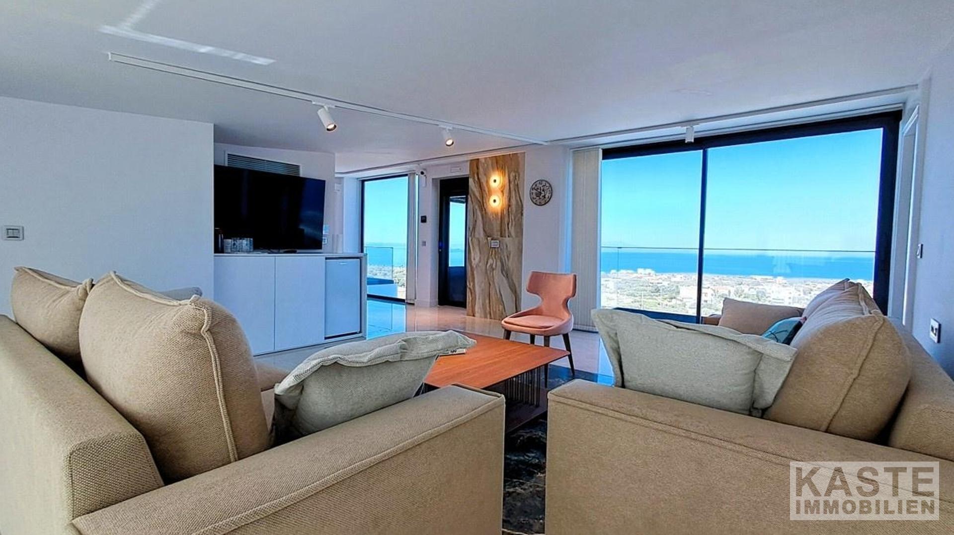 Das offene Raumkonzept im Erdgeschoss verschmilzt Wohn-, Ess- und Küchenbereiche durch raumhohe Glasschiebetüren nahtlos mit dem Außenbereich. Im ersten Stock erwartet Sie ein zweiter Wohnraum, der vielseitige Nutzungsmöglichkeiten als Bibliothek oder Lounge bietet, ergänzt von zwei Schlafzimmern mit Balkonen und unvergleichlichem Meerblick. Ein luxuriöser Whirlpool sowie ein Spielzimmer mit Billardtisch im Untergeschoss runden den hochwertigen Innenausbau ab.