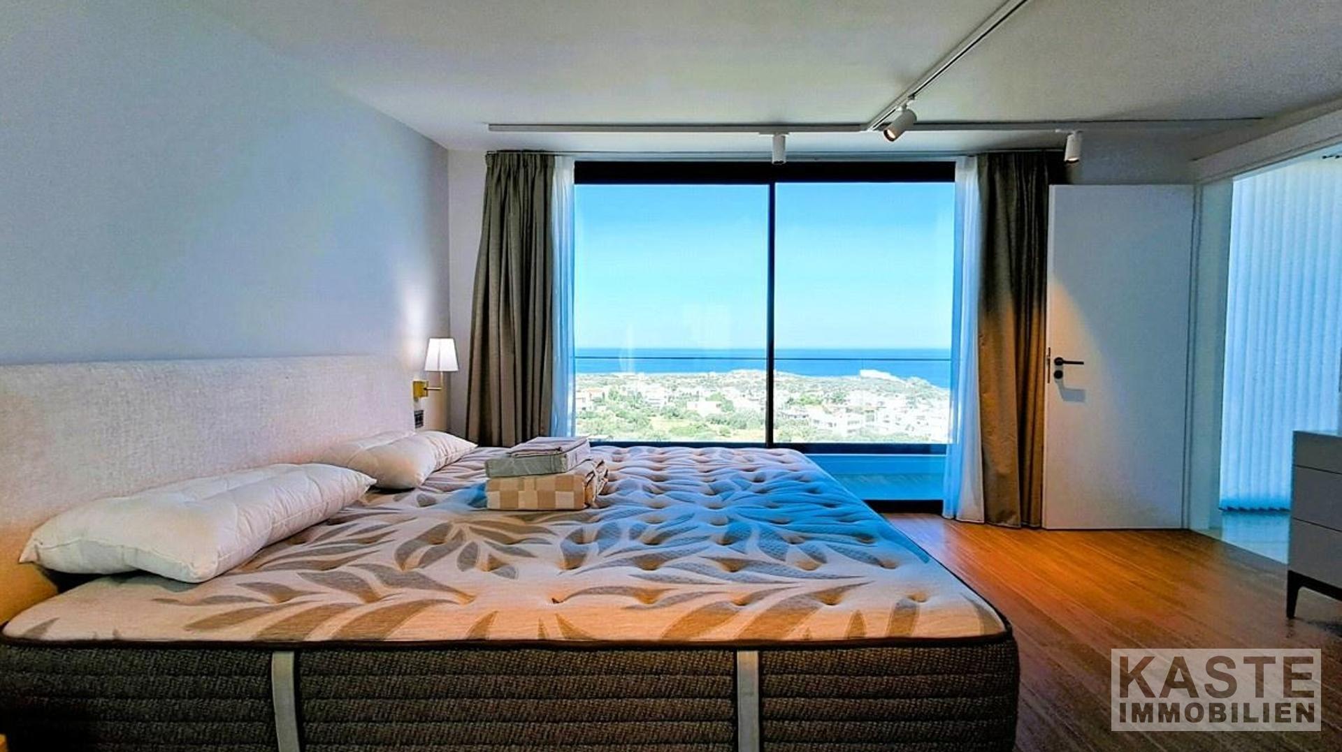 Die Villa beeindruckt mit fünf Schlafzimmern, von denen vier jeweils mit einem eigenen, hochwertigen Badezimmer ausgestattet sind, wodurch maximaler Komfort und Privatsphäre garantiert werden. Ein weiteres Schlafzimmer mit eigenem Bad befindet sich im Untergeschoss, das einen separaten Eingang zur Verfügung stellt – ideal für Gäste oder familiäre Rückzugsmöglichkeiten. Jeder Schlafraum bietet einen atemberaubenden Panoramablick auf das funkelnde kretische Meer.