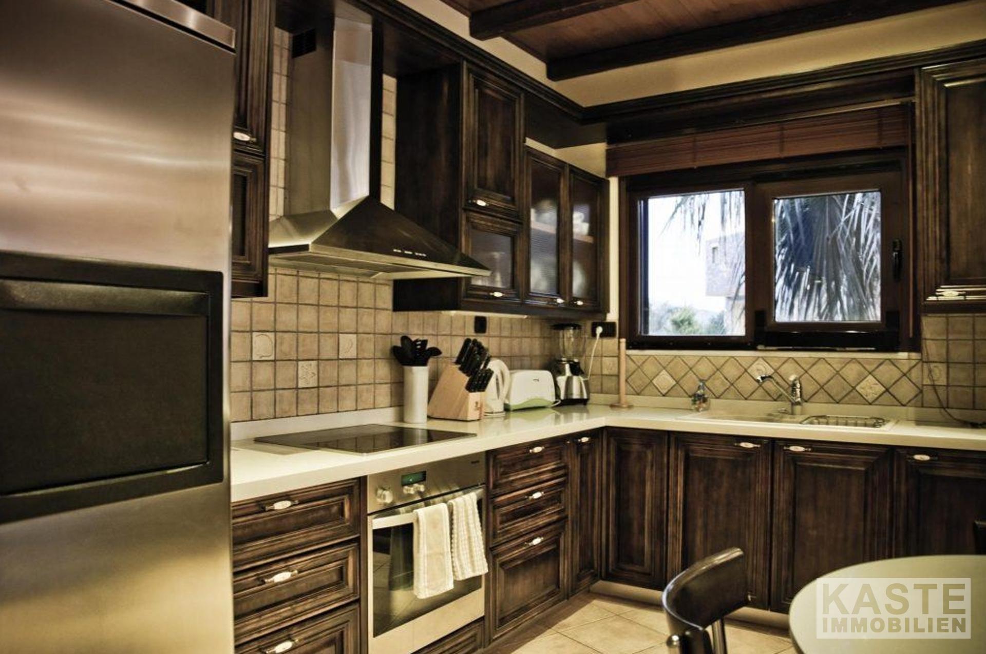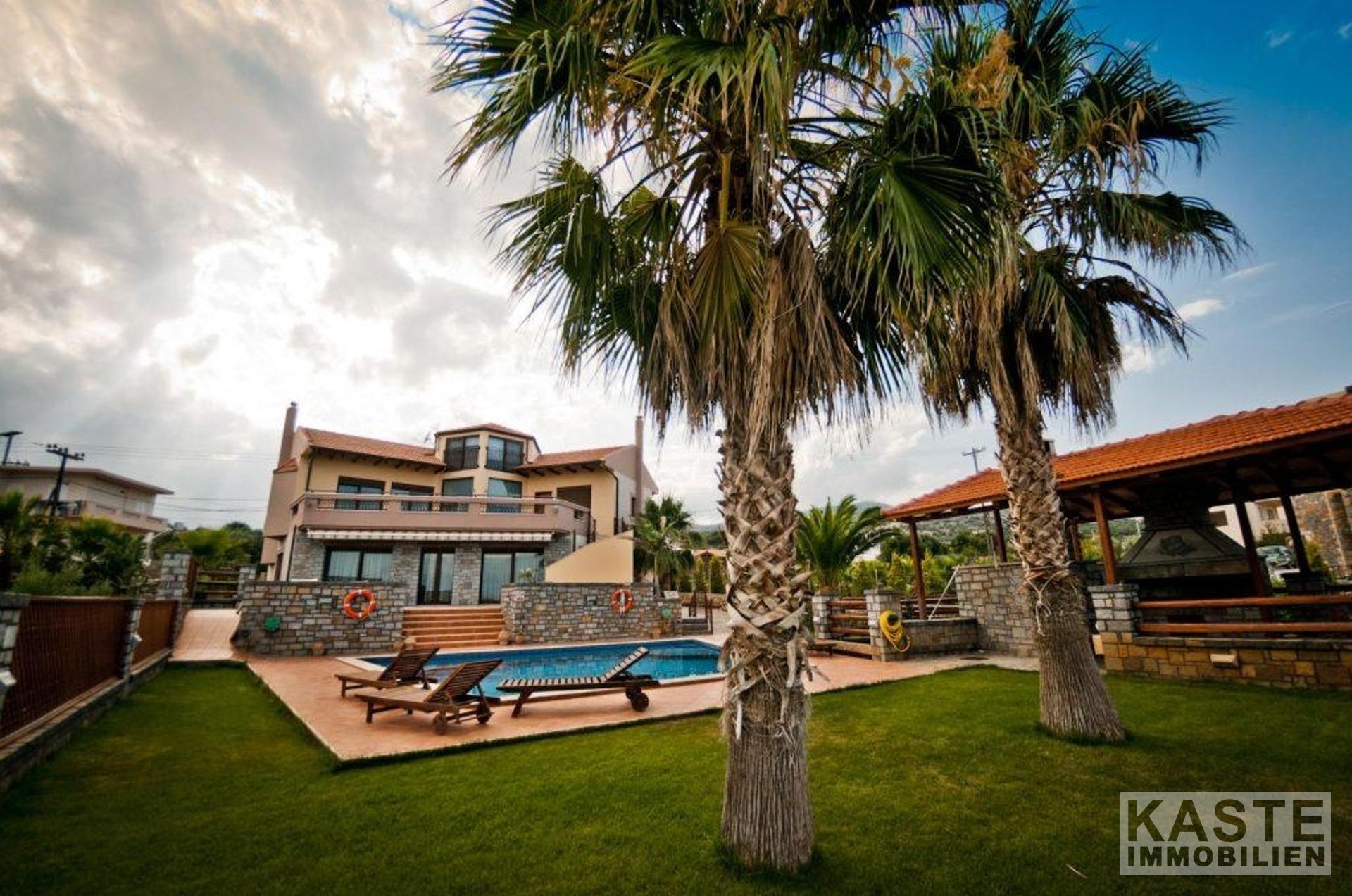 Bodentiefe Glasschiebeelemente führen vom Wohnbereich auf die große möblierte Veranda mit Blick auf den Pool in Mosaikdisign und den Garten. Der Pool mit Whirlpool und einer Gegenschwimmanlage, sowie die bequemen Sonnenliegen schaffen den idealen Rahmen für viele entspannte Sonnenstunden. Unter der schattigen Pergola finden Sie neben dem Grill einen Steinofen für einen einladenden Tisch mit regionalen Spezialitäten, dazu ein griechischer Wein - eine ideale Kombination einen schönen Strandtag zu beschließen.