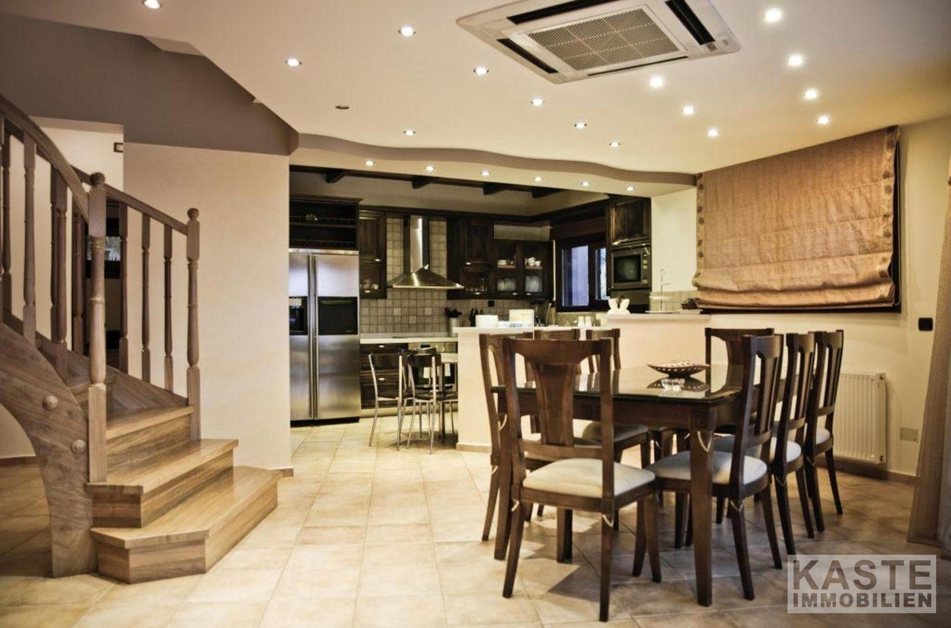Im Erdgeschoss befindet sich ein offener Wohn- und Essbereich mit Kamin für eine harmonische Wohnatmosphäre. Ein Heimkinosystem steht Ihnen für spannende Filmabende mit Freunden und mit der Familie zur Verfügung. Die offene Küche ist mit allen technischen Geräten voll ausgestattet.