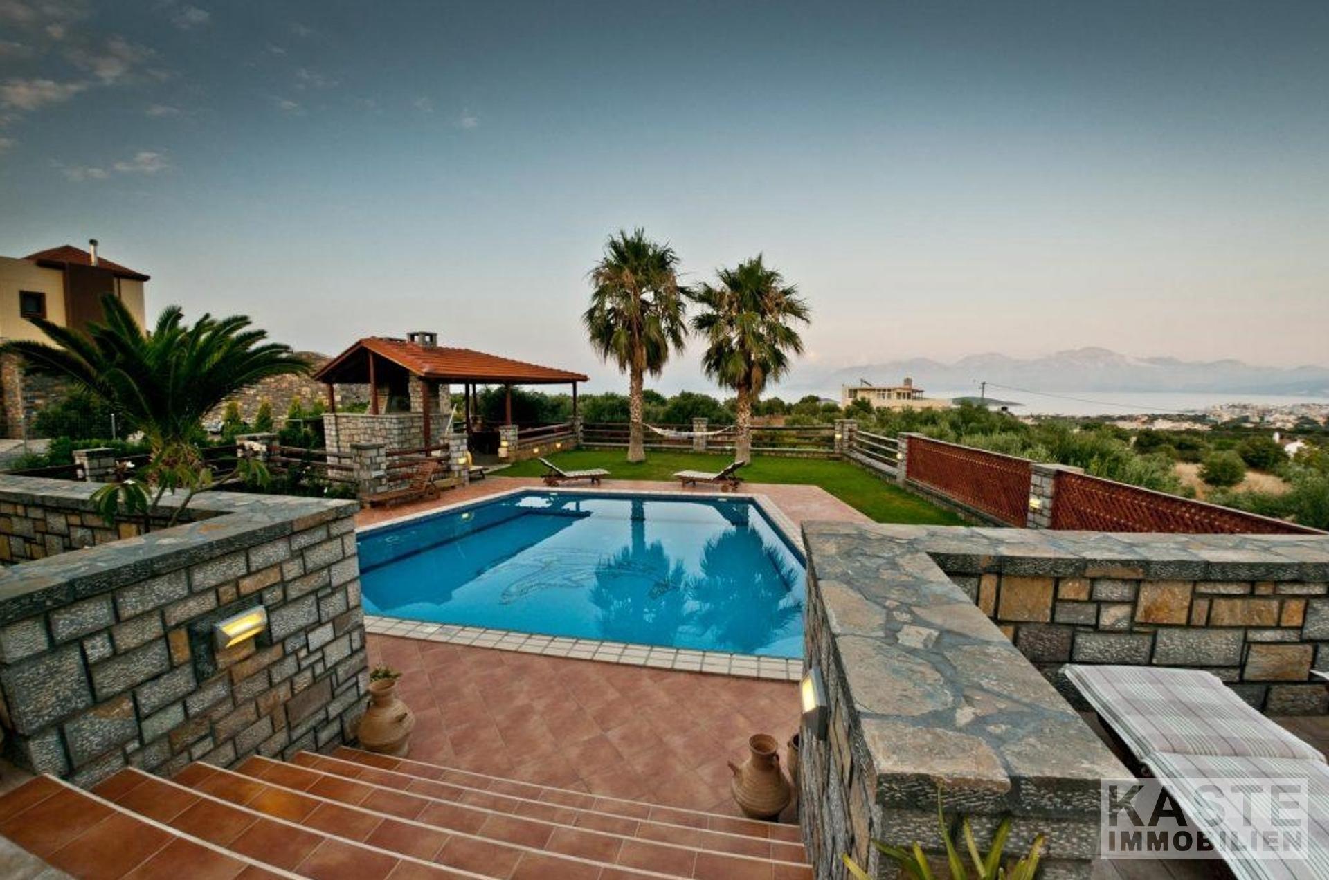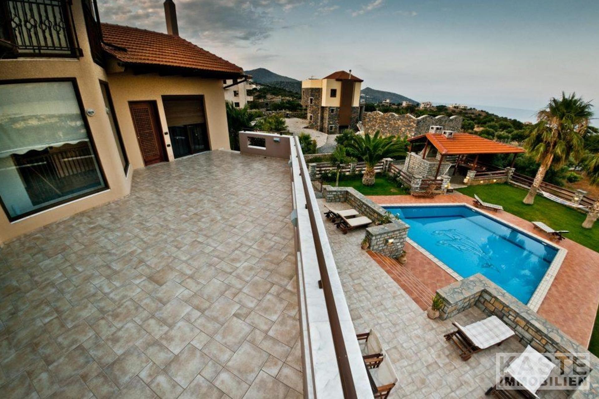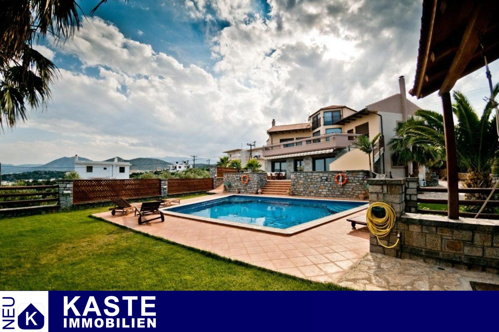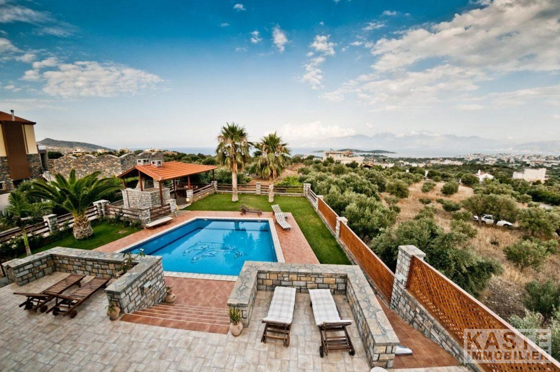 Die luxuriöse Villa mit 4 Schlafzimmern in Hanglage bietet einen herrlichen Panoramablick auf die malerische Hafenstadt Agios Nikolaos und das türkisblaue Wasser der Mirabello-Bucht.