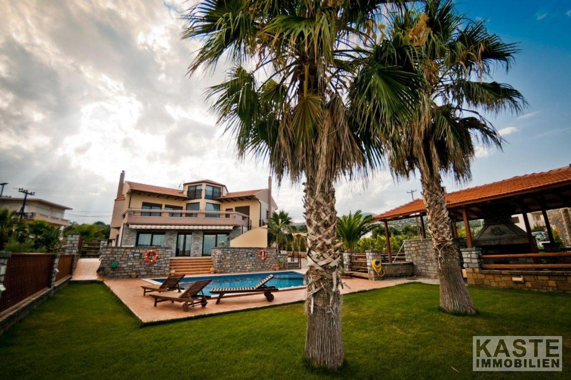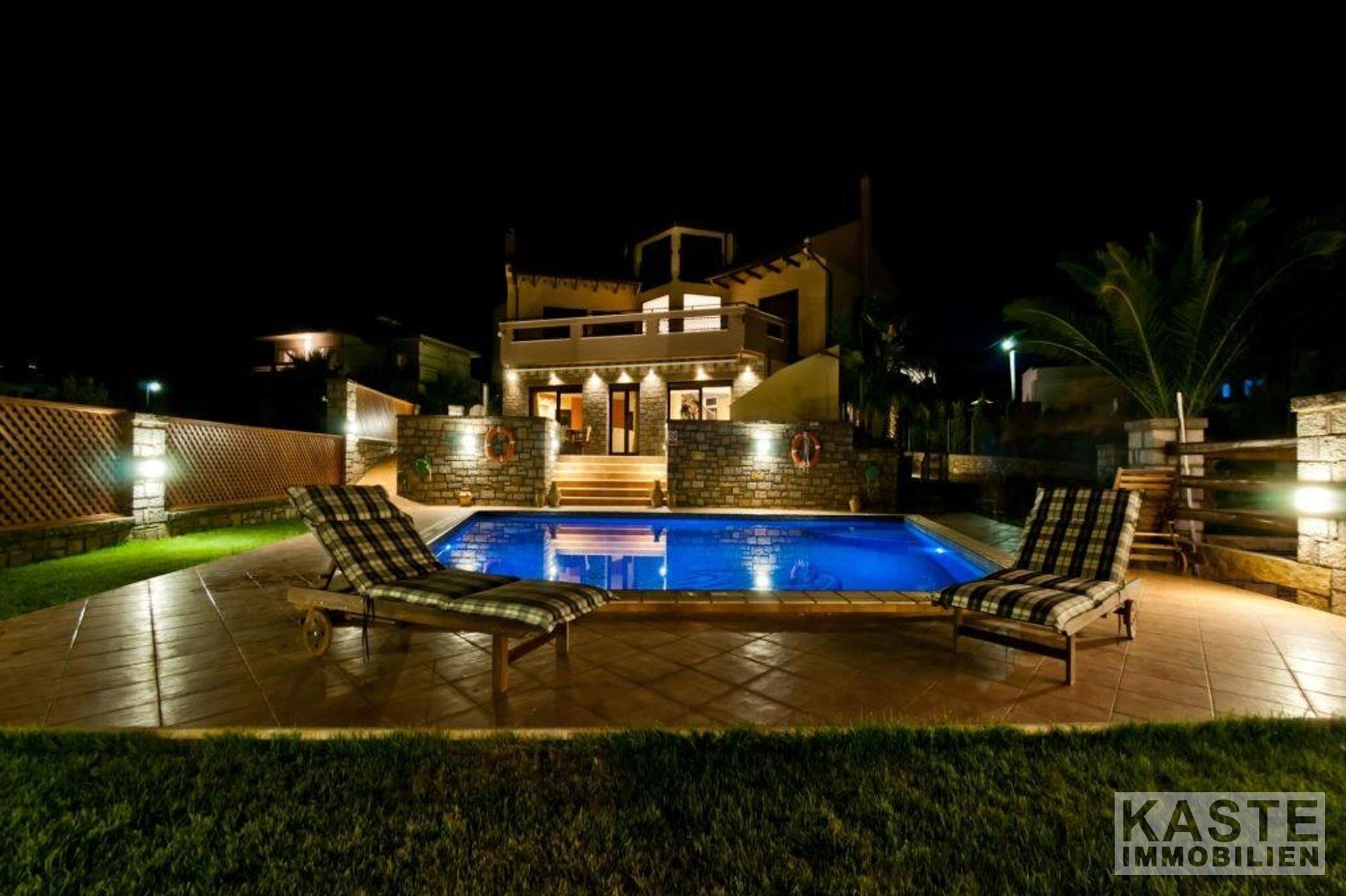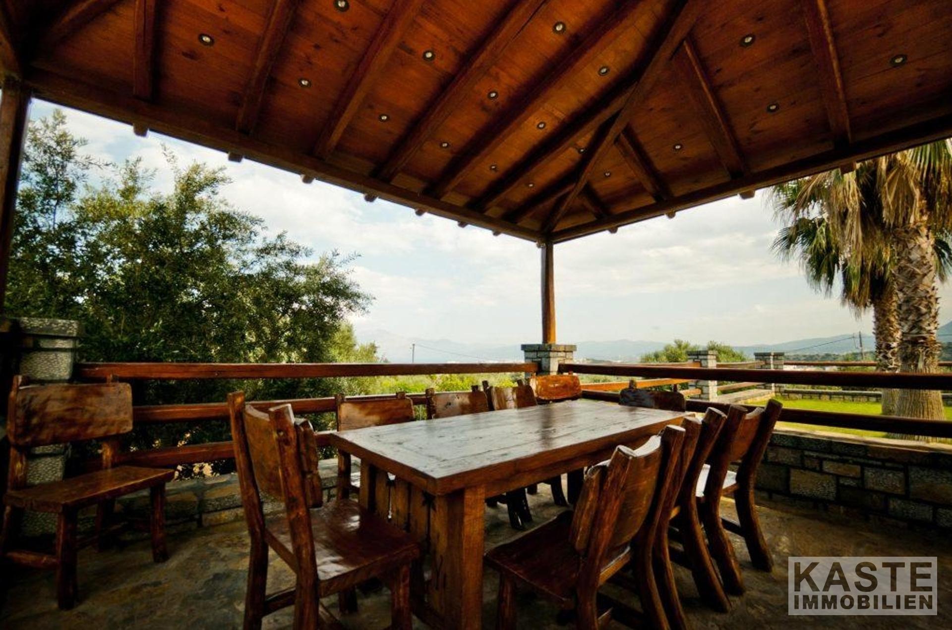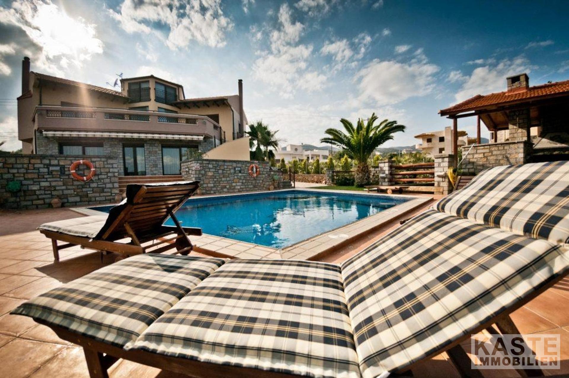 Bodentiefe Glasschiebeelemente führen vom Wohnbereich auf die große möblierte Veranda mit Blick auf den Pool in Mosaikdisign und den Garten. Der Pool mit Whirlpool und einer Gegenschwimmanlage, sowie die bequemen Sonnenliegen schaffen den idealen Rahmen für viele entspannte Sonnenstunden. Unter der schattigen Pergola finden Sie neben dem Grill einen Steinofen für einen einladenden Tisch mit regionalen Spezialitäten, dazu ein griechischer Wein - eine ideale Kombination einen schönen Strandtag zu beschließen.