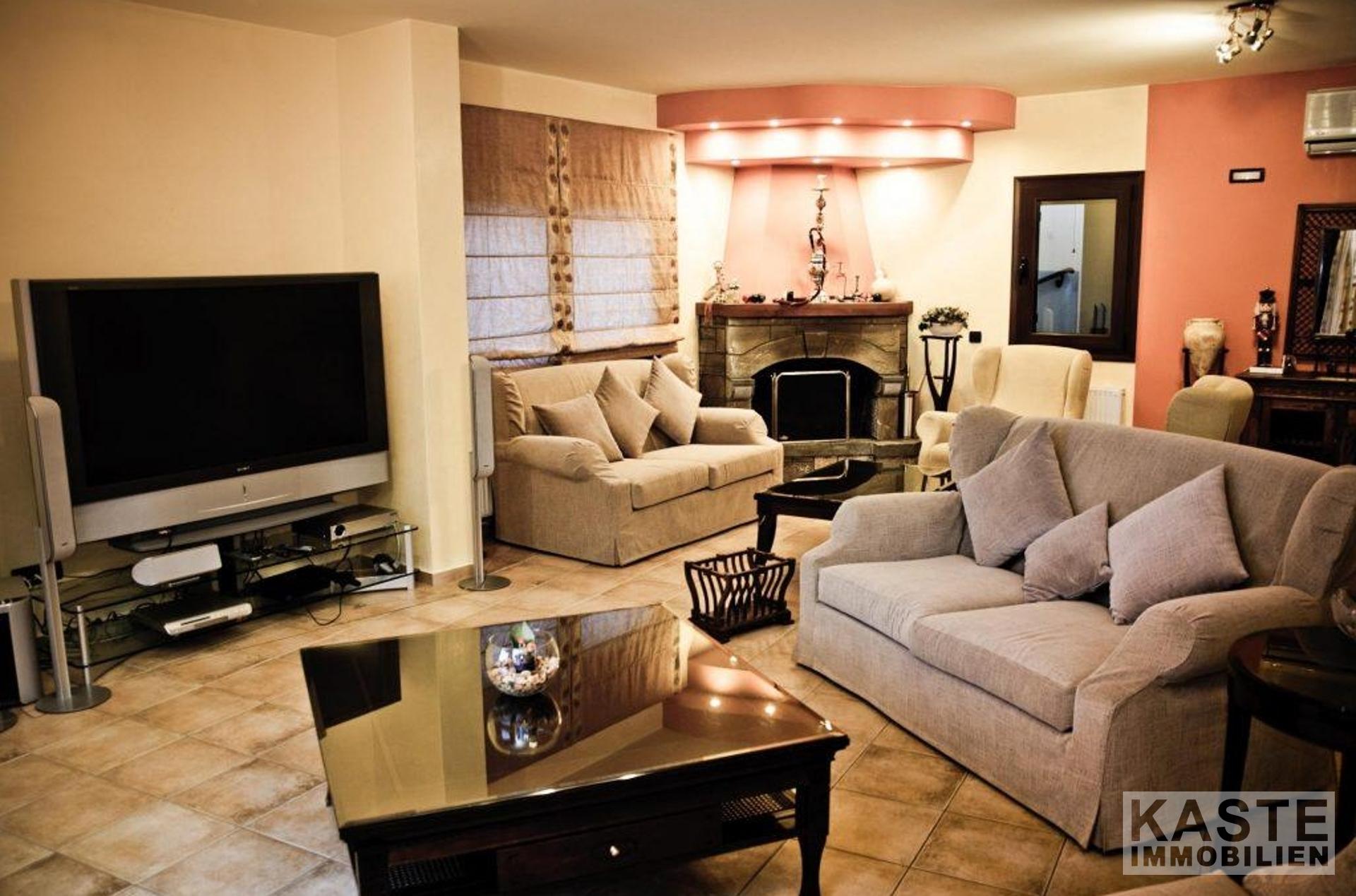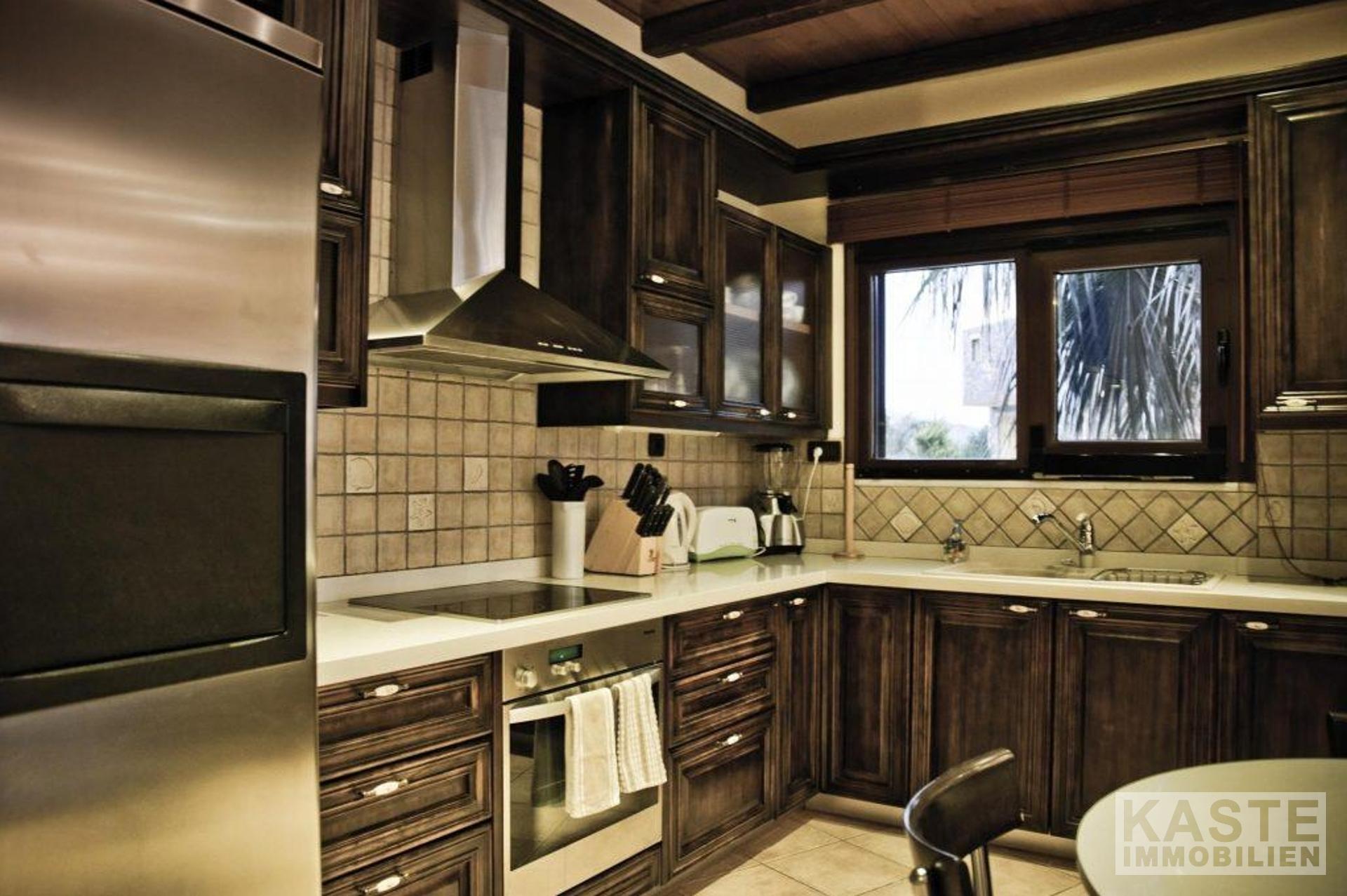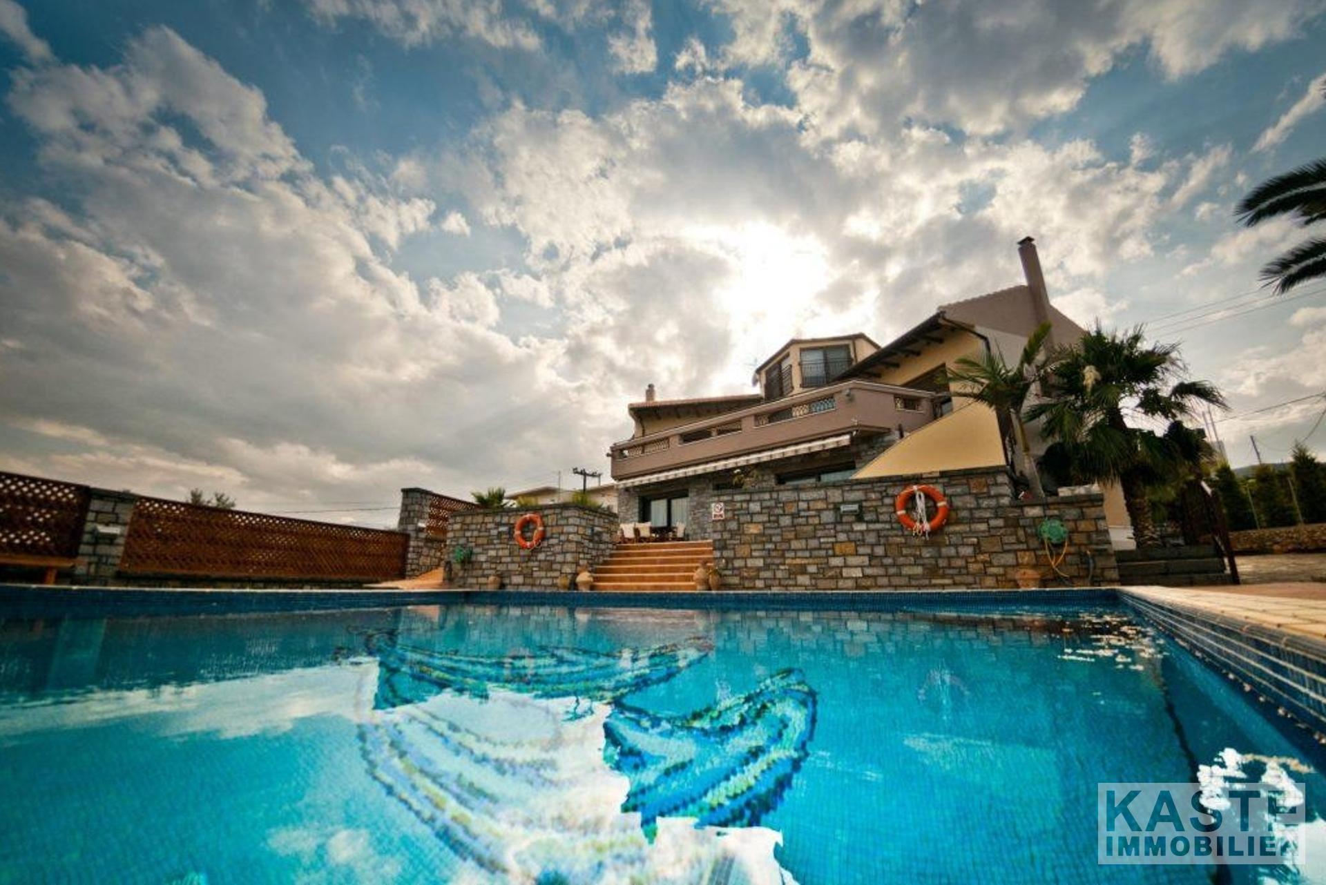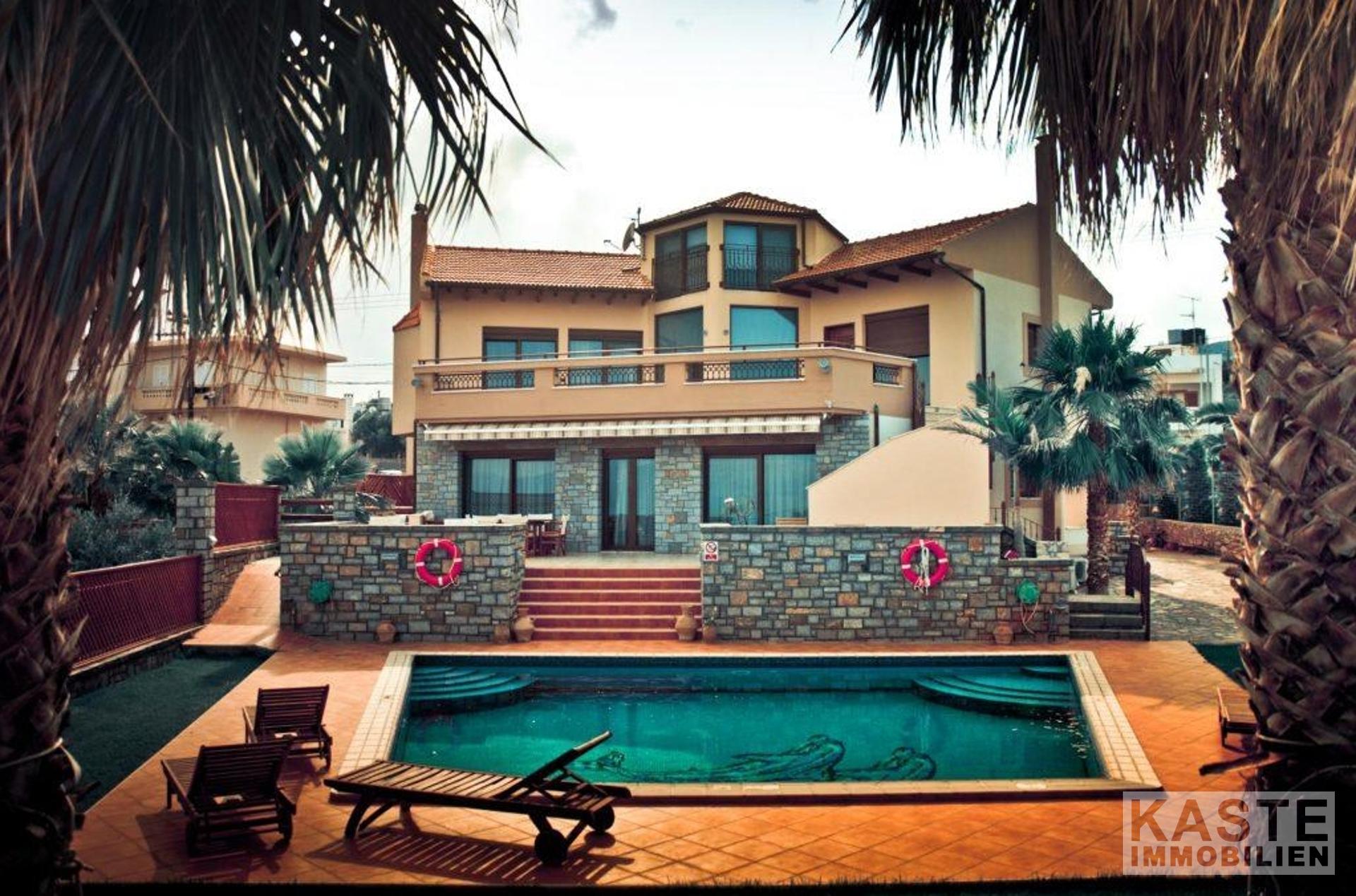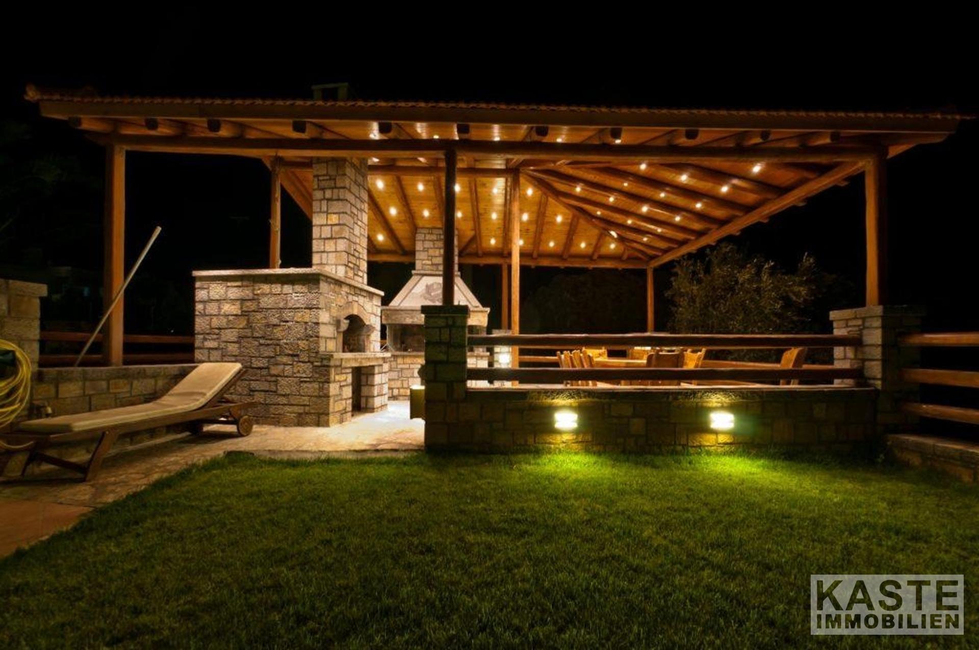Bodentiefe Glasschiebeelemente führen vom Wohnbereich auf die große möblierte Veranda mit Blick auf den Pool in Mosaikdisign und den Garten. Der Pool mit Whirlpool und einer Gegenschwimmanlage, sowie die bequemen Sonnenliegen schaffen den idealen Rahmen für viele entspannte Sonnenstunden. Unter der schattigen Pergola finden Sie neben dem Grill einen Steinofen für einen einladenden Tisch mit regionalen Spezialitäten, dazu ein griechischer Wein - eine ideale Kombination einen schönen Strandtag zu beschließen.
