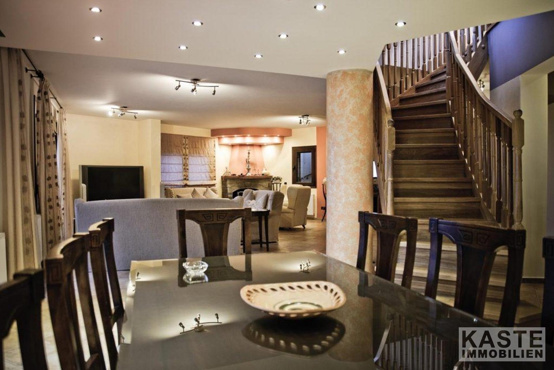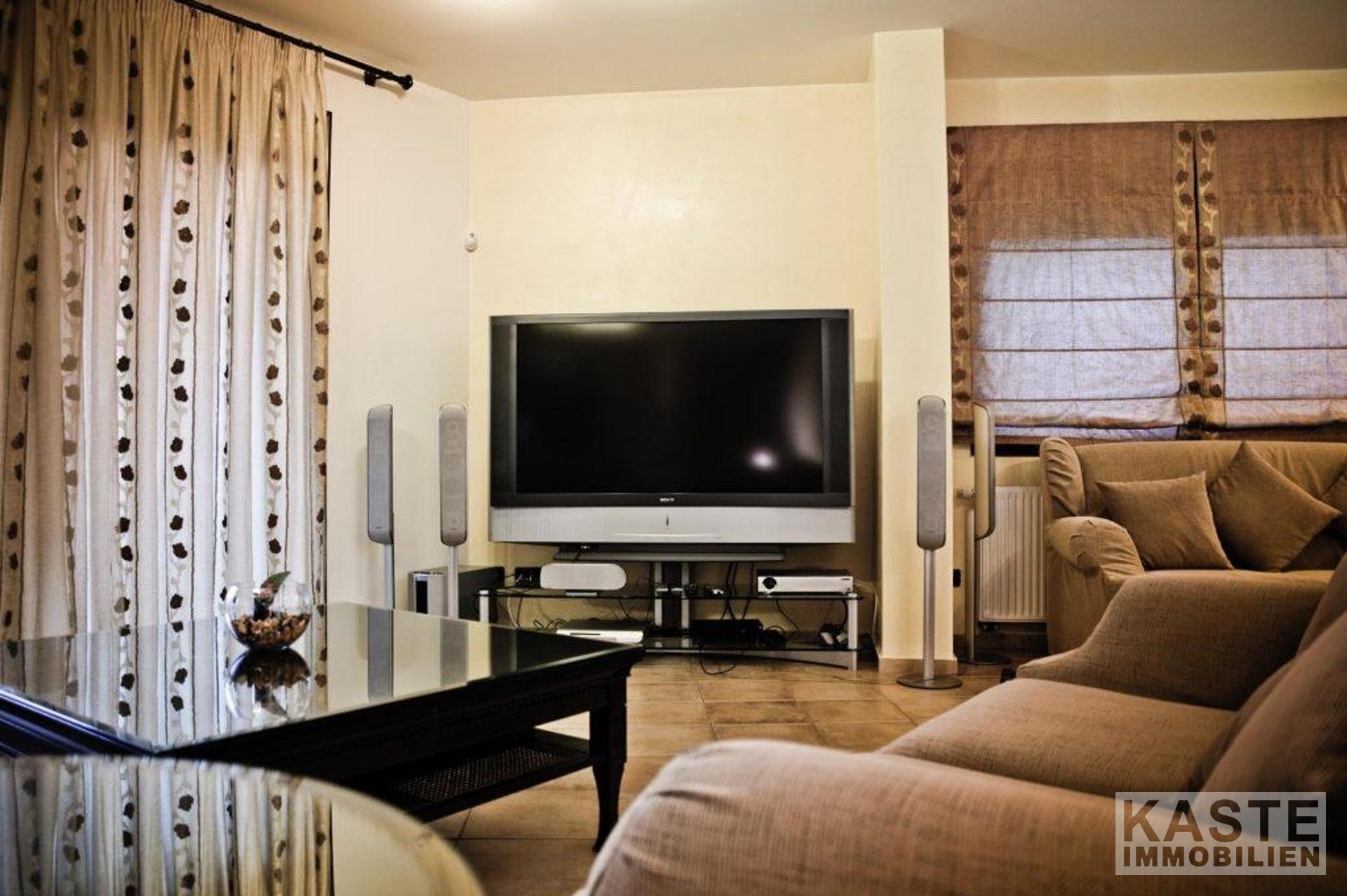 Im Erdgeschoss befindet sich ein offener Wohn- und Essbereich mit Kamin für eine harmonische Wohnatmosphäre. Ein Heimkinosystem steht Ihnen für spannende Filmabende mit Freunden und mit der Familie zur Verfügung. Die offene Küche ist mit allen technischen Geräten voll ausgestattet.