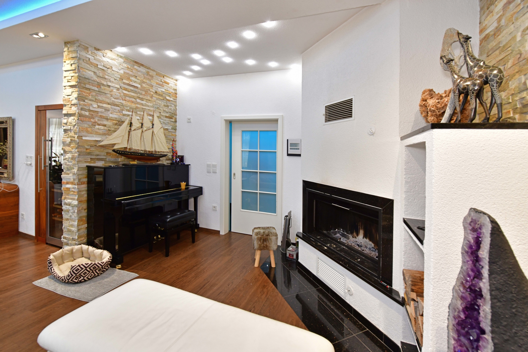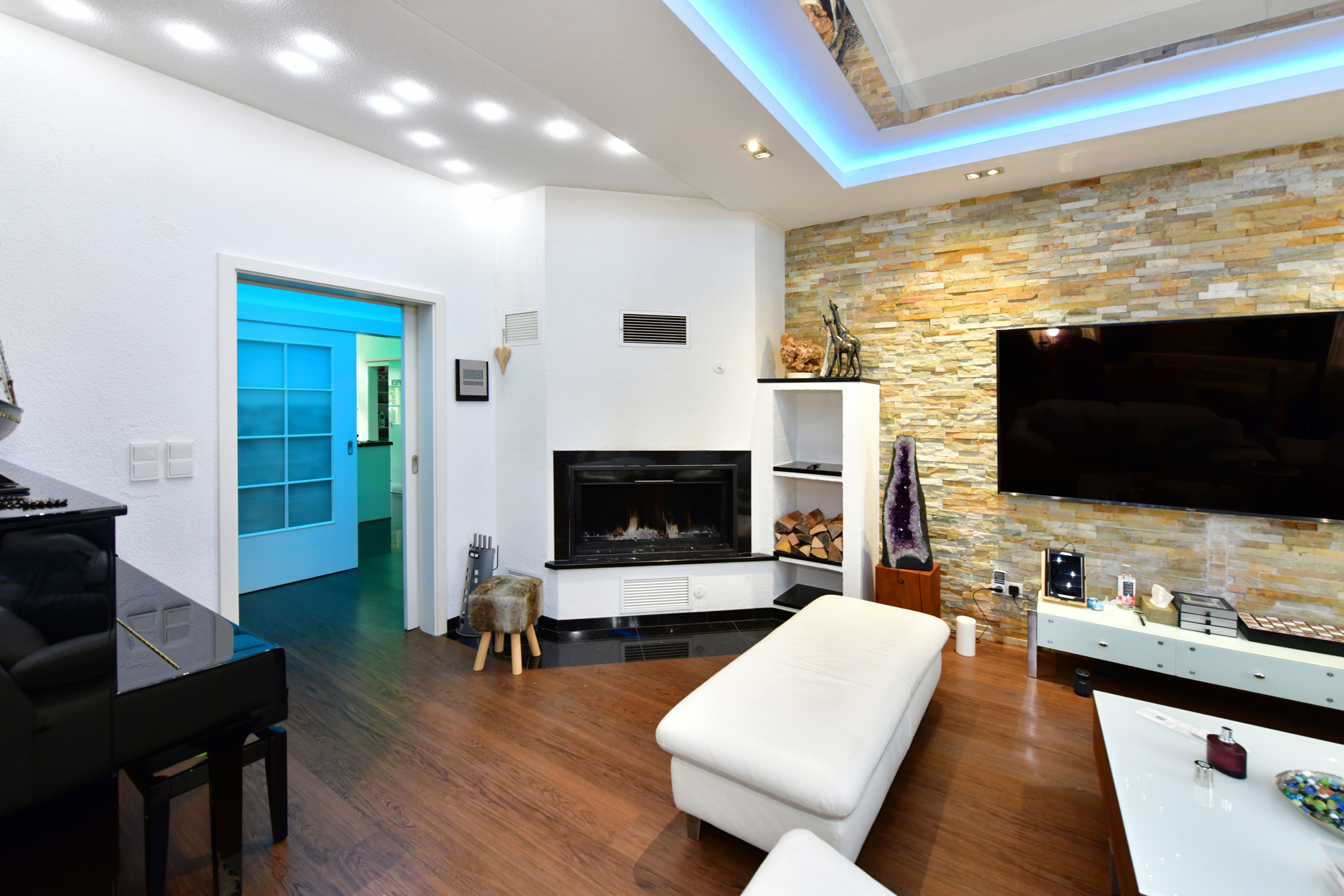 Der großzügige Wohn- und Essbereich mit offenem Kamin ist ein wahres Highlight. Auf rund 43 m² können Sie entspannen und gesellige Abende verbringen. Die edlen Natursteinwände und die abgehängte Decke mit hochwertiger LED-Beleuchtung – einstellbar in verschiedenen Farben und Helligkeitsstufen – schaffen eine gemütliche und angenehme Atmosphäre.