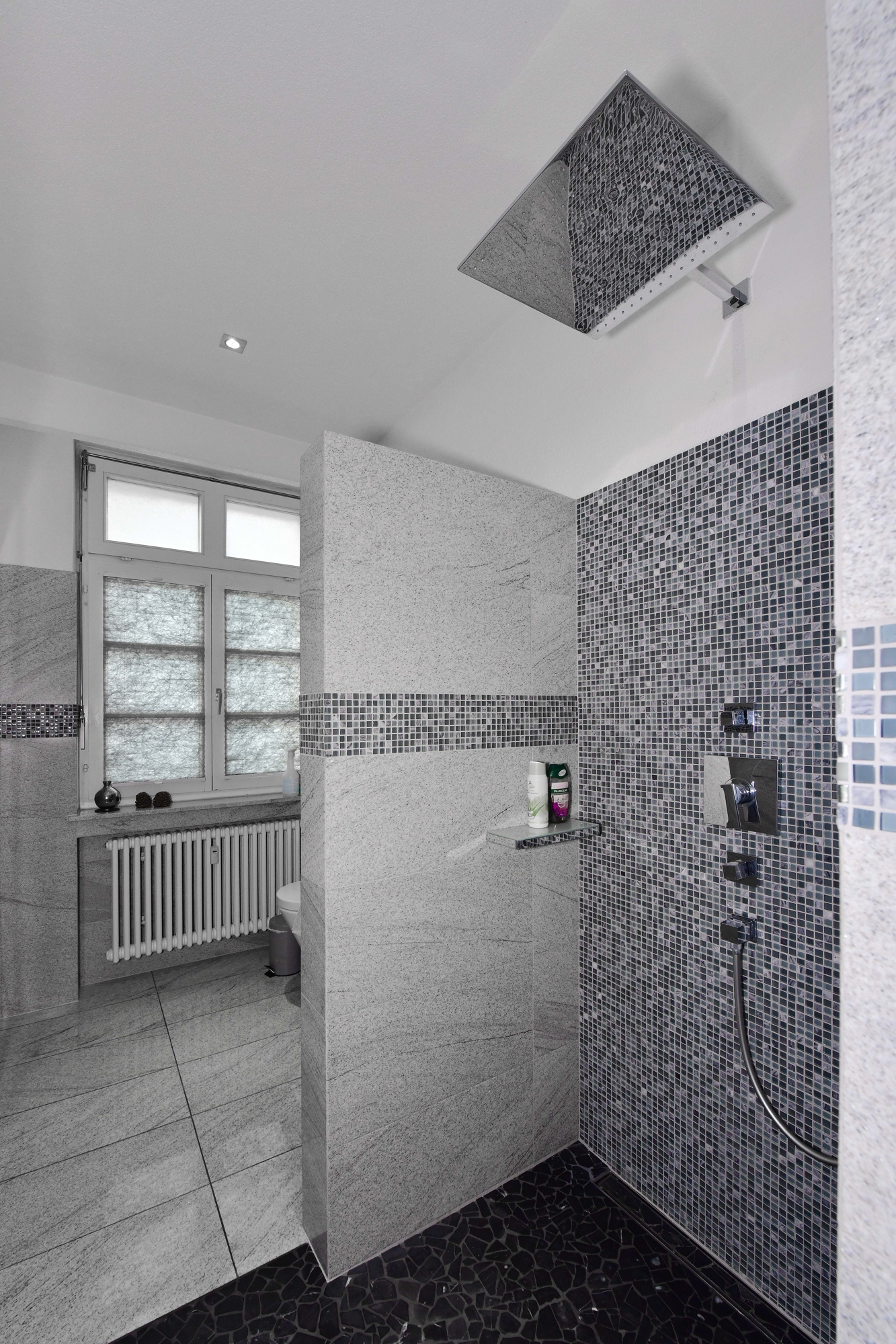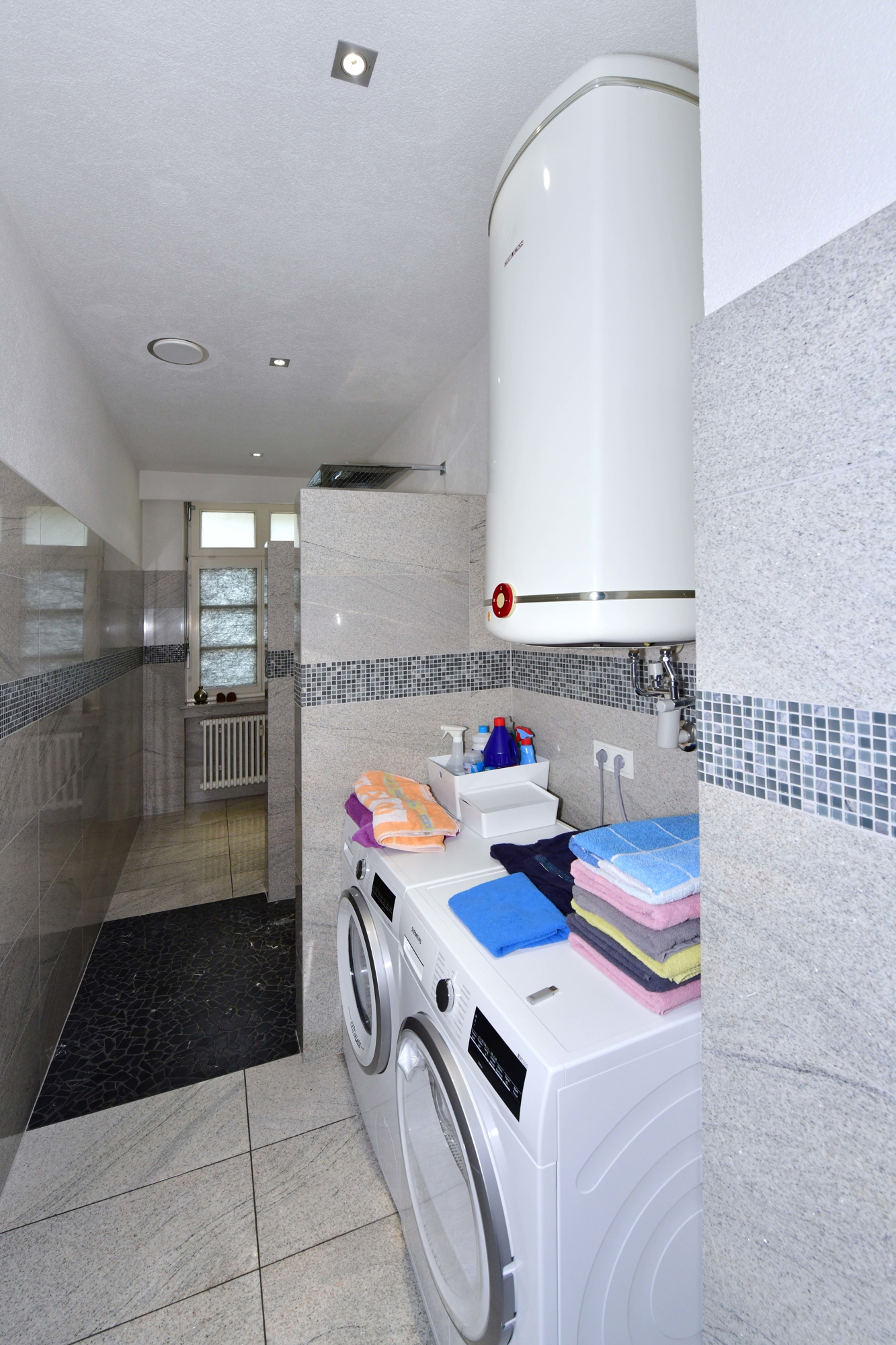 Das zweite Badezimmer ist ebenfalls mit einer bodengleichen Regen-Dusche und hochwertigen Granitfliesen ausgestattet. Es bietet zudem Platz für eine Waschmaschine und einen Trockner.