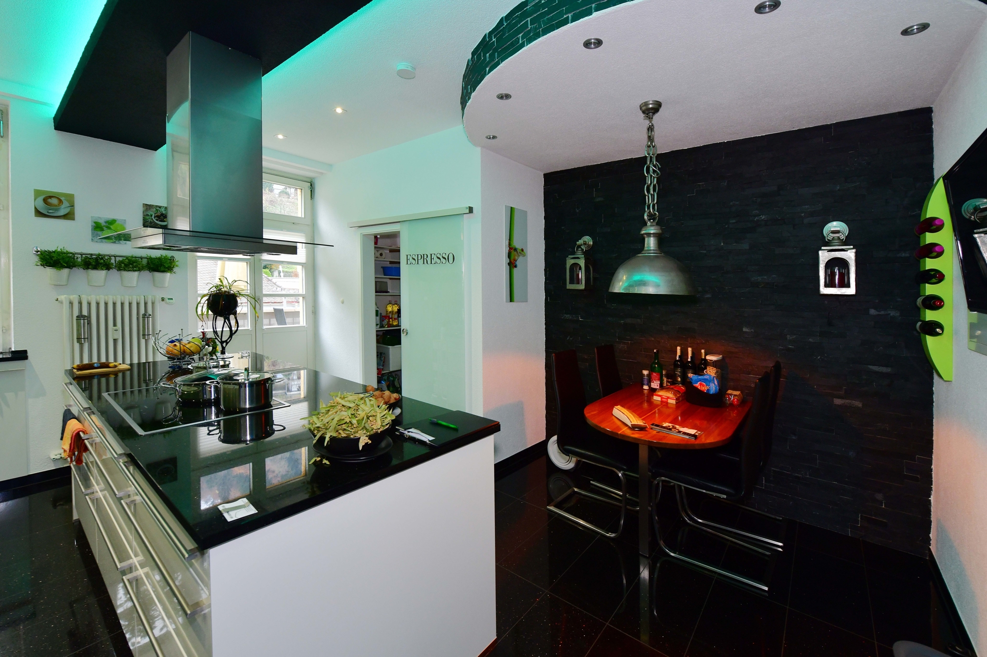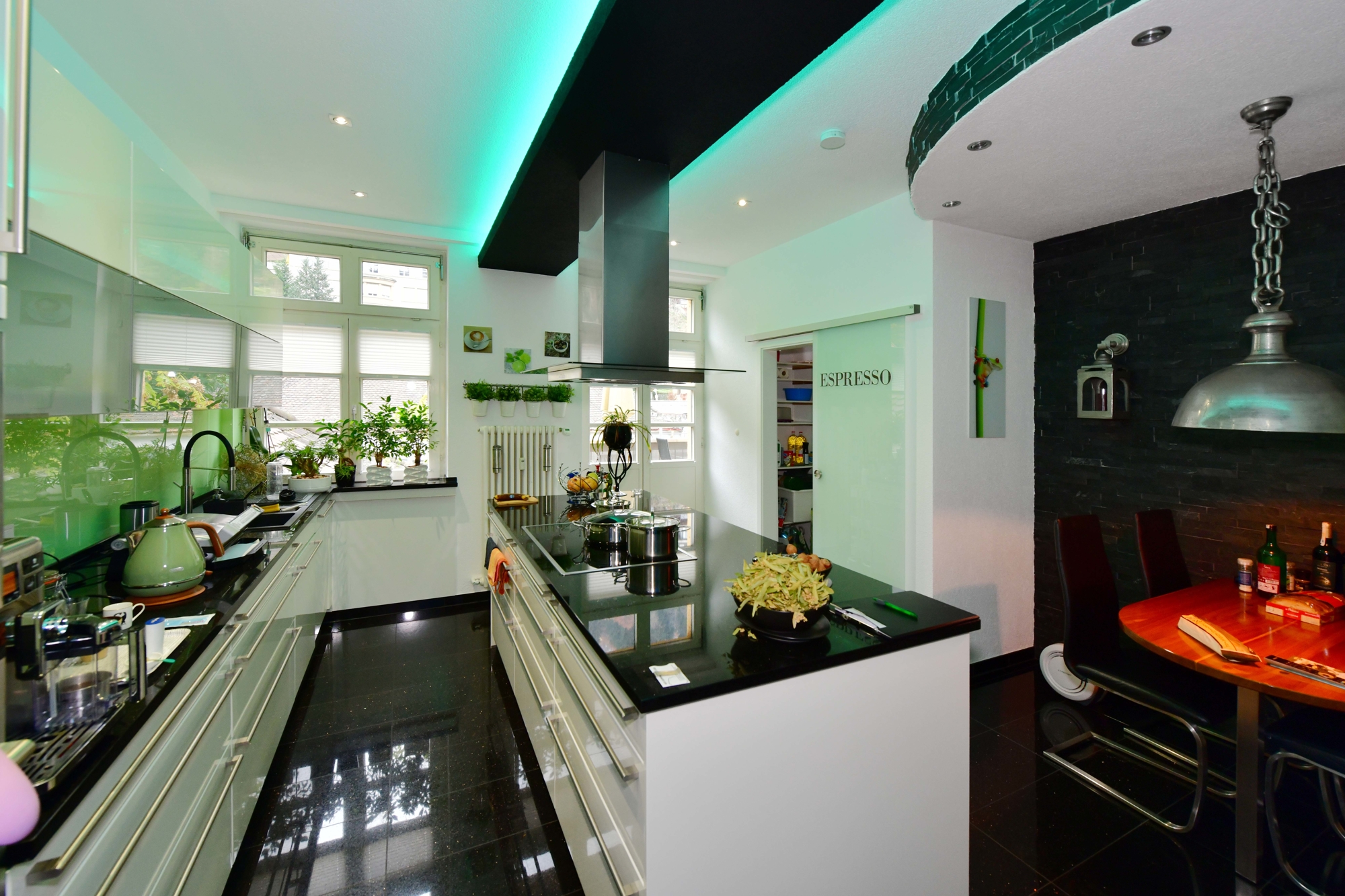 Design und Materialien: Edle Granitböden, maßgeschneiderte Schiebetüren und Zimmertüren, elegante LED-Beleuchtung, die das Ambiente der Wohnung verstärken