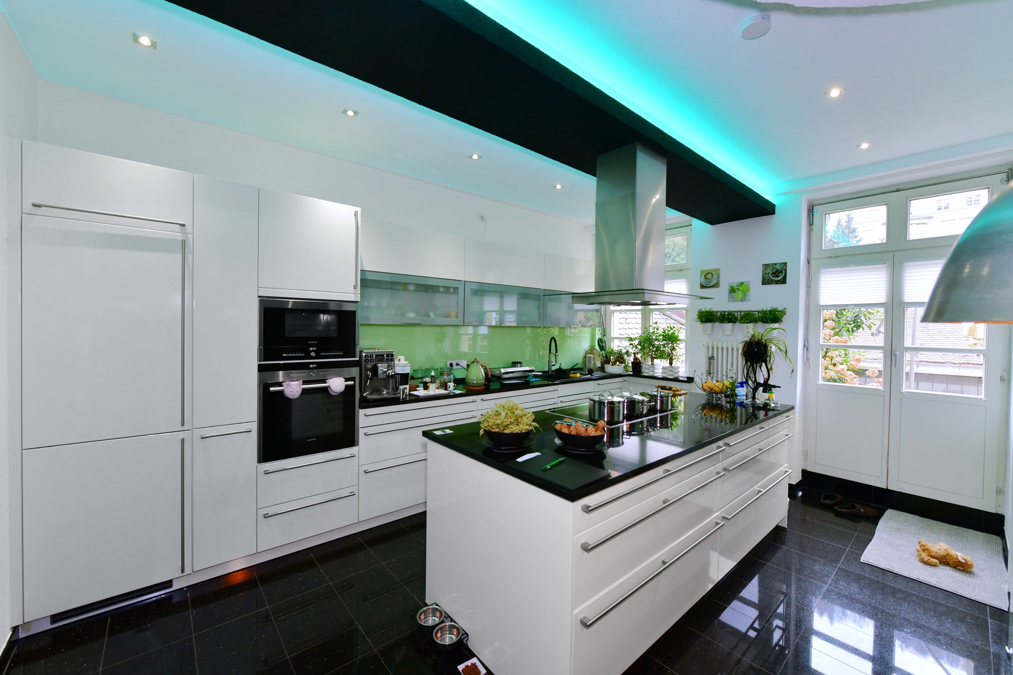Küche und Wohnbereich: Die moderne Einbauküche mit einer eleganten Kochinsel und Granit-Arbeitsplatten lässt keine Wünsche offen. Mit hochwertigen Geräten ausgestattet, bietet sie perfekten Raum für kulinarische Erlebnisse. Die Glasrückwand und die Hochglanzfliesen verleihen der Küche zusätzlichen Glanz, und der Zugang zum 27 m² großen Balkon mit Blick in den Innenhof sorgt für ein herrliches Ambiente.