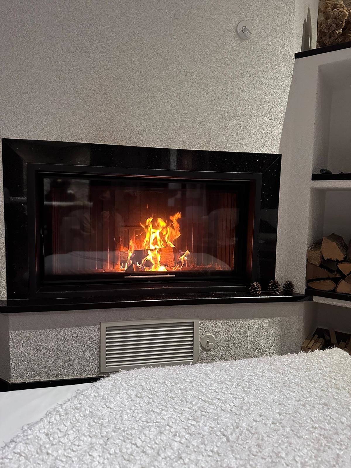 Wohnbereich: Offener Kamin und integrierter Weinkühlschrank im Wohn- und Essbereich