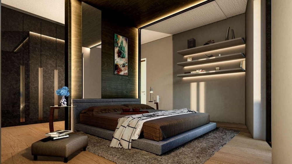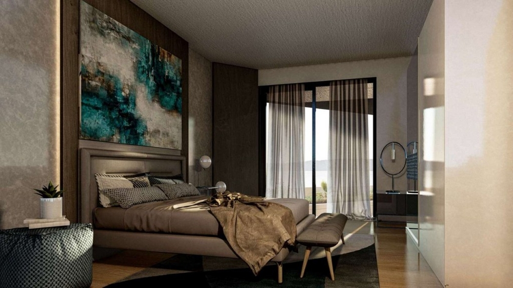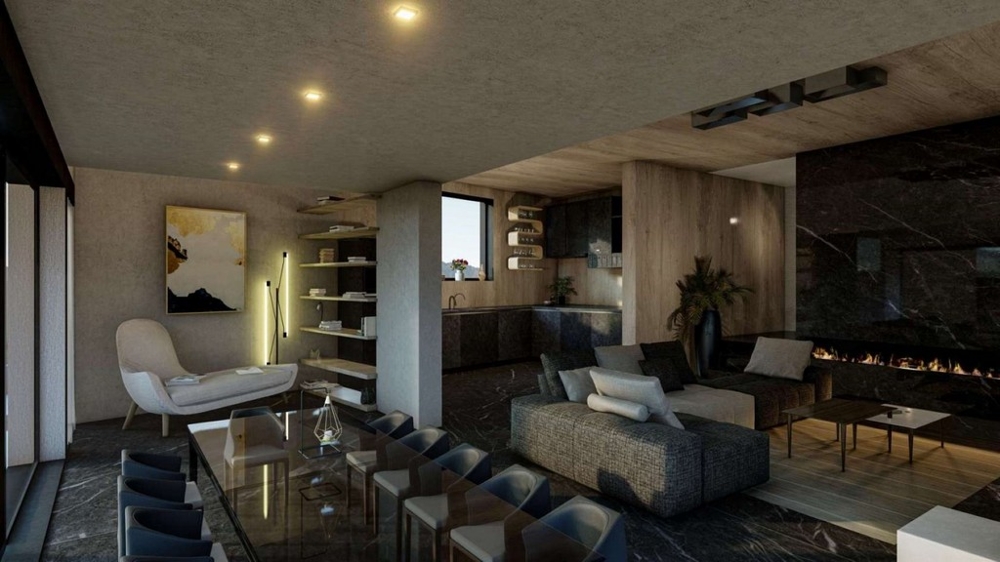 Die Wohnfläche erstreckt sich über großzügige 203 m² und umfasst ein Wohnzimmer mit Essbereich und Küche sowie vier Schlafzimmer, jeweils mit eigenem Badezimmer. Die Wohnung zeichnet sich durch überdachte Terrassen an drei Seiten aus.