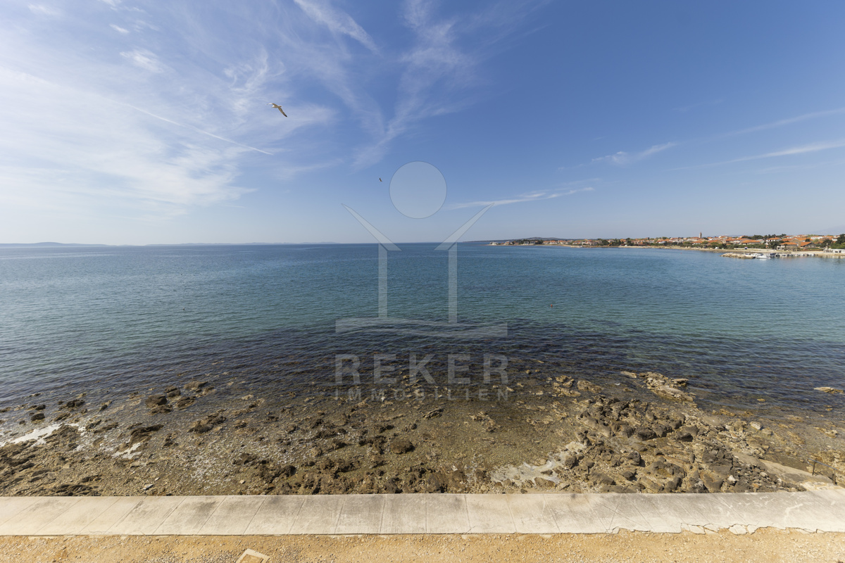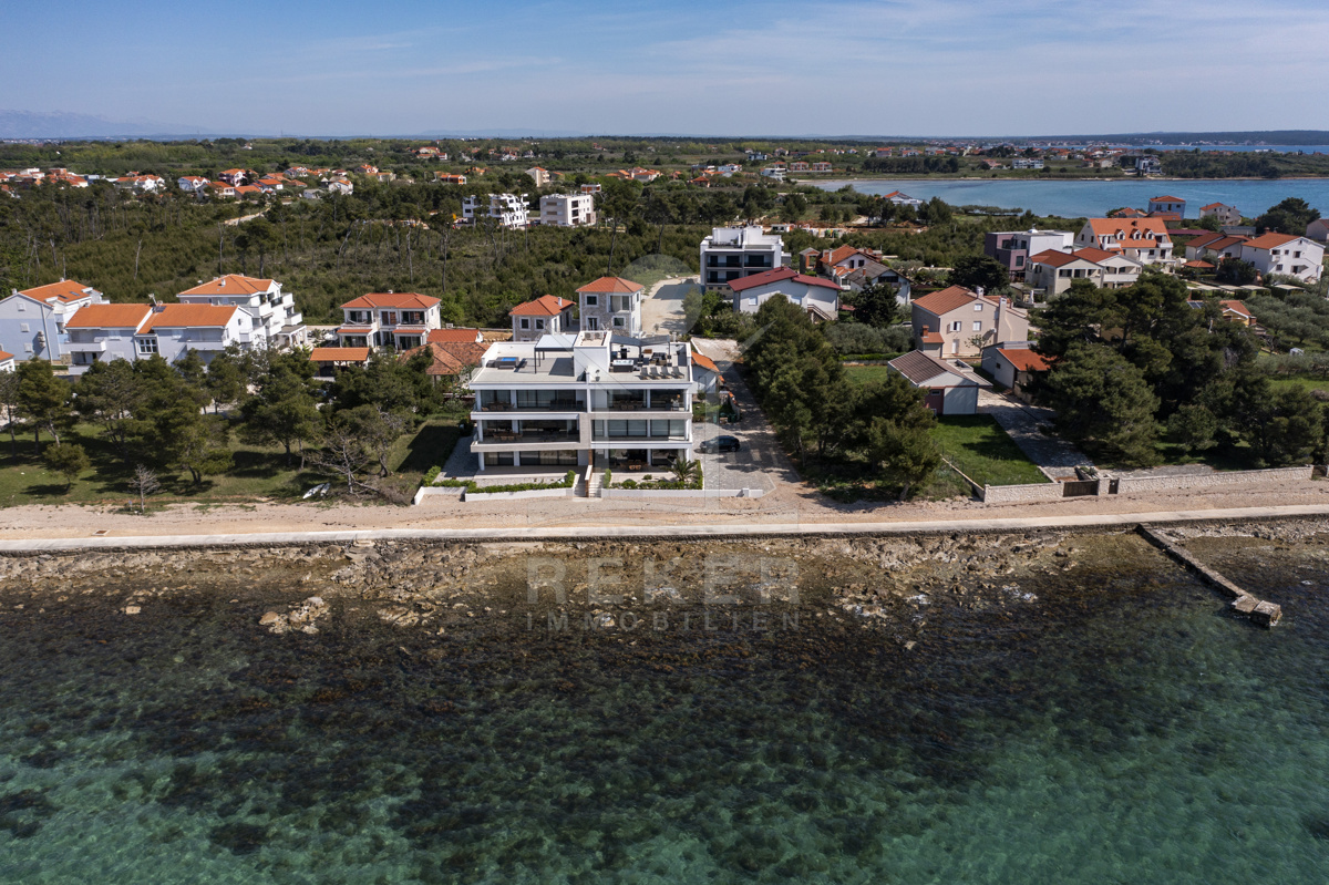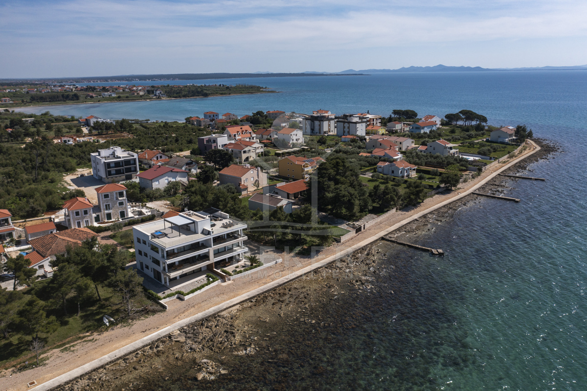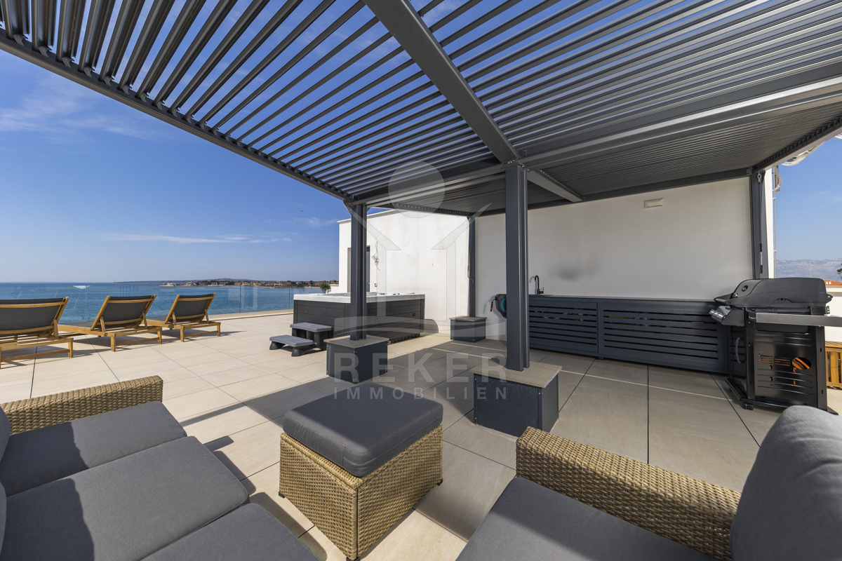 Nur fünf Meter vom Meer entfernt befindet sich dieses exklusive Penthouse in erster Reihe von Privlaka, einem der schönsten Küstenorte Norddalmatiens. Das moderne Gebäude steht direkt an der Uferpromenade, in ruhiger Umgebung, und verfügt über einen privaten Stellplatz (14,19 m²). Hier verbinden sich Meeresnähe und Wohnkomfort auf besondere Weise.