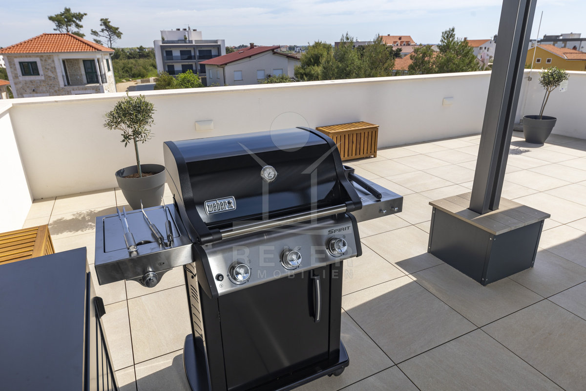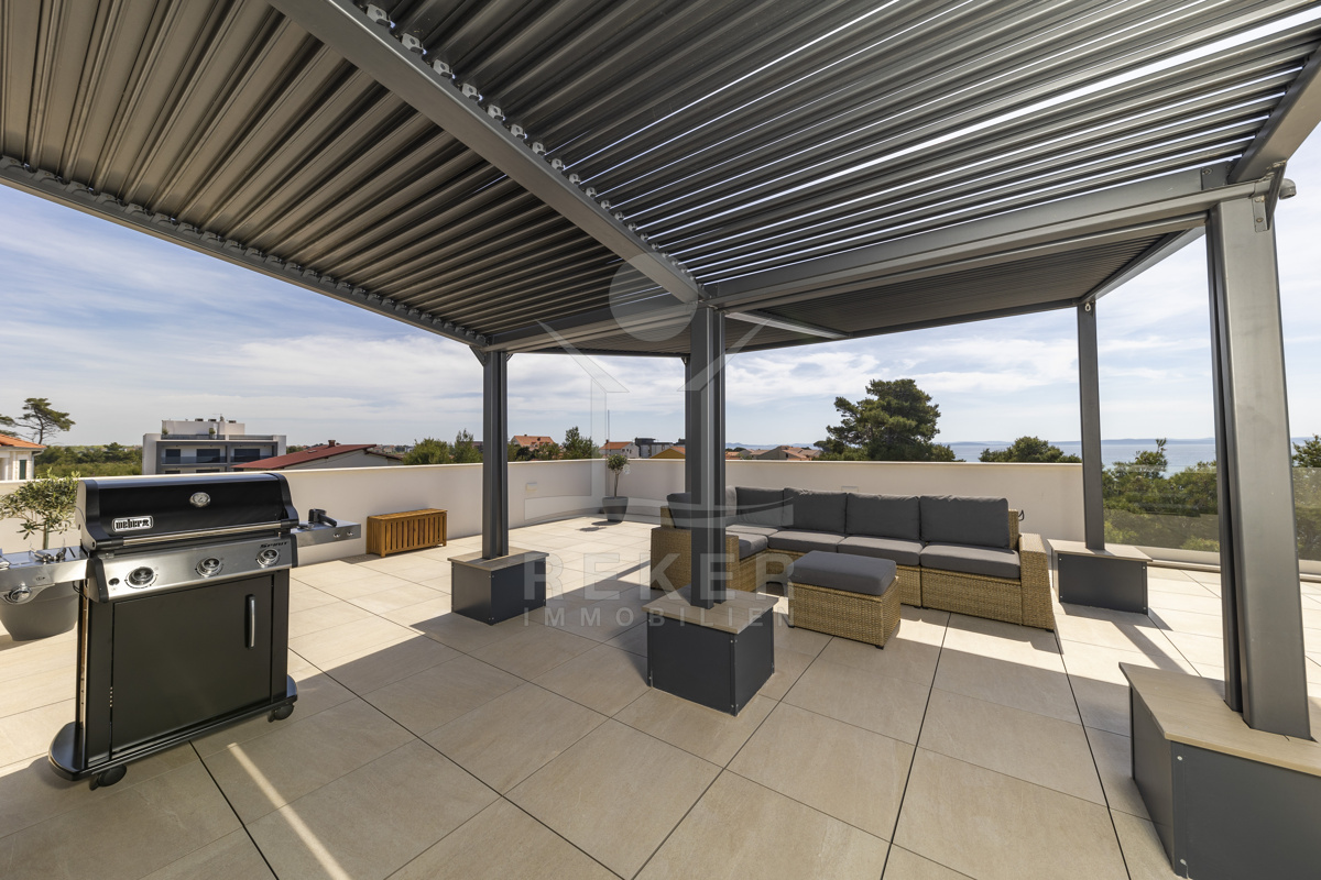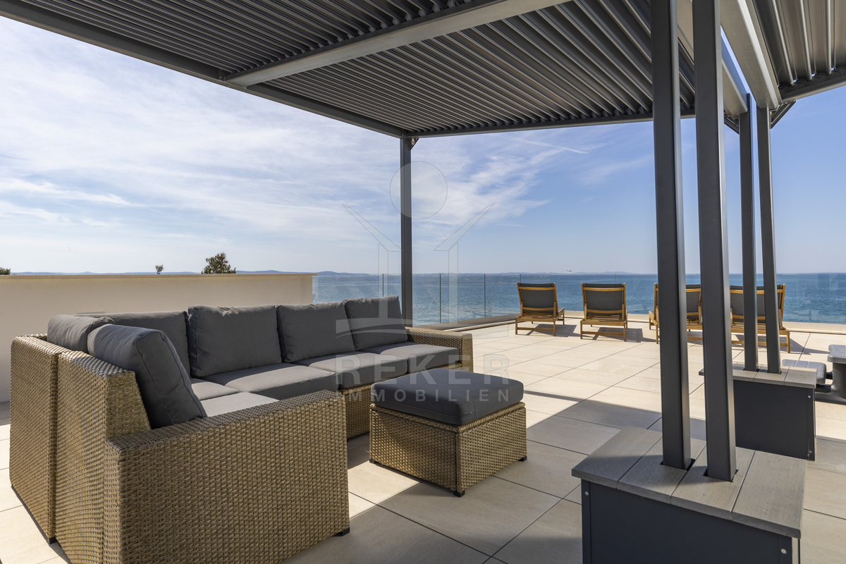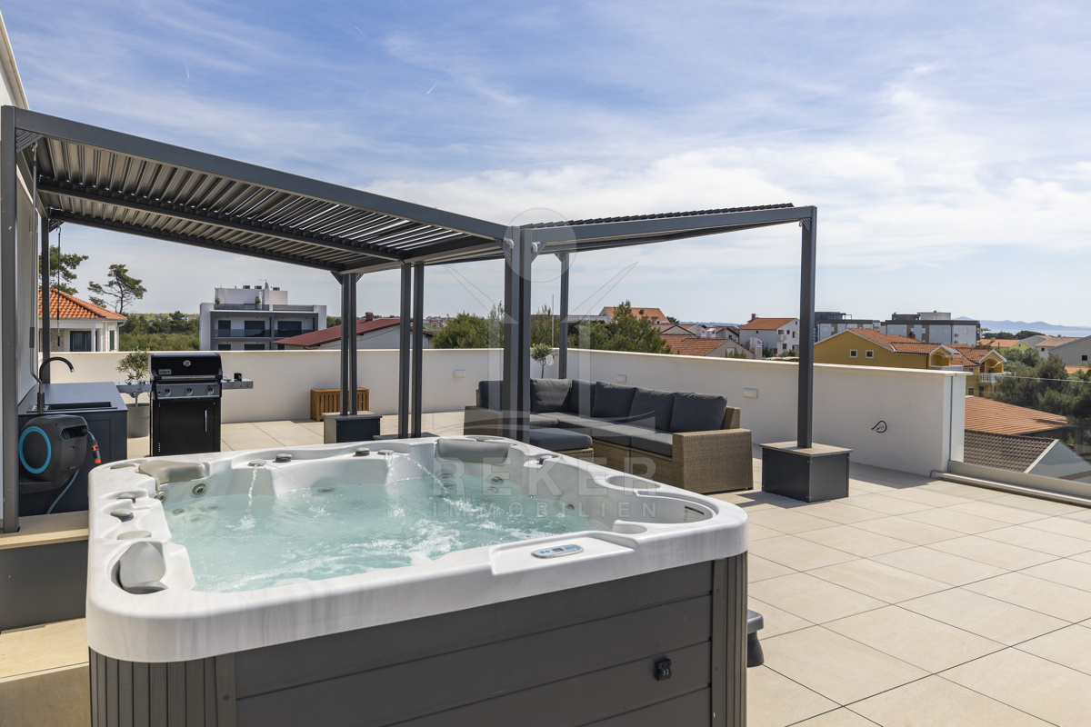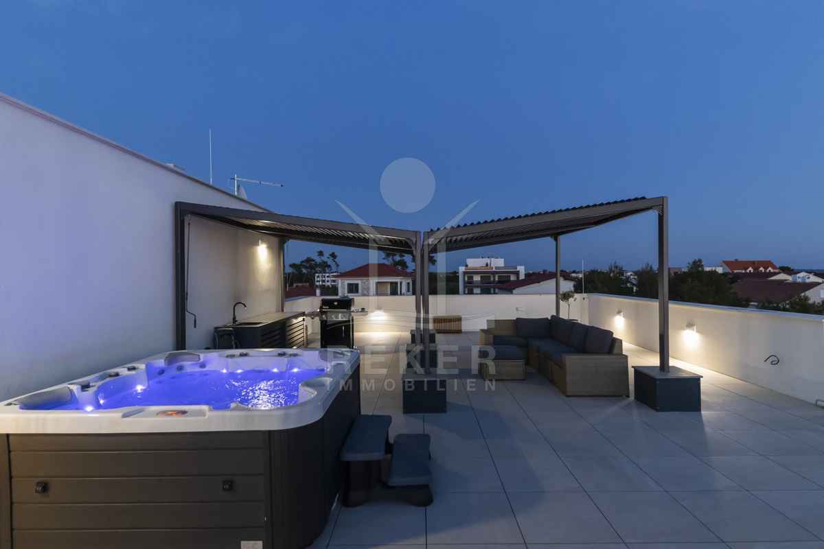 Morgens schwimmen, mittags auf der Terrasse entspannen, abends den Sonnenuntergang mit einem Glas Wein genießen … dieses Penthouse in Privlaka lässt mediterranen Lifestyle Wirklichkeit werden. Luxus, Meer und Ruhe in perfekter Balance.